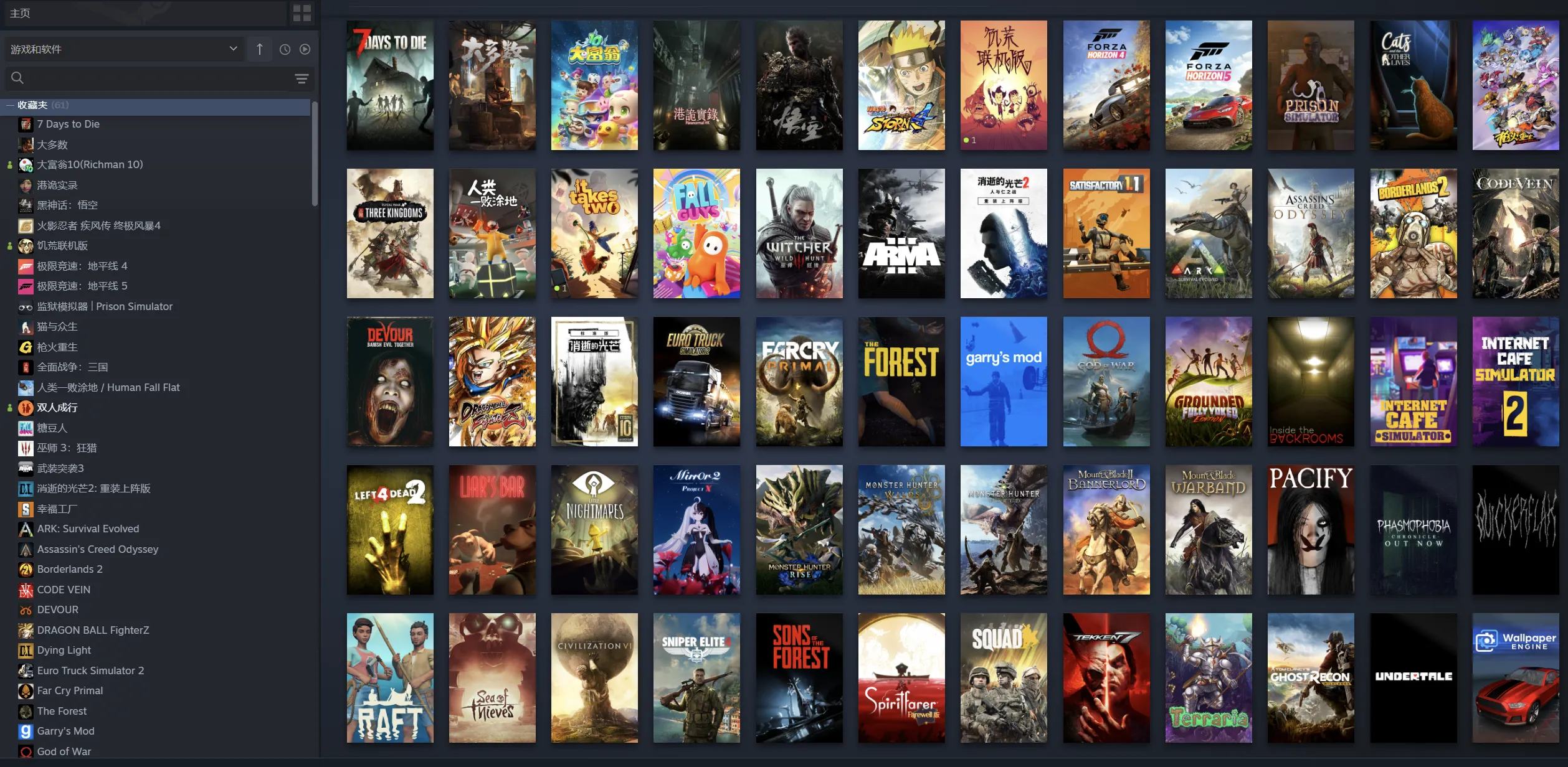 怪物猎人荒野(Monster Hunter Wilds)、骗子酒吧、黑神话悟空、森林之子/迷失森林2(Sons Of The Forest)、迷失森林(the forest)、打工模拟器/大多数(Nobody - The Turnaround)、消逝的光芒2人与仁之战(Dying Light 2)、战神4(God of War)、双人成行、全面战争三国(Total War: THREE KINGDOMS)、怪物猎人世界(Monster Hunter: World)、怪物猎人崛起(MONSTER HUNTER RISE)、大富翁10 (RichMan 10)、盗贼之海(Sea of Thieves)、深入后室(Inside The Backrooms)、求生之路2、佳慧、7日杀、绝地求生、传说之下(Undertale)、武装突袭3(Arma3)、枪火重生(Gunfire Reborn)、人类一败涂地、极限竞速:地平线 4/极限极速地平线4、极限竞速地平线5、糖豆人终极淘汰赛、禁闭求生(Grounded)、巫师3(The Witcher 3)、饥荒联机版(Don't Starve Together)、狙击英雄4(Sniper Elite 4)、壁纸引擎(Wallpaper Engine)、方舟生存进化(ARK: Survival Evolved)、泰拉瑞亚(Terraria)、欧洲卡车模拟2(Euro Truck Simulator 2)、盖瑞模组(Garry's Mod)、消逝的光芒信徒增强版(Dying Light Enhanced Edition)、木筏生存/木筏求生(Raft)、幸福工厂(Satisfactory)、刺客信条奥德赛(Assassin's Creed Odyssey)、荒野行动荒野(Tom Clancy's Ghost Recon® Wildlands)、孤岛惊魂:原始杀戮(Far Cry® Primal)、网-吧模拟器1,网-吧模拟器2/网咖模拟器2( Internet Cafe Simulator, Internet Cafe Simulator 2)、监狱模拟器(Prison Simulator)、魔镜2(Mirror 2: Project X)、吞噬(DEVOUR)、安抚(Pacify)、灵魂旅人Farewell版( 《Spiritfarer®》Farewell版)恐鬼症/幽灵恐怖(Phasmophobia)、骑马与砍杀1战团Mount and Blade: Warband,、骑马与砍杀2霸主 Mount & Blade II、又一个僵尸塔防高清版(Yet Another Zombie Defense HD)、无主之地2(Borderlands 2)、小小梦魇1(Little Nightmares)、铁拳7(TEKKEN 7)、猫与众生(Cats and the Other Lives)、文明6(Sid Meier's Civilization VI)、龙珠格斗Z(DRAGON BALL FighterZ)、噬血代码(CODE VEIN)、火影忍者疾风传终极风暴4(NARUTO SHIPPUDEN: Ultimate Ninja STORM 4)、鹅鸭杀