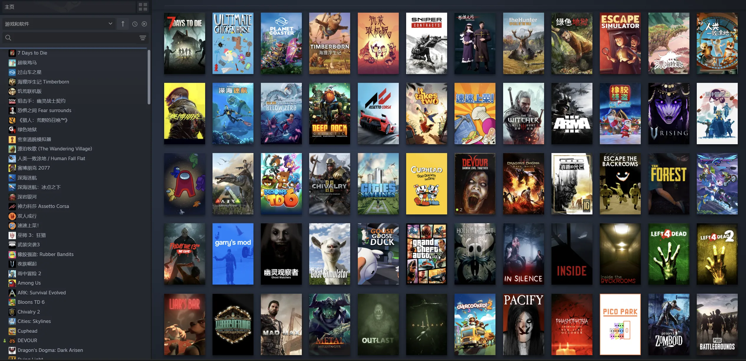 账号包含骗子酒吧、森林之子/迷失森林2(Sons Of The Forest)、赛博朋克2077、泰坦陨落(Titanfall® 2)、夜族崛起/吸血鬼起义/吸血鬼叛乱(V Rising/VRising)、寂静 In Silence、安抚 pacify、恐惧之间、饥荒 Don't Starve Together、伊松佐河、胡闹厨房/烹糊了(Overcooked! 2)、双人成行、丛林地狱/绿色地狱 green hell、人渣、迷失森林、消逝的光芒、武装突袭3、狙击手幽灵战士契约/狙击手:幽灵战士契约、狙击手:幽灵战士3/狙击手幽灵战士3、龙之信条: 黑暗崛起 Dragon's Dogma: Dark Arisen、人类一败涂地/面条人 Human Fall Flat、火焰审判 Trials of Fire、过山车之星、城市天际线/都市天际线、战锤2末世鼠疫/战锤末世鼠疫2、恐鬼症/恐惧之间(Phasmophobia)、吞噬(Devour)、木筏求生/木筏生存(Raft)、七日杀/7日杀(7 Days to Die)、盖瑞模组(Garry's Mod)、后室(Inside the Backrooms)、揍击派对(Pummel Party)、狙击精英4(Sniper Elite 4)、深岩银河(Deep Rock Galactic)、战术小队(Squad)、骑士精神2(Chivalry 2)、泰拉瑞亚(Terraria)、僵尸毁灭工程(Project Zomboid)、只狼影视二度(Sekiro: Shadows Die Twice)、空洞骑士(Hollow Knight)、深海迷航(Subnautica)、深海迷航冰点之下(Subnautica: Below Zero)、求生之路1,求生之路2(Left 4 Dead, Left 4 Dead 2)、大鹅模拟器/无名之鹅/捣蛋鹅(Untitled Goose Game)、超级鸡马(Ultimate Chicken Horse)、全面战争模拟器(Totally Accurate Battle Simulator)、神力科莎豪华版(Assetto Corsa Ultimate Edition)、史莱姆牧场(Slime Rancher)、在我们之间/太空狼人杀(Among Us)、气球塔防6(Bloons TD 6)、废品机械师(Scrap Mechanic)、13号星期五(Friday the 13th: The Game)、密室逃脱模拟器(Escape Simulator)、雨中冒险2虚空幸存者(Risk of Rain 2 - Survivors of the Void)、茶杯头(Cuphead)、逃生1(Outlast)、逃生2(Outlast 2)、永不孤单(Never Alone )、深入(INSIDE)、《消逝的光芒》决定版、猎人荒野的呼唤、自由星球2(Freedom Planet 2)、疯狂麦克斯(Mad Max)、幽灵观察者(Ghost Watchers)、方舟生存进化(ARK: Survival Evolved)、逃离后室(Escape the Backrooms)、零世代(Generation Zero)、重金属地狱歌手(Metal: Hellsinger)、漂泊牧歌 (The Wandering Village)、橡胶海盗(Rubber Bandits)、海狸浮生记(Timberborn)、废墟图书馆(Library Of Ruina)、山羊模拟器(Goat Simulator)、文明6(Sid Meier's Civilization VI)、速速上菜(PlateUp!)