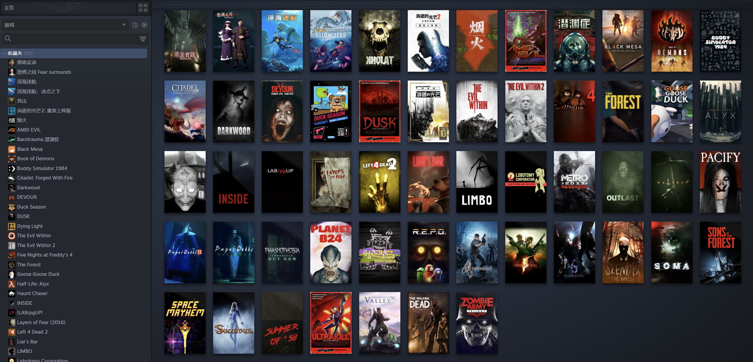 REPO、骗子酒吧、森林之子(Sons Of The Forest)、消逝的光芒2人与仁之战/消逝的光芒二(Dying Light 2 Stay Human)、烟火、生化危机4 Resident Evil 4 、生化危机5 Resident Evil 5、生化危机6、逃生1 Outlast、逃生2 ououtlast2、恐惧之间 Fear surrounds、迷失森林 The forest、纸人第1章、纸人第二章、恶魔之书、幽灵恐怖/恐鬼症/恐惧症、乌拉尔山/死山、吞噬(Devour)、安抚(pacify)、行尸走肉(The Walking Dead)、黑暗森林(Darkwood)、活体脑细胞(SOMA)、黑山(Black Mesa)、地铁2033(Metro 2033 Redux)、恶灵附身(The Evil Within)、僵尸三部曲(Zombie Army Trilogy)、玩具熊的午夜后宫4(Five Nights at Freddy's 4)、消逝的光芒加强版(Dying Light Enhanced Edition)、层层恐惧(Layers of Fea)、小马岛(Pony Island)、伙伴模拟器1984(Buddy Simulator 1984)、猎鸭季节(Duck Season)、Blue Isle Catalog、深入(INSIDE)、地狱边境(LIMBO)、邪恶之中(AMID EVIL)、黄昏(DUSK)、疯狂连杀(ULTRAKILL)、58年夏天(Summer of '58)、闹鬼追逐者(Haunt Chaser)、魅魔(SUCCUBUS)、潜渊症(Barotrauma)、恶灵附身(The Evil Within 2)、脑叶公司|模拟怪物管理(Lobotomy Corporation | Monster Management Simulation)、深海迷航零度之下(Subnautica: Below Zero)、深海迷航(Subnautica)、半条命艾利克斯/半条命爱莉克斯(Half-Life: Alyx)