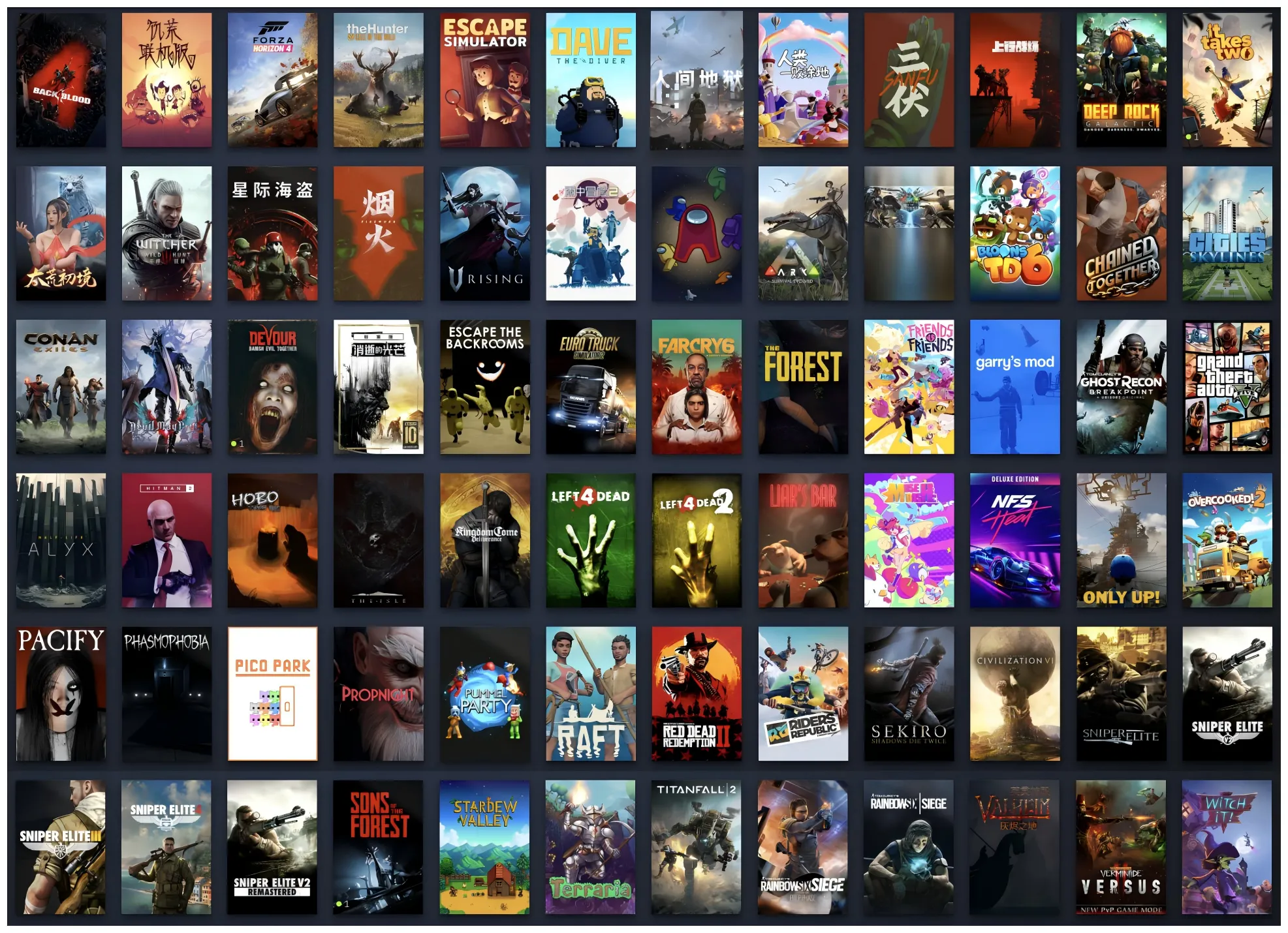 骗子酒吧、链在一起/共链冒险(Chained Together)、向上云端/只有UP/只有UP/OnlyUp!(Only Up!)、三伏、潜水员戴夫(DAVE THE DIVER)、孤岛惊魂6/远哭6(Far Cry 6)、极限国度(Riders Republic)、友尽对决(Friends vs Friends)、森林之子/迷失森林2(Sons Of The Forest)、GTA5(侠盗猎车手5)、双人成行(It Takes Two Friend's)、上行战场(The Ascent)、星际海盗、太荒初境、只狼影逝二度(Sekiro: Shadows Die Twice)、泰坦陨落(Titanfall® 2)、彩虹六号围攻(Tom Clancy's Rainbow Six Siege)、夜族崛起/吸血鬼起义/吸血鬼叛乱(V Rising/VRising)、魔女猎杀者/女巫来了(Witch It)、乞丐模拟器、恐龙岛/岛(the isle)、人间地狱/地狱人间 hell let loose、杀手2 hitman、雨中冒险 2+虚空幸存者、鬼泣5(Devil May Cry 5 + Vergil)、盖瑞模组/Gmod(Garry's Mod)、巫师3年度版、幽灵恐怖、天国:拯救、求生之路2、猫公园(pico park)、安抚(Pacify)、饥荒联机版(Don't Starve Together)、七日杀/7日杀(7 Days to Die)、消逝的光芒增加版(Dying Light Enhanced Edition)、泰拉瑞亚(Terraria)、半条命ALYX/半条命艾利克斯(Half-Life: Alyx)、生存木筏/木筏求生(Raft)、迷失森林/森林(The Forest)、吞噬(DEVOUR)、方舟生存进化(ARK: Survival Evolved)、深岩银河(Deep Rock Galactic)、战锤米日鼠疫2(Warhammer: Vermintide 2)、气球塔防6(Bloons TD 6)、人渣(SCUM)、在我们之间/太空狼人杀(Among Us)、欧洲卡车模拟2(Euro Truck Simulator 2)、胡闹厨房2/烹糊了2(Overcooked! 2)、人类一败涂地(Human: Fall Flat)、揍击派对(Pummel Party)、密室逃脱模拟器(Escape Simulator)、英灵神殿/瓦尔海姆(Valheim)、文明6豪华版(Sid Meier's Civilization VI )、道具夜/道具之夜(Propnight)、使命召唤黑色行动3(Call of Duty®: Black Ops III)、城市天际线(Cities: Skylines)、绝地求生大逃杀 (PLAYERUNKNOWN'S BATTLEGROUNDS)、极品飞车21热力豪华版(Need for Speed™ Heat Deluxe Edition)、他们的土地(Their Land)、逃离后室(Escape the Backrooms)、幽灵行动断点(Tom Clancy's Ghost Recon® Breakpoint)、星露谷物语(Stardew Valley)、荒野猎人的呼唤(theHunter: Call of the Wild™)、野蛮人柯南(Conan Exiles)、烟火、狙击精英1、狙击精英2、狙击精英3、狙击精英4、极限竞速地平线4、喋血复仇(Back 4 Blood)、求生之路1