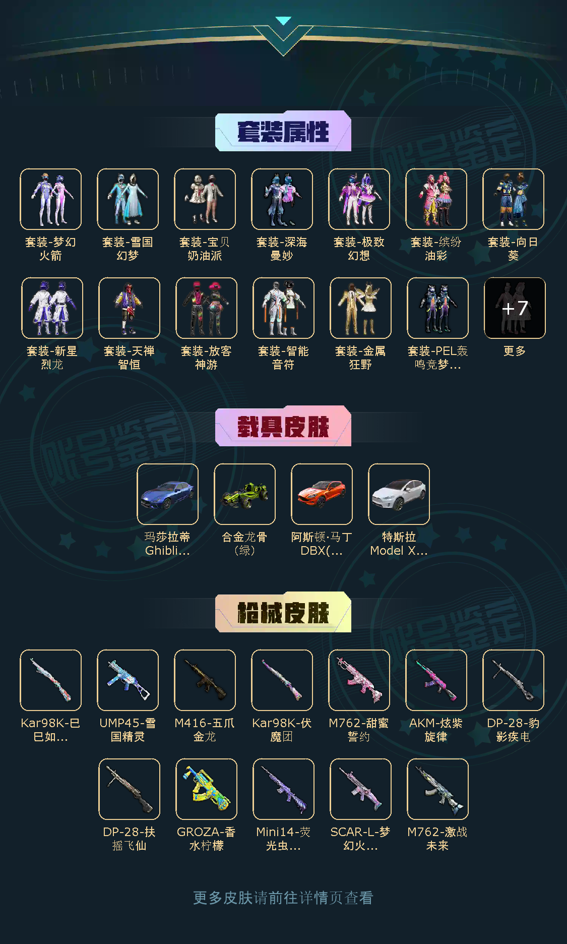 20粉,4载具,10特效枪,245套装,4王牌印记 DP-28-扶摇飞仙/SCAR-L-梦幻火箭/Kar98K-伏魔团/M762-激战未来/GROZA-香水柠檬/Mini14-荧光虫舞/M416-五爪金龙/AKM-炫紫旋律/UMP45-雪国精灵/M762-甜蜜誓约/阿斯顿·马丁DBX(橙)/特斯拉Model X(珍珠白)/玛莎拉蒂Ghibli(蓝)/合金龙骨(绿)