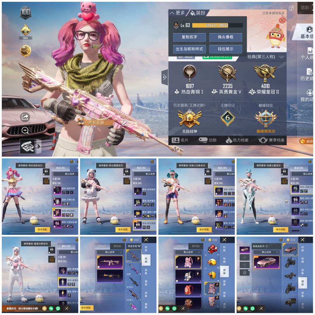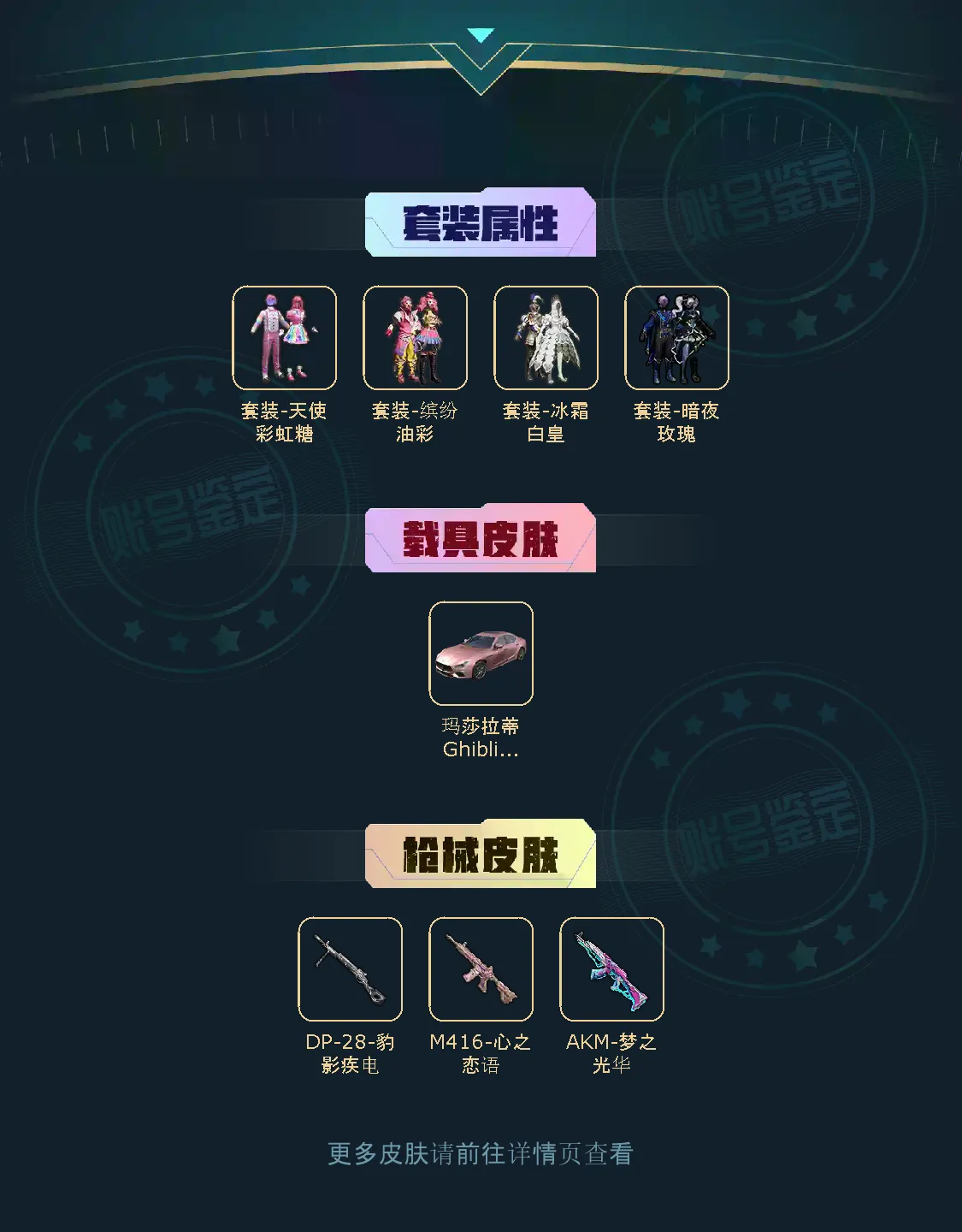 4粉,1载具,3特效枪,114套装,13王牌印记 M416-心之恋语/AKM-梦之光华/玛莎拉蒂Ghibli(粉)