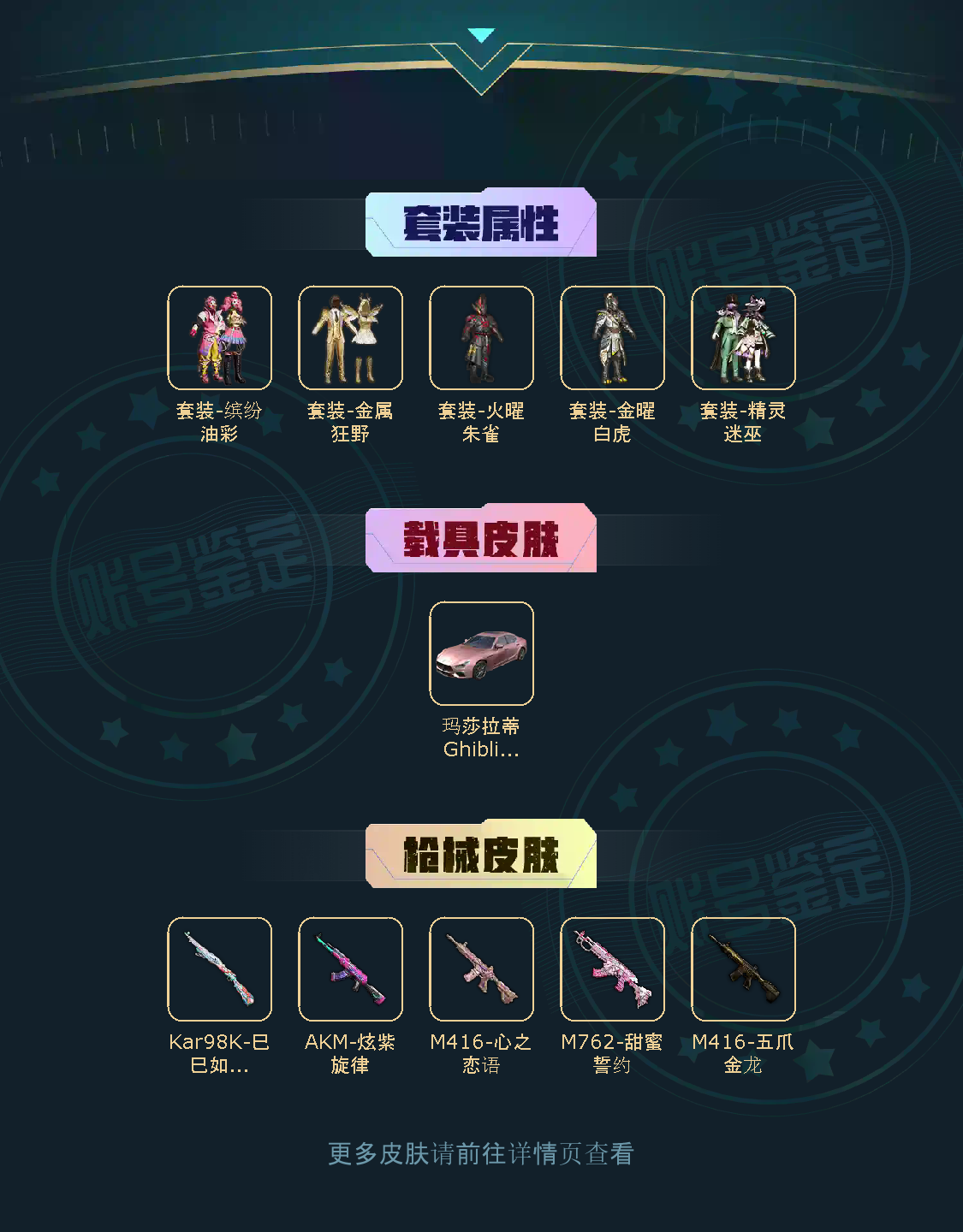5粉,1载具,5特效枪,126套装,8王牌印记 M416-心之恋语/M416-五爪金龙/AKM-炫紫旋律/M762-甜蜜誓约/玛莎拉蒂Ghibli(粉)