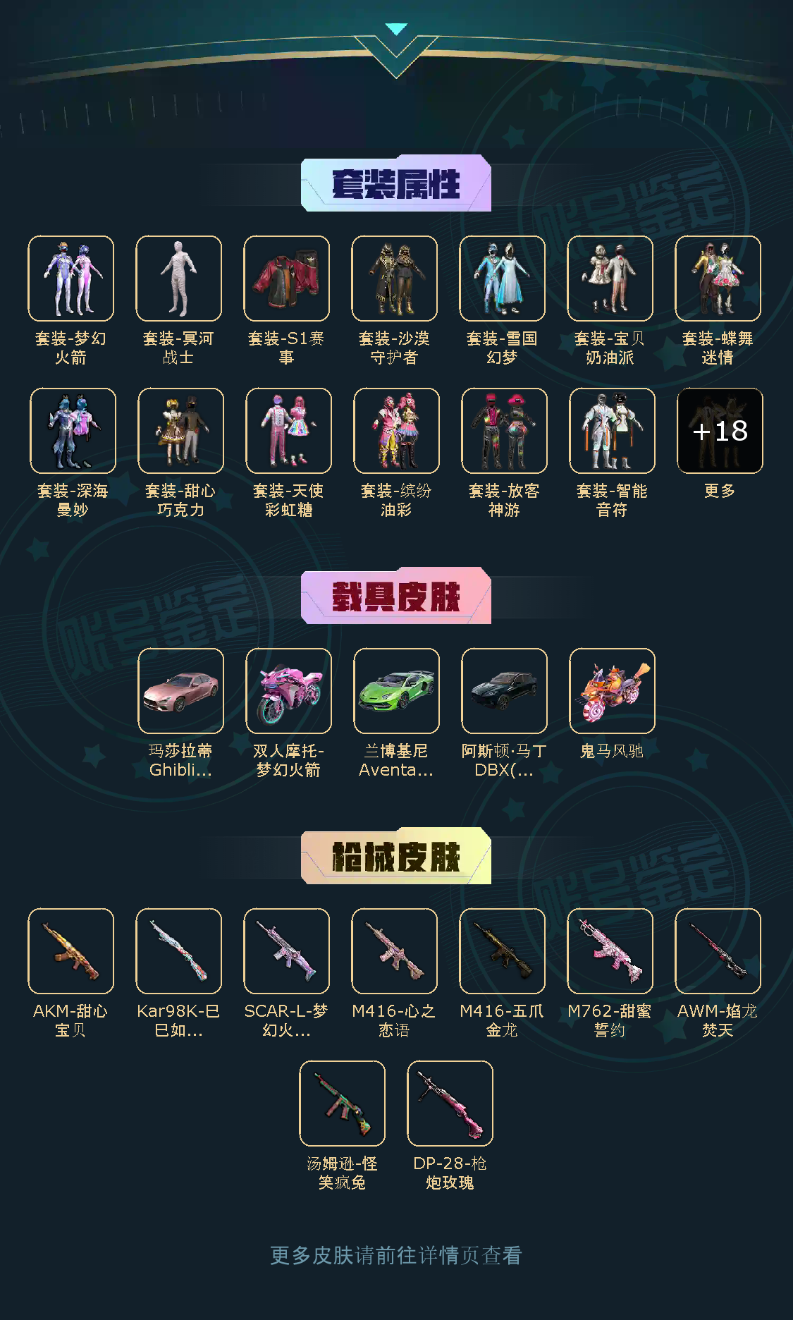 28粉,5载具,9特效枪,287套装,21王牌印记 AKM-甜心宝贝/SCAR-L-梦幻火箭/汤姆逊-怪笑疯兔/AWM-焰龙焚天/M416-心之恋语/M416-五爪金龙/DP-28-枪炮玫瑰/M762-甜蜜誓约/兰博基尼Aventador(翡翠绿)/双人摩托-梦幻火箭/鬼马风驰/玛莎拉蒂Ghibli(粉)/阿斯顿·马丁DBX(蓝)
