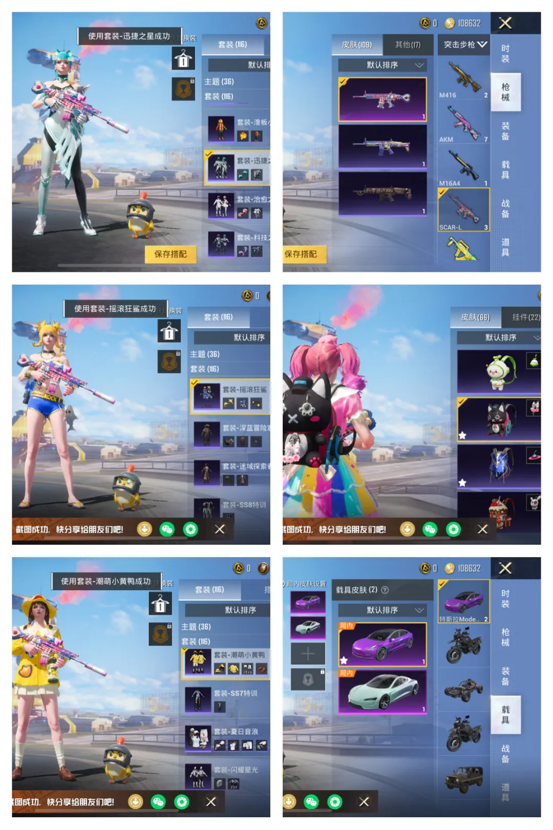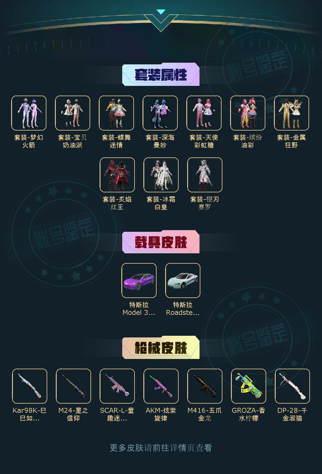 10粉,2载具,7特效枪,188套装,9王牌印记 SCAR-L-童趣迷兔/GROZA-香水柠檬/M416-五爪金龙/AKM-炫紫旋律/M24-星之信仰/特斯拉Model 3(奇幻紫)/特斯拉Roadster(水滴蓝)
