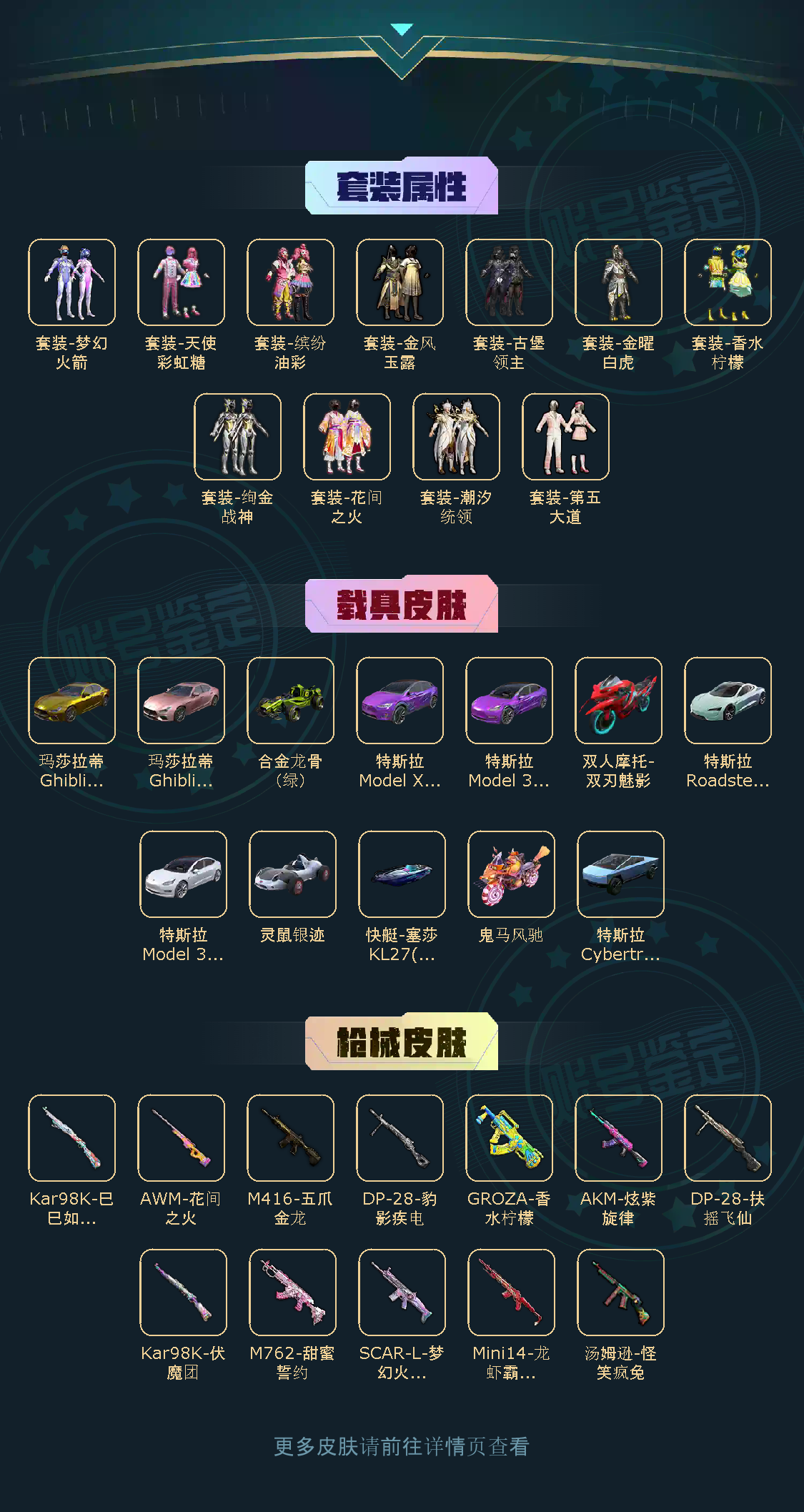 11粉,12载具,11特效枪,210套装,13王牌印记 DP-28-扶摇飞仙/SCAR-L-梦幻火箭/Kar98K-伏魔团/AWM-花间之火/汤姆逊-怪笑疯兔/GROZA-香水柠檬/M416-五爪金龙/AKM-炫紫旋律/M762-甜蜜誓约/Mini14-龙虾霸霸/玛莎拉蒂Ghibli(金)/特斯拉Model 3(珍珠白)/特斯拉Model X(奇幻紫)/特斯拉Cybertruck(荒芜蓝)/快艇-塞莎KL27(深潜蓝)/双人摩托-双刃魅影(红)/灵鼠银迹/特斯拉Model 3(奇幻紫)/合金龙骨(绿)/特斯拉Roadster(水滴蓝)/鬼马风驰/玛莎拉蒂Ghibli(粉)