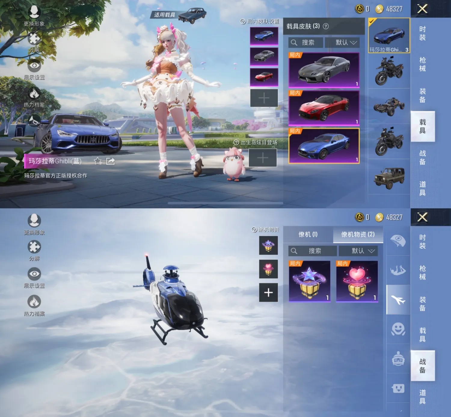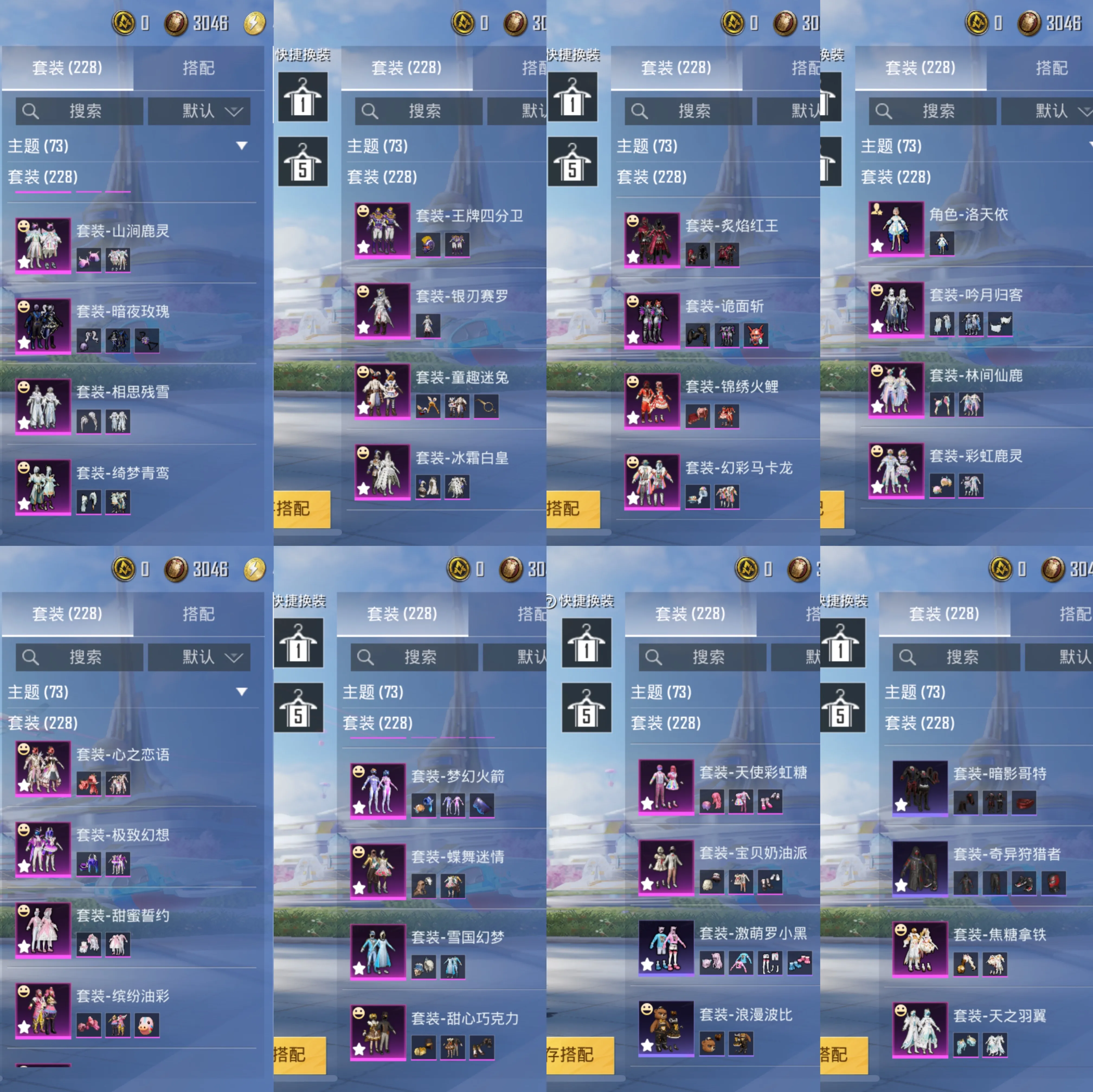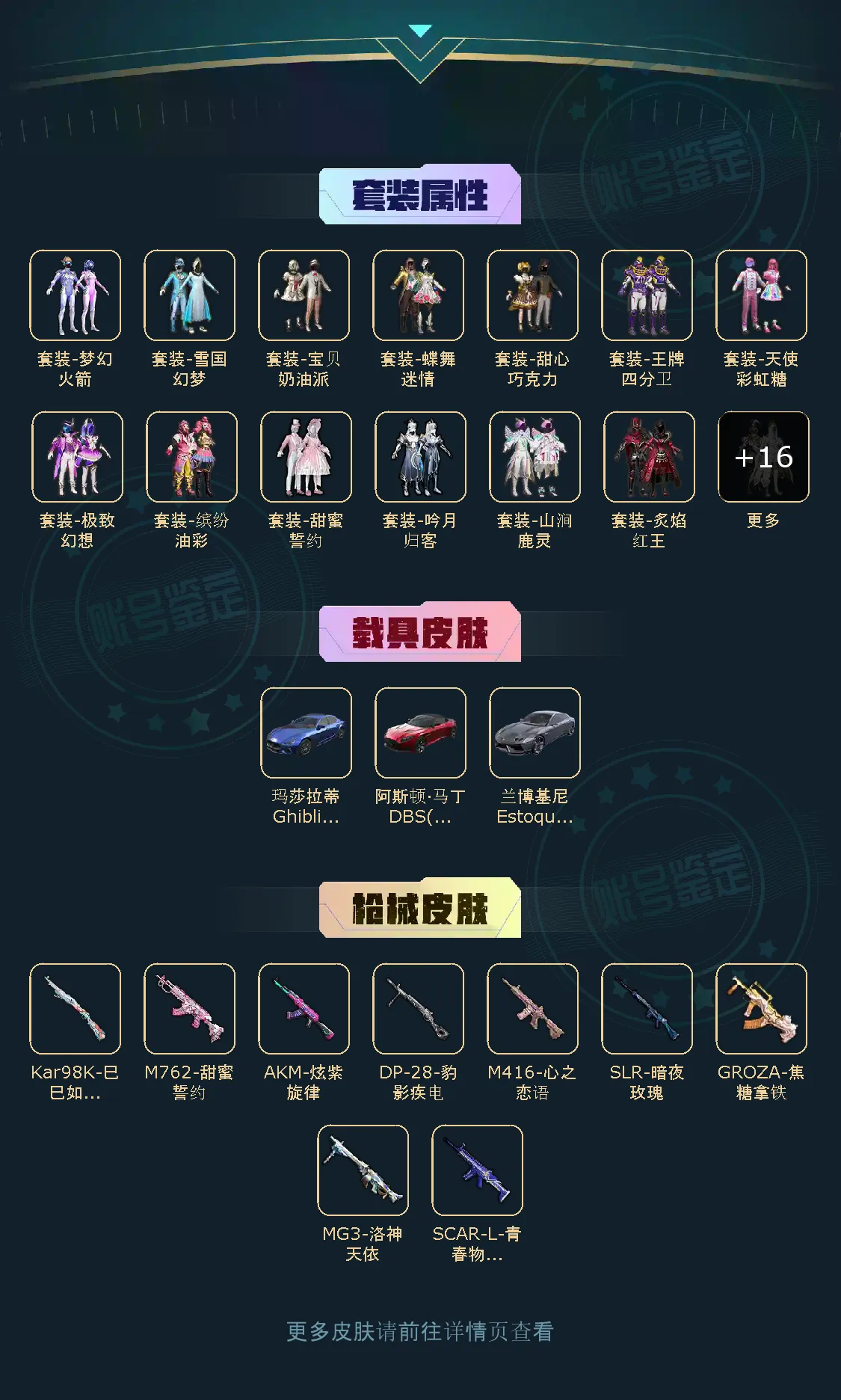 车皮:阿斯顿马丁红 玛莎拉蒂蓝 兰博基尼银翼灰 套装: 绮梦青鸾 焦糖拿铁 天之羽翼 洛天依 吟月归客 林间仙鹿 彩虹鹿灵 山涧鹿灵 暗夜玫瑰 相思残雪 王牌四分卫 银刃赛罗 童趣迷兔 冰霜白皇 炙焰红王 诡面斩 锦绣火鲤 幻彩马卡龙 心之恋语 极致幻想 甜蜜誓约 缤纷油彩 梦幻火箭 蝶舞迷情 雪国梦幻 甜心巧克力 天使彩虹糖 宝贝奶油派 激萌罗小黑 浪漫波比 胖达圆圆 胖达团团 爱崽白熊 深海小丑鱼 暗影哥特 奇异狩猎者 枪皮:AKM-炫紫旋律级 M762-甜蜜誓约级 M1476-心之恋语级 SLR-暗夜玫瑰级 MG3-洛神天依级 GROZA-焦糖拿铁级 SCAR-L-青春物语级