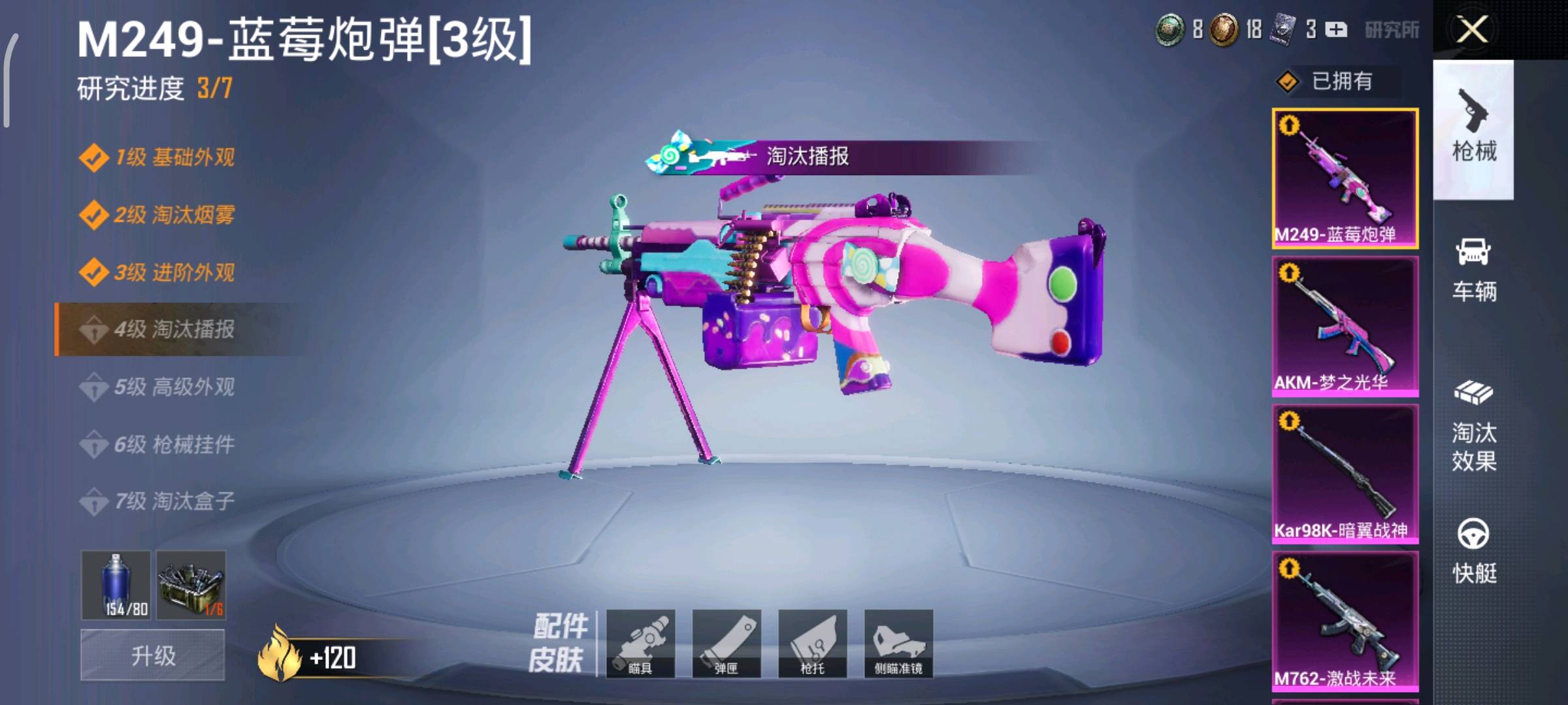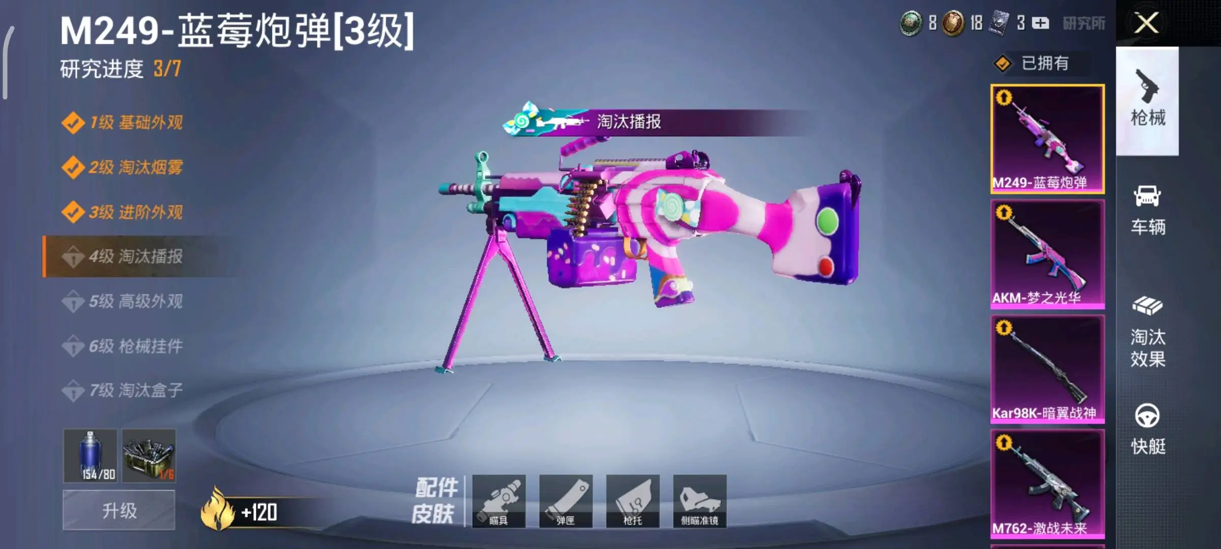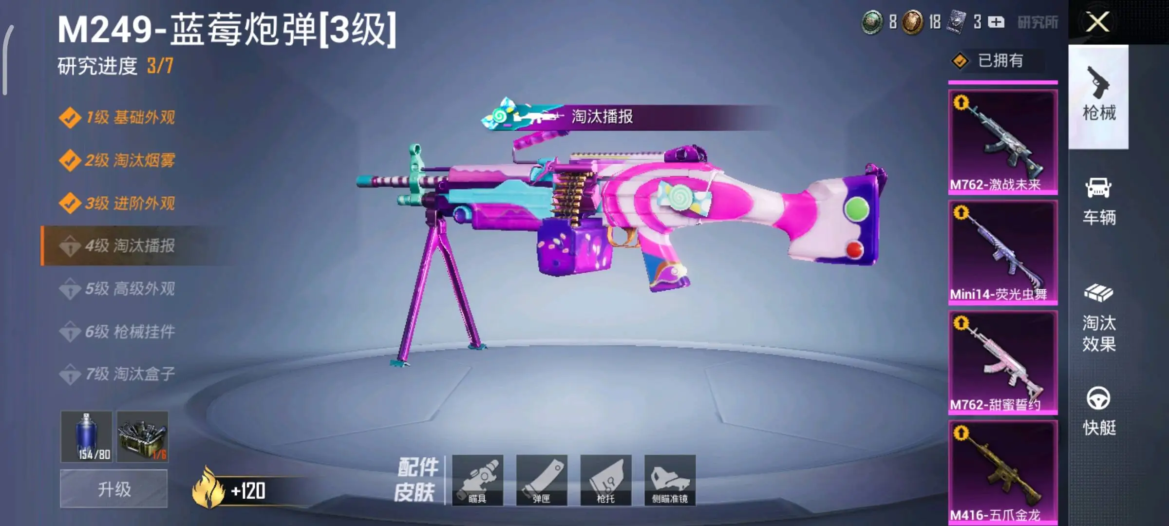 枪械❤️m249蓝莓炮弹❤️mini荧光虫舞❤️m762甜蜜誓约❤️m416五爪金龙❤️akm梦之光华❤️98k暗翼战神❤️m762激战未来