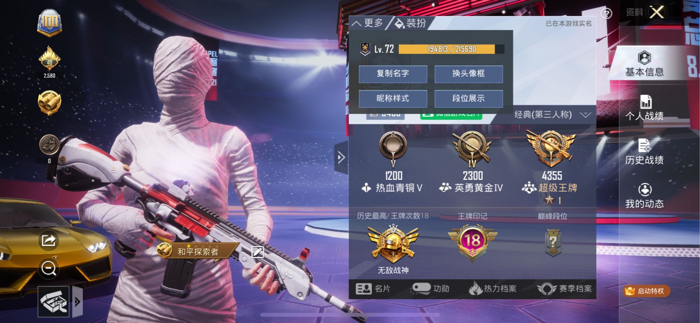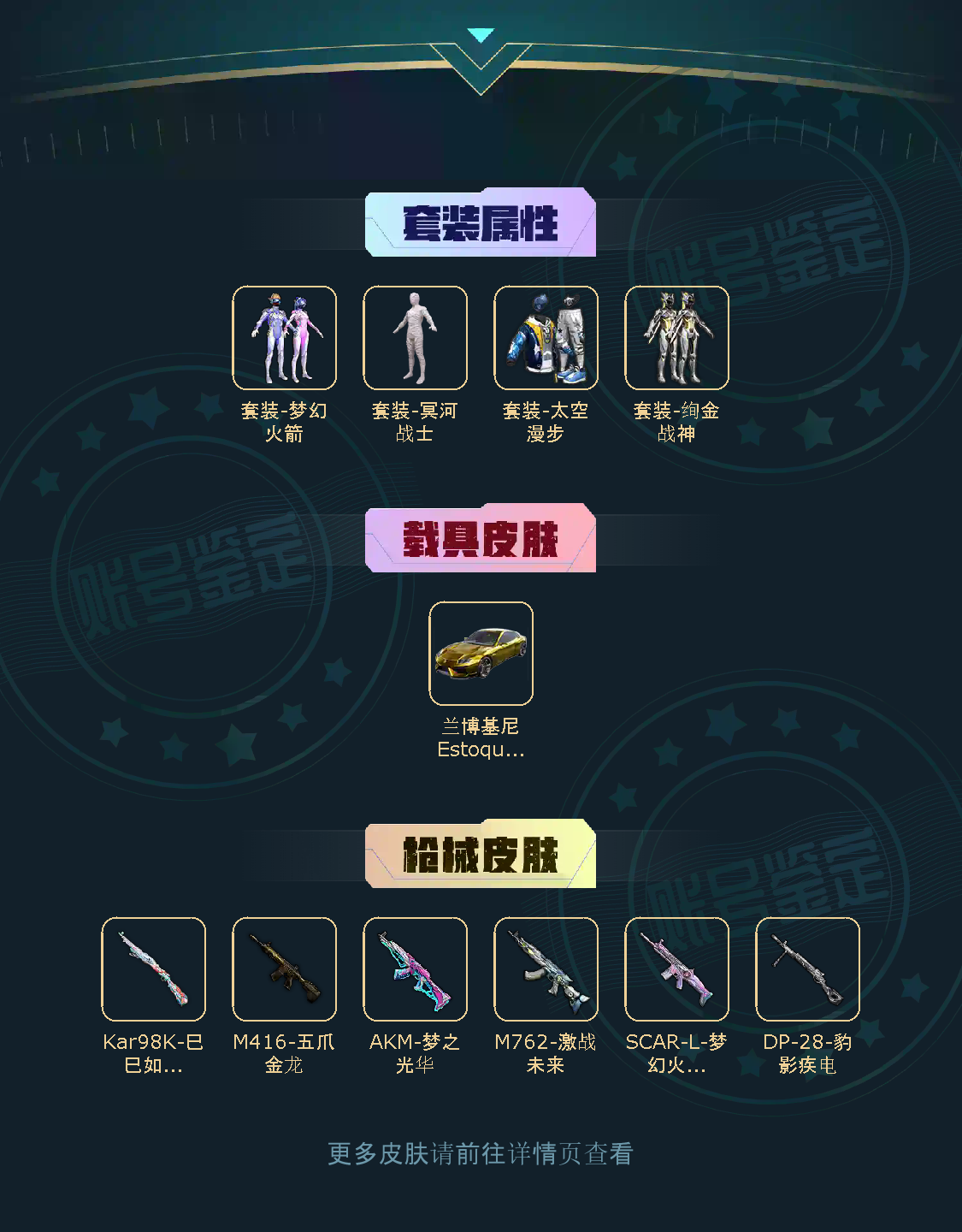 2粉,1载具,5特效枪,143套装,21王牌印记 SCAR-L-梦幻火箭/M762-激战未来/M416-五爪金龙/AKM-梦之光华/兰博基尼Estoque(炫光金)