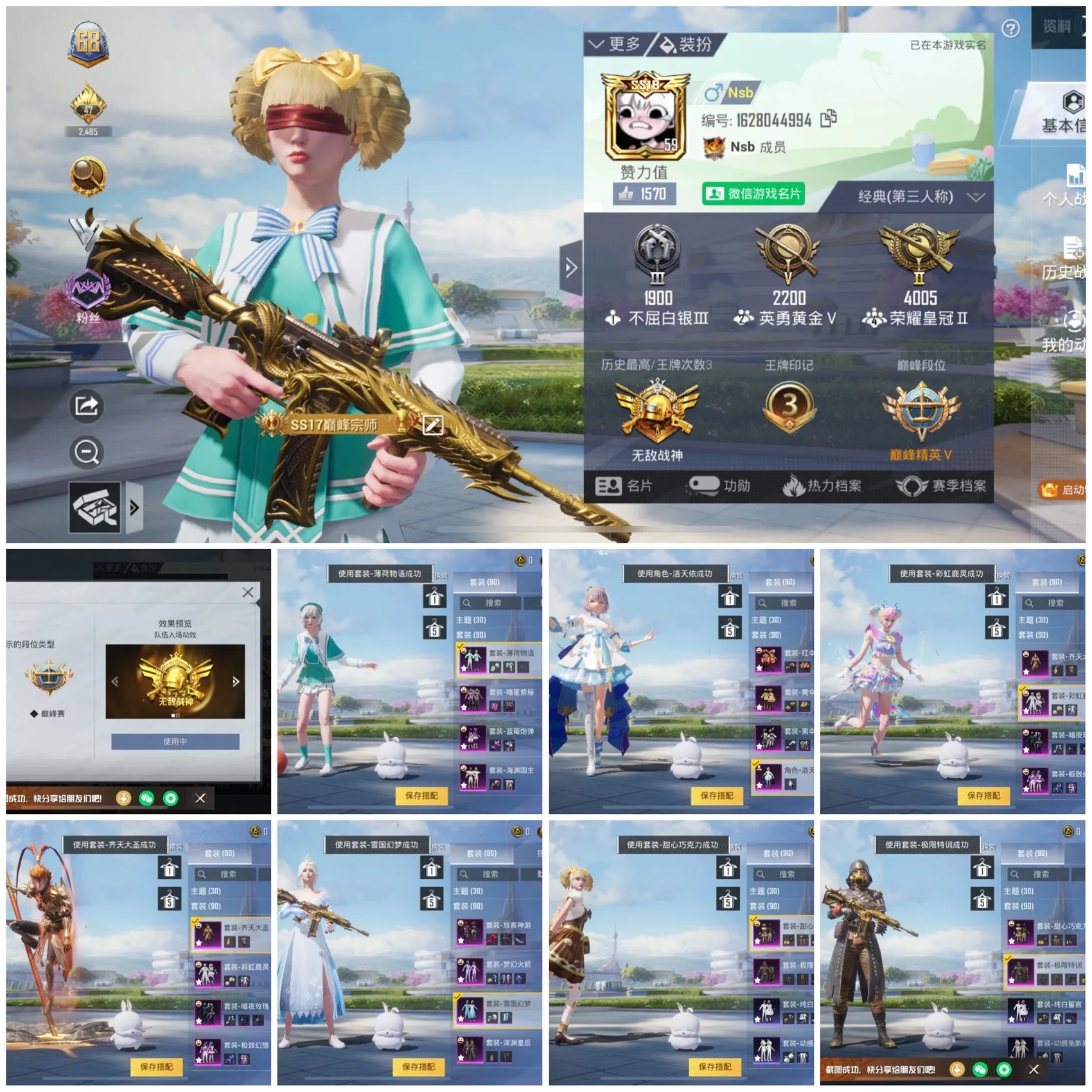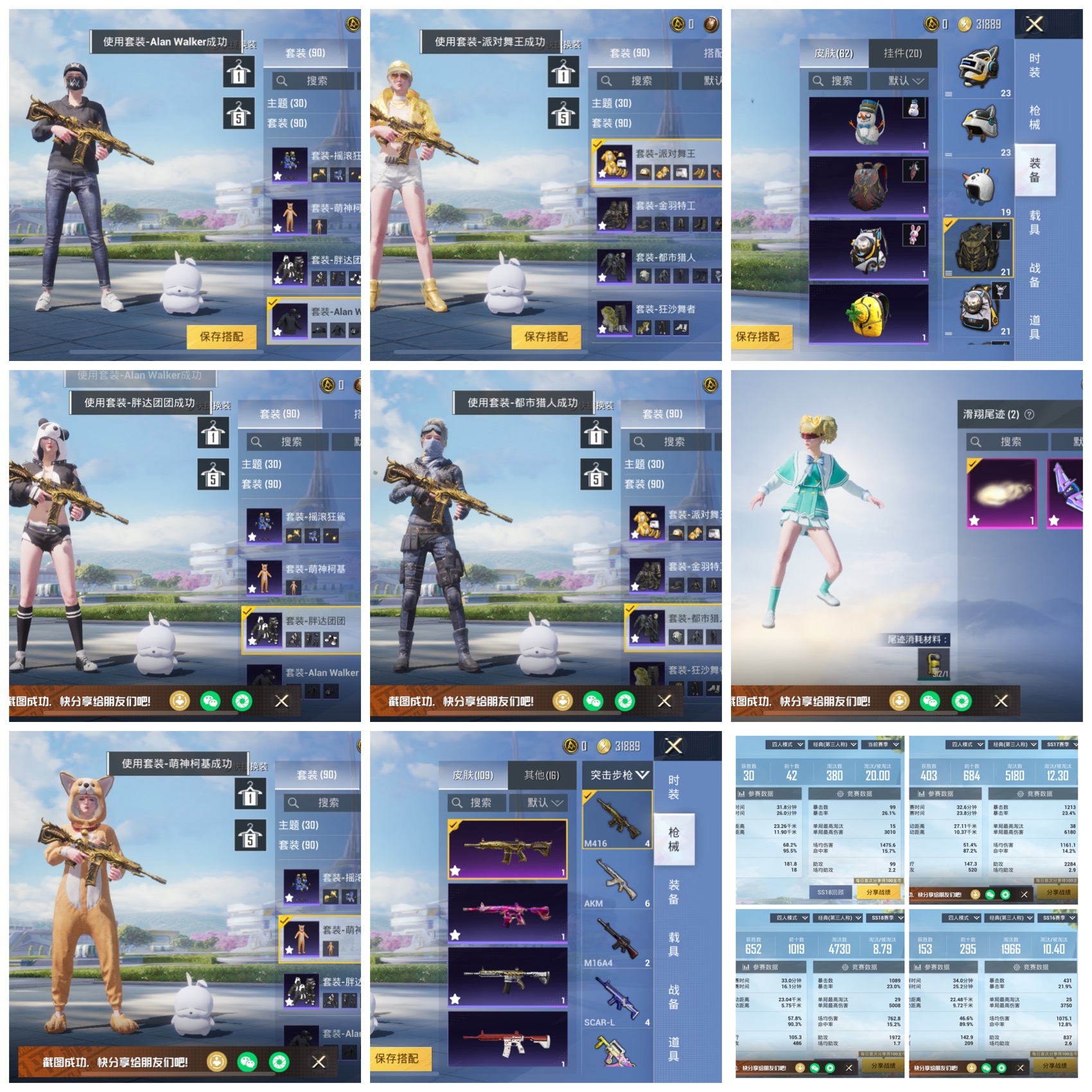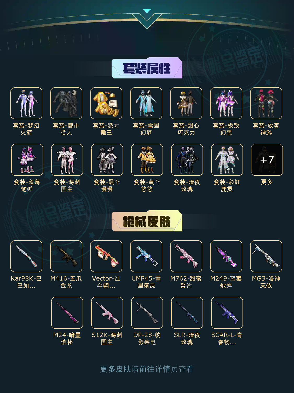 18粉,0载具,12特效枪,170套装,11王牌印记 Vector-红伞翩翩/M416-五爪金龙/M24-暗星紫秘/MG3-洛神天依/SCAR-L-青春物语/SLR-暗夜玫瑰/S12K-海渊国主/UMP45-雪国精灵/M762-甜蜜誓约/M249-蓝莓炮弹