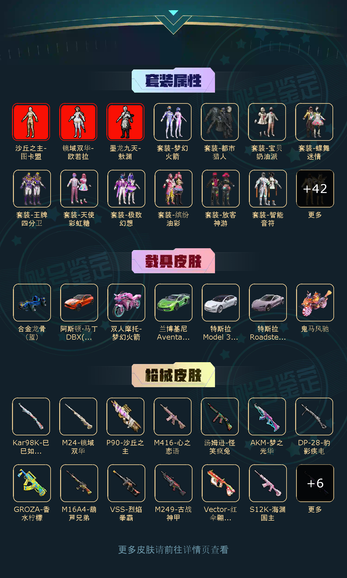 54粉,7载具,388套装,20王牌印记,超级王牌11星历史最高段,226112热力值 M762-激战未来/GROZA-香水柠檬/M416-心之恋语/M16A4-葫芦兄弟/AKM-炫紫旋律/M416-墨龙九天/AKM-梦之光华/S12K-海渊国主/SKS-诡面斩/VSS-烈焰拳霸/Mini14-龙虾霸霸/M249-古战神甲/M249-蓝莓炮弹/DP-28-豹影疾电/汤姆逊-怪笑疯兔/Vector-红伞翩翩/P90-沙丘之主/Kar98K-巳巳如意/M24-镜域双华/特斯拉Roadster(沁心粉)/特斯拉Model 3(珍珠白)/阿斯顿·马丁DBX(橙)/鬼马风驰/合金龙骨(蓝)/兰博基尼Aventador(翡翠绿)/双人摩托-梦幻火箭/ 满级图卡盟 满级熬渊 满级欧若拉 自由切换