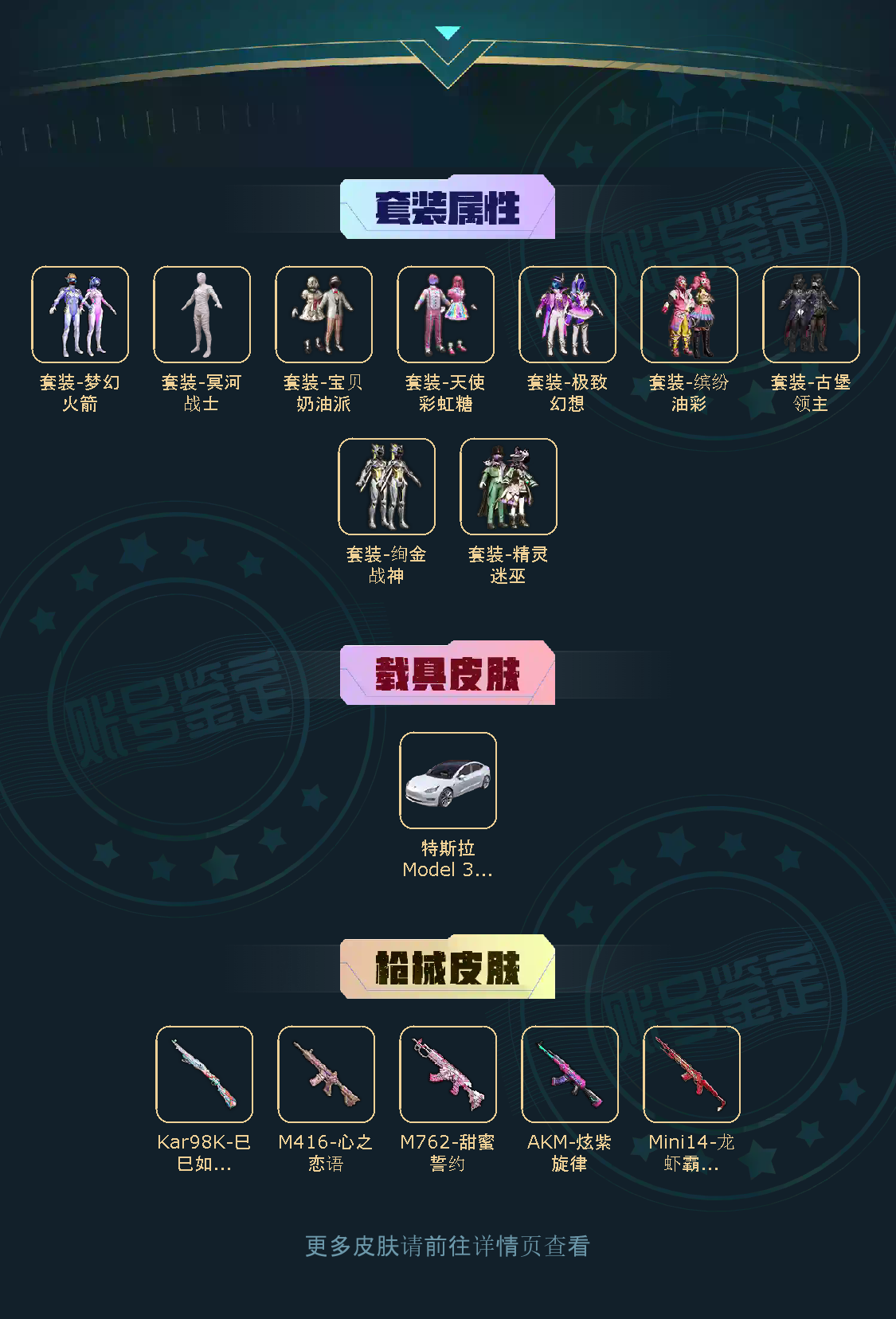 8粉,1载具,5特效枪,204套装,15王牌印记 M416-心之恋语/AKM-炫紫旋律/M762-甜蜜誓约/Mini14-龙虾霸霸/特斯拉Model 3(珍珠白)