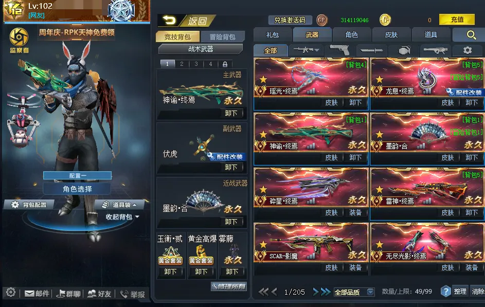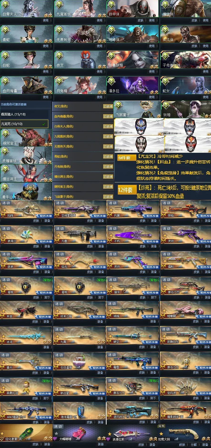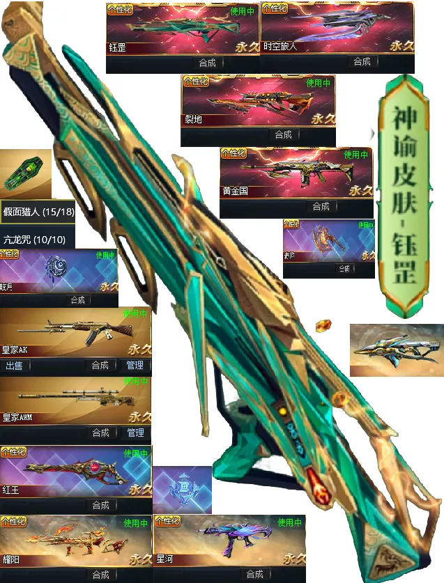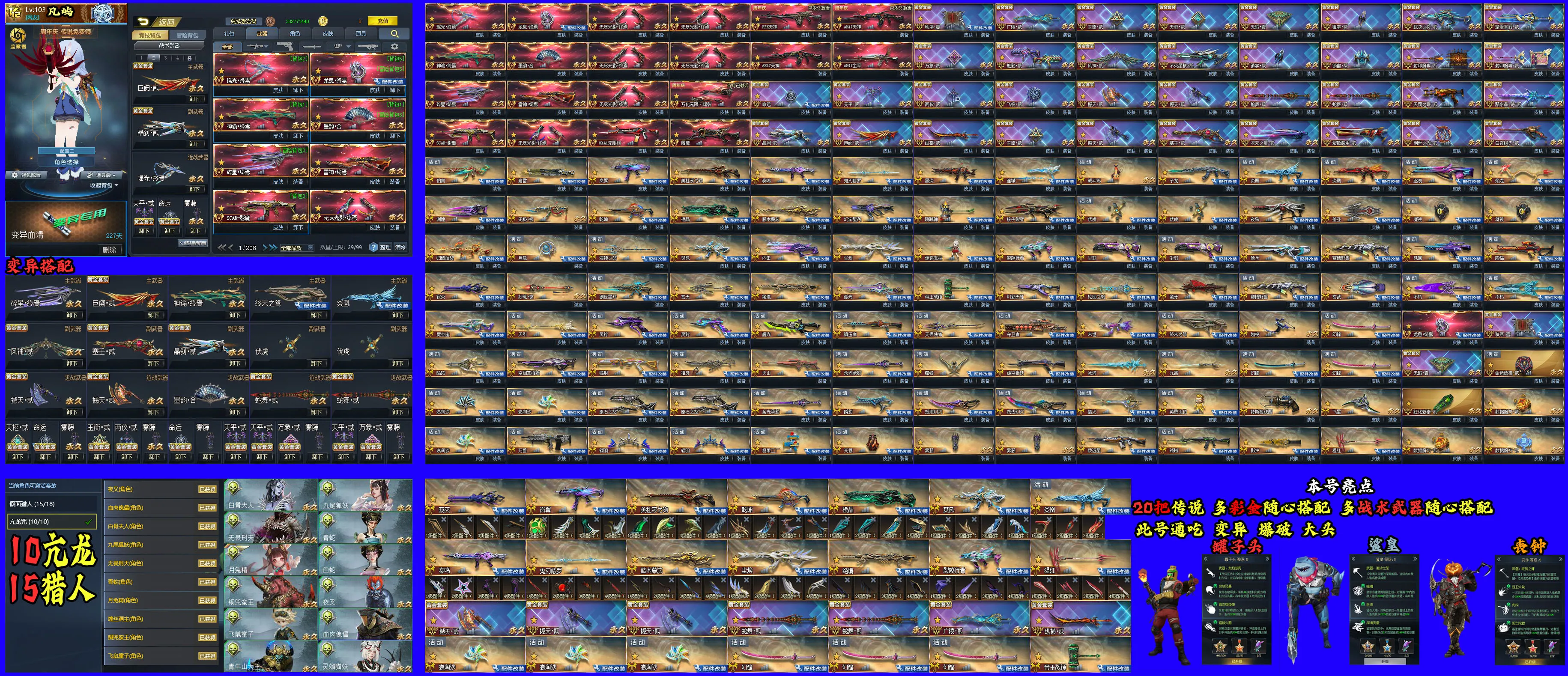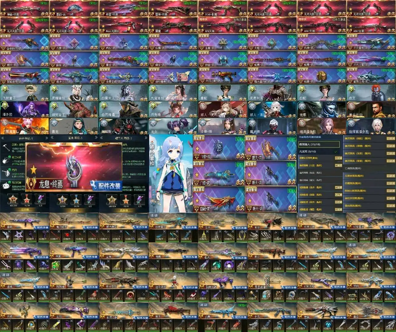 传说武器:瑶光终焉⭐龙息终焉⭐神谕终焉⭐墨韵合⭐碎星终焉⭐雷神终焉⭐SCAR影魔⭐M4A1无限EX⭐屠魔⭐无尽光影x6⭐RPK天神⭐AK47天神x2⭐AK47主宰⭐万化无限爆裂⭐