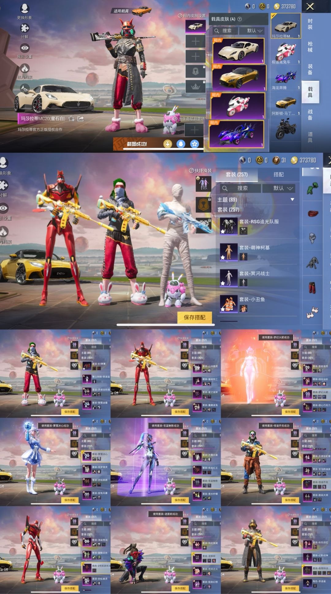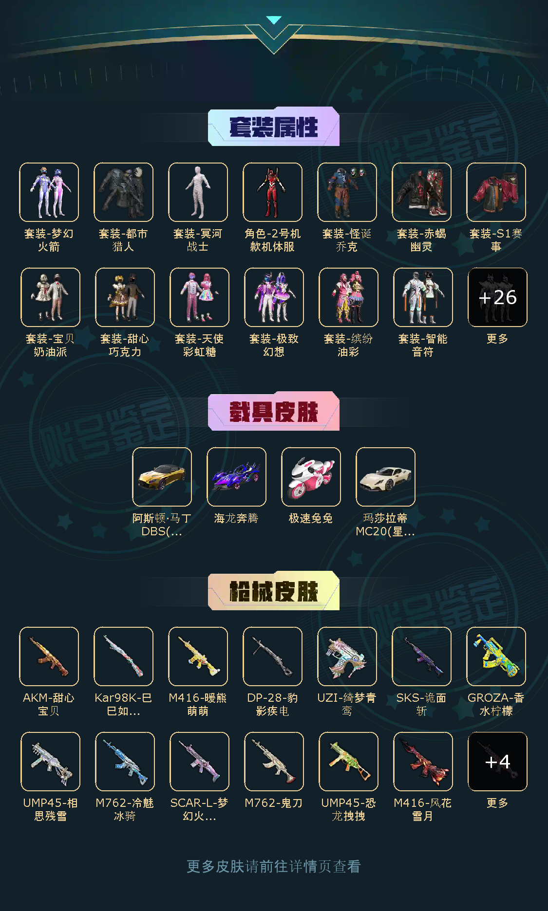 (默认特效枪一级)禁止分解【退款白嫖顶号拉黑】【开挂查信息起诉赔偿个人财产】34粉,4载具,257套装,UZI-绮梦青鸾/AKM-甜心宝贝/SCAR-L-梦幻火箭/SCAR-L-童趣迷兔/M416-风花雪月/SKS-诡面斩/GROZA-香水柠檬/M416-暖熊萌萌/M416-心之恋语/M416-五爪金龙/AKM-炫紫旋律/M762-冷魅冰骑/UMP45-相思残雪/UMP45-恐龙拽拽/海龙奔腾/玛莎拉蒂MC20(星石白)/阿斯顿·马丁DBS(金)/极速兔兔/