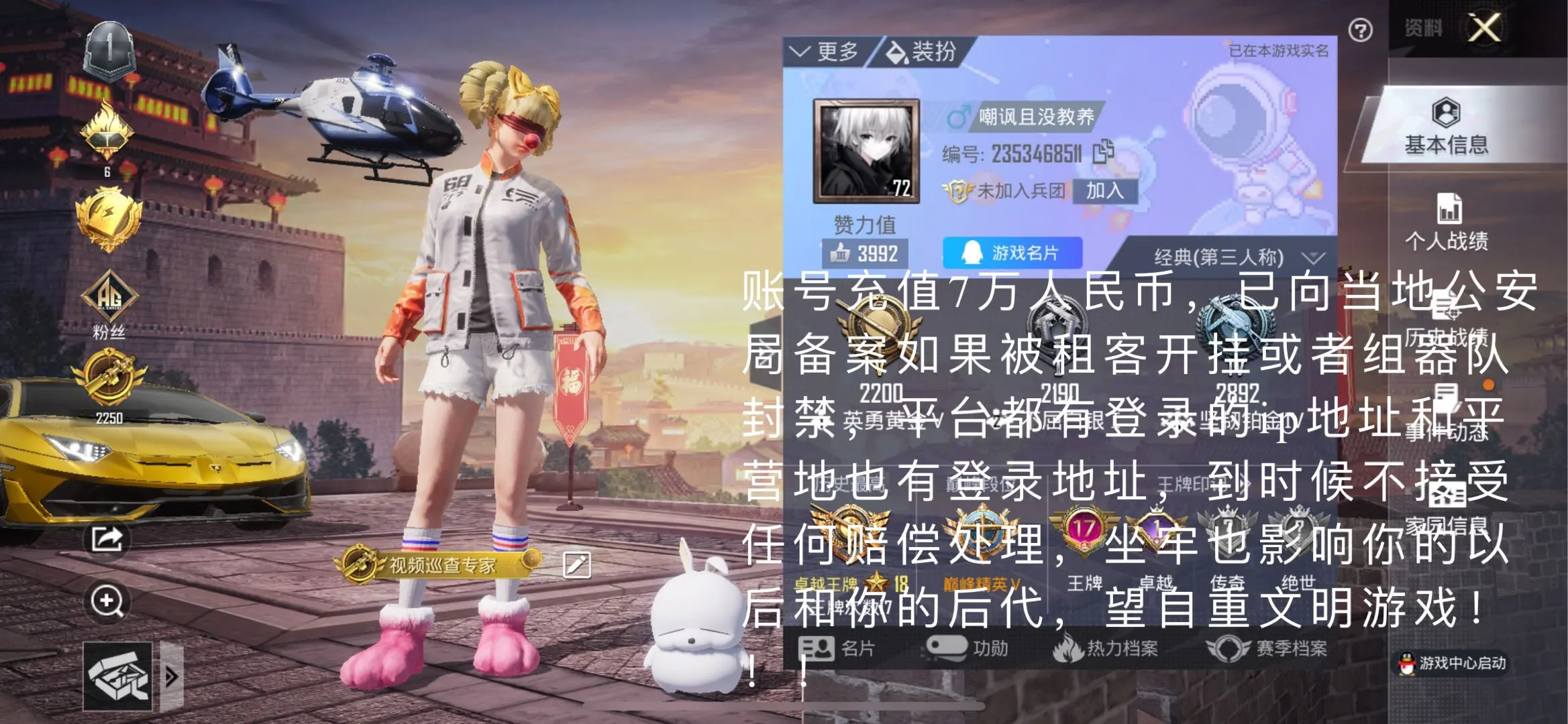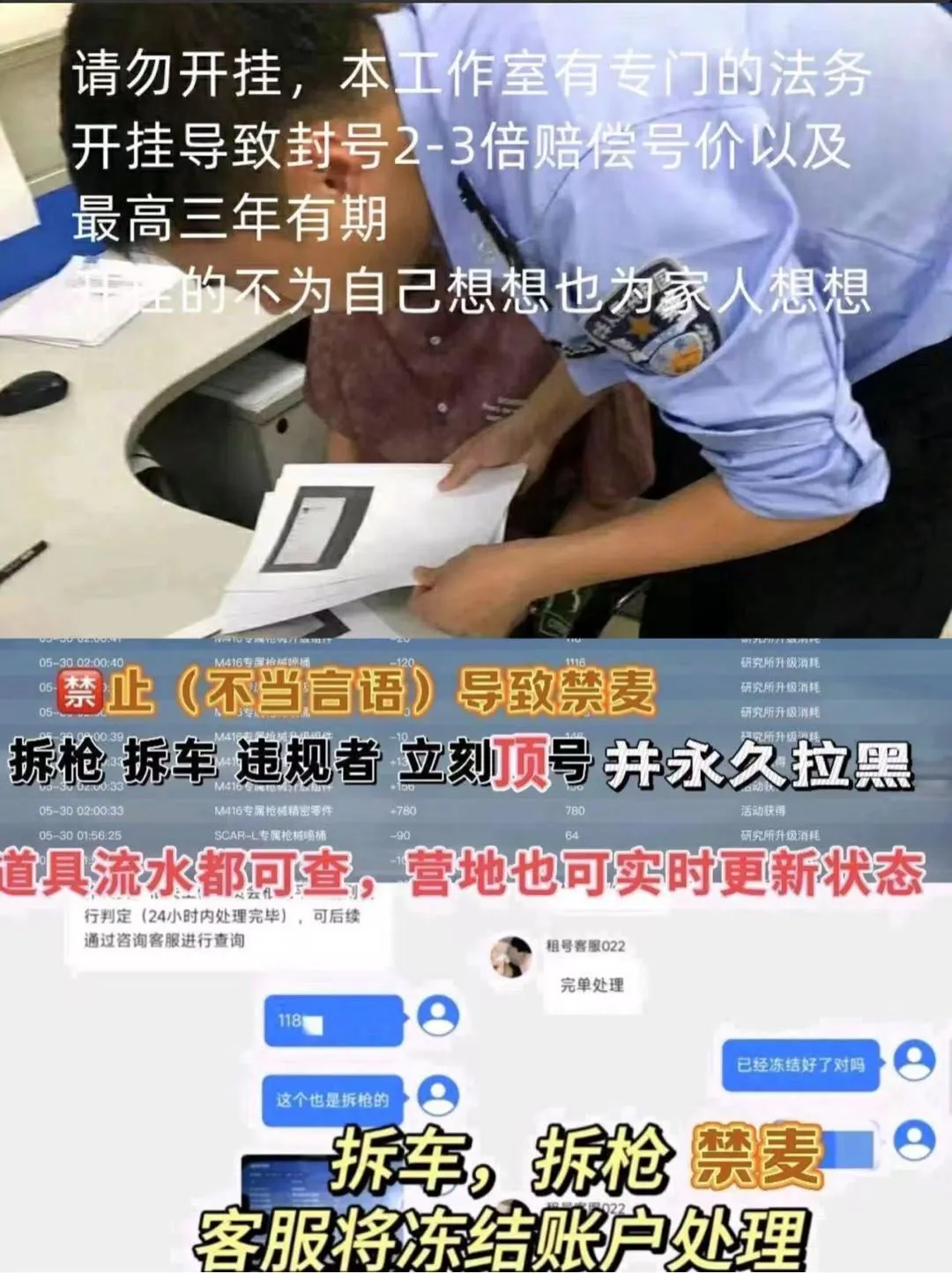 开挂⑤ 禁止和开挂玩家一起游戏 否则按开挂处理一律安排律师报警此号已在公安局备案登记 乱下一律拉黑处理 此号已加入公司虚拟财产价值已达立案条件,严禁开挂 如发现开挂 封号 一律报警处理 平台都有你的信息 上号的ip有你的地址 情节严重者以损害他人财物罪可判3年以上有期徒刑 不得使用第三方,毁号直接报警,全平台使名制。话不多说 小本生意 希望各位老板可以当作自己号爱惜 用号愉快