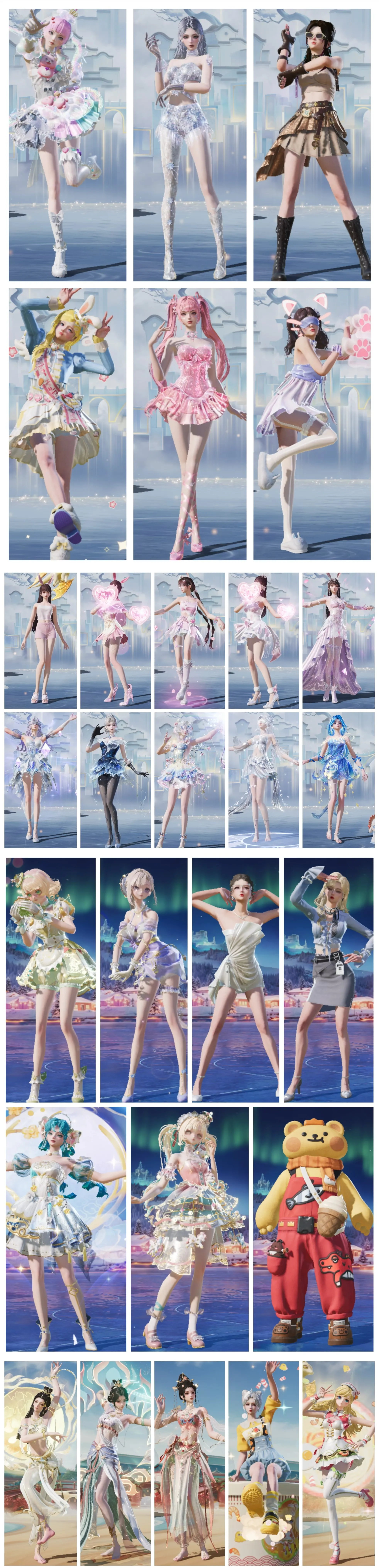 👗裙子有:虹云熊熊、暮夜私语、绶带小兔、大漠长河、极地冰晶、蜜语粉晶、拉面少女、顽皮橙、小熊虫、回旋牧梦使、云端星象师、杯旋调茶师、霁蓝缠春、甜美闪耀、魔力圈圈香香汉堡、芝士鼠鼠、摩卡猫猫、甜橙豚豚、绯月迷踪、玫纹锢梦、黯羽织刑、灵公主、时希公主、乐音、魔法花灵、超新星舞、优雅婉拒、狂魅哈莉、圣穹绘梦、小鸟芋圆、辉羽雀灵-初翊、老101、智耀战神、猎影月神、瑰梦爱神、幻海仙踪、鲛海歌灵、幽澜祭司、绯果甜心、果冻柠檬、绒绒粉兔、星月云朵、晨曦轻云、雪夜云雾、翎光蝶翼、冰晶湖光、琉璃花蕾、晶梦幻蝶、晶辉守护、晶灵使者、盛世惊鸿、海琴烟、熊二、熊抱抱、小狗蛇点点、月影灵韵、女娲神识、临安公主、梦域神使、千金淑猫全套、牡丹亭游园、幽焰骑士-维塔、露米娜、时空协奏-心弦(新大转盘动作出)、金丰海韵、金域紫灵、兔兔小魔女、暗影刺翼、星梦奇缘、极地流光、粉雾角色、奶油梦幻熊、赞比、梦海之灵-妮芮妲、鸢尾晶梦、迎夏光舞、听雨铃兰、卖崽青蛙、冰公主、电磁星、严莉莉、美琪、美雪、小蓝、烟云彩霞、蝶吟花词、欧若拉、湖雨初晴、花羊椰椰、糯粉咩咩、蜜语绒猫、童真绒兔、萌趣绒叽、璀璨流光、宝石天鹅、湖泊玉兰、傲娇队长、华贵领队、天使心小叽、莲影清波、镜光幻境、憨憨奶龙、傲傲奶龙、宙之时溯、小丑、赤蝎、星河浪客、暗影哥特、雪国幻梦、木乃伊、闪耀迪迦、日冕精灵、银月精灵、星谷精灵、是爱神辣、罗小黑三件套、诗意画廊三裙子、三牛仔、软软马卡龙、软软绵绵、闲梦青樱、茉莉星、蔷薇星、萌物绒绒、暖熊萌萌、巧克力三姐妹、红紫螳螂、璀璨巨星、白勺、第五大道、超级赛亚人孙悟空、都市猎人、音爆索尼克、三套婚纱、冰川三姐妹、彩虹甜喵、彩虹嘻哈猴、垂柳戏鸭、齐天大圣、草莓生巧、馨动时刻、猪妹、童趣迷兔、火箭少女、甜蜜誓约、俏皮狐尾、胖达团团、女仆两件套、甜蜜旋律、幽秘魅影、黑猫等