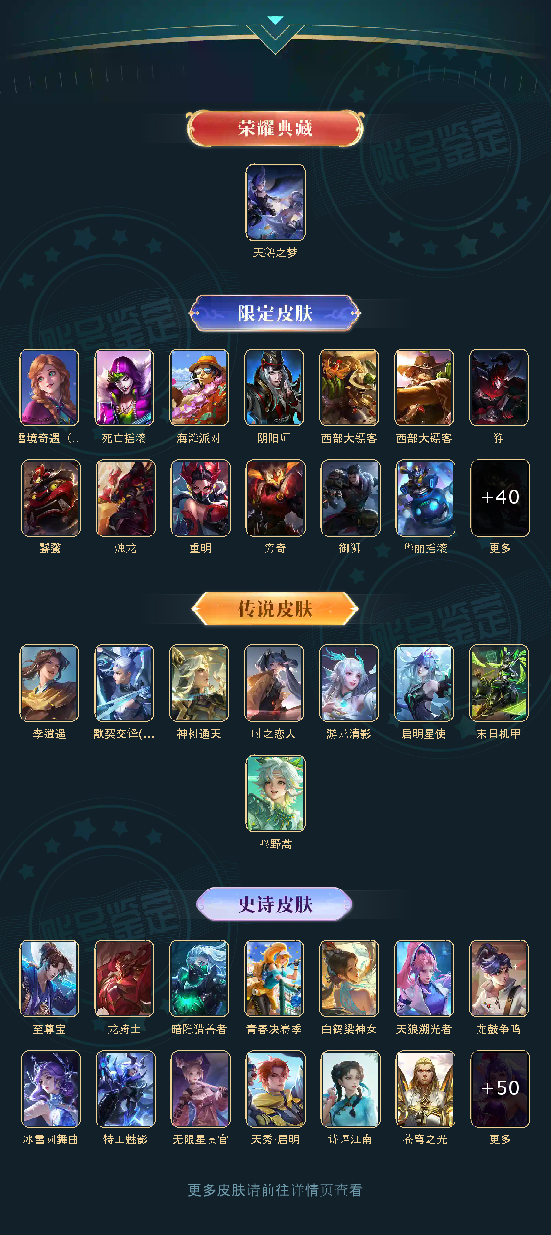 贵族等级V4,英雄数量126,典藏皮肤数1,皮肤数量259,天鹅之梦/至尊宝/梁祝/白鹤梁神女/李逍遥