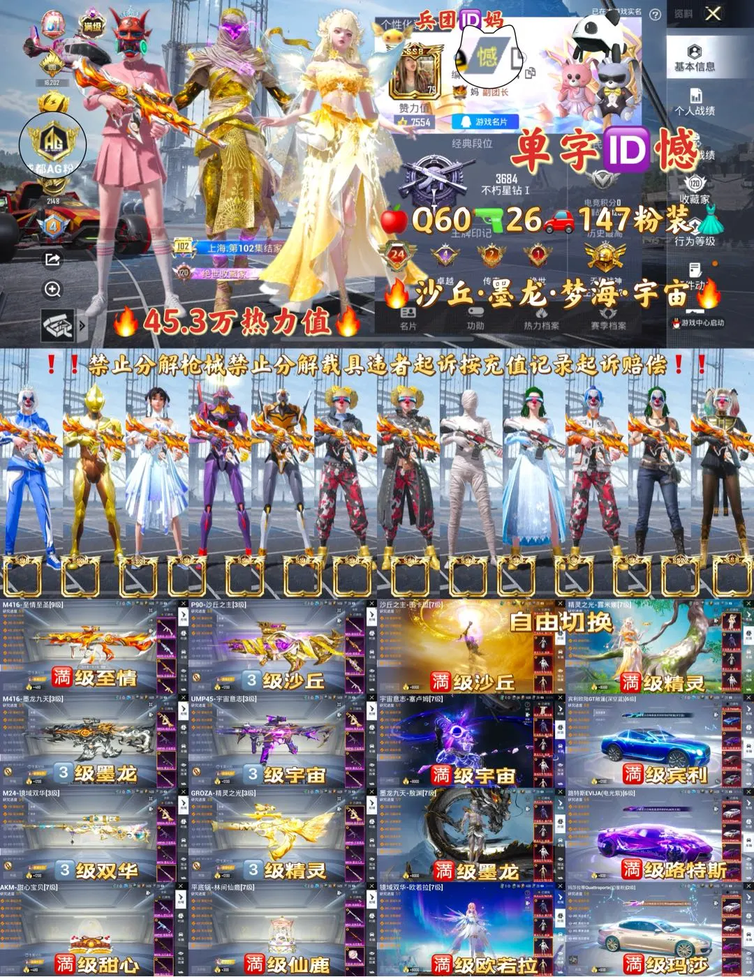 超级王牌3星166粉,35载具,708套装,32王牌印记,无敌战神历史最高段,526872热力值 平底锅-林间仙鹿/M416-灵猫魔法师/AKM-甜心宝贝/SCAR-L-梦幻火箭/SCAR-L-童趣迷兔/AUG-星梦奇缘/M416-风花雪月/AUG-星之彼岸/M762-甜心娃娃/M762-激战未来/GROZA-香水柠檬/AKM-幽焰骑士/M416-心之恋语/M16A4-葫芦兄弟/M416-五爪金龙/M16A4-垂柳戏鸭/AKM-炫紫旋律/GROZA-精灵之光/M416-墨龙九天/GROZA-焦糖拿铁/SCAR-L-青春物语/M762-冷魅冰骑/AKM-百合蜜语/M416-至情至圣/M762-甜蜜誓约/SCAR-L-机甲封神/AKM-梦之光华/SCAR-L-魔童闹海 哪吒/SCAR-L-灵驹仙姬/AKM-暮色玫影/S12K-海渊国主/SKS-碧影闪光/Mk14-盛世惊鸿/SKS-诡面斩/Mini14-荧光虫舞/Mini14-绚金瑰梦/SLR-暗夜玫瑰/VSS-烈焰拳霸/Mini14-龙虾霸霸/Mk14-福马献瑞/DP-28-扶摇飞仙/M249-彩虹甜喵/MG3-辉羽雀灵/DP-28-枪炮玫瑰/DP-28-幻梦音符/M249-猪猪侠/MG3-洛神天依/M249-古战神甲/M249-蓝莓炮弹/DP-28-豹影疾电/UZI-绮梦青鸾/汤姆逊-怪笑疯兔/Vector-红伞翩翩/UMP45-宇宙意志/AKS-74U-星穹咏叹调/Vector-环太平洋/UZI-筑梦精灵/Vector-最终圣卫者/UMP45-雪国精灵/UMP45-相思残雪/UMP45-恐龙拽拽/野牛-流星咚咚/P90-沙丘之主/汤姆逊-冰川粉黛/UMP45-霜月狼主/AKS-74U-无垠阁/破片手榴弹-瓶中星球/Kar98K-伏魔团/Kar98K-圣域龙灵/AWM-花间之火/AWM-焰龙焚天/Kar98K-巳巳如意/AWM-橘柚倾心/M24-镜域双华/M24-暗星紫秘/Kar98K-暗翼战神/M24-星之信仰/Kar98K-绿意幻情/玛莎拉蒂Ghibli(金)/特斯拉Roadster(尊享铂)/特斯拉Roadster(沁心粉)/特斯拉Model 3(珍珠白)/玛莎拉蒂Ghibli(蓝)/特斯拉Roadster(水滴蓝)/阿斯顿·马丁DBS(金)/玛莎拉蒂Quattroporte(幻星粉)/玛莎拉蒂Ghibli(粉)/虚妄之影(炫耀紫)/宾利欧陆GT敞篷(深空蓝)/萌喵橘座/阿斯顿·马丁DBX(橙)/南瓜骑士/特斯拉Model X(冷光银)/鬼马风驰/快艇-塞莎KL27(霓虹粉)/特斯拉Cybertruck(荒芜蓝)/金龙耀世/合金龙骨(蓝)/灵鼠银迹/合金龙骨(红)/路特斯EVIJA(电光紫)/兰博基尼SVJ(炫光金)/暮色幽蹄/九霄玄鹿/霜月冰狼/护世瑞兽/星梦玉骢/黑曜夜骑/兰博基尼Aventador SVJ(炫光金)/辉羽雀灵自行车/双人摩托-梦幻火箭/双人摩托-双刃魅影(金)/盛世惊鸿摩托车/踏焰逐风摩托车/