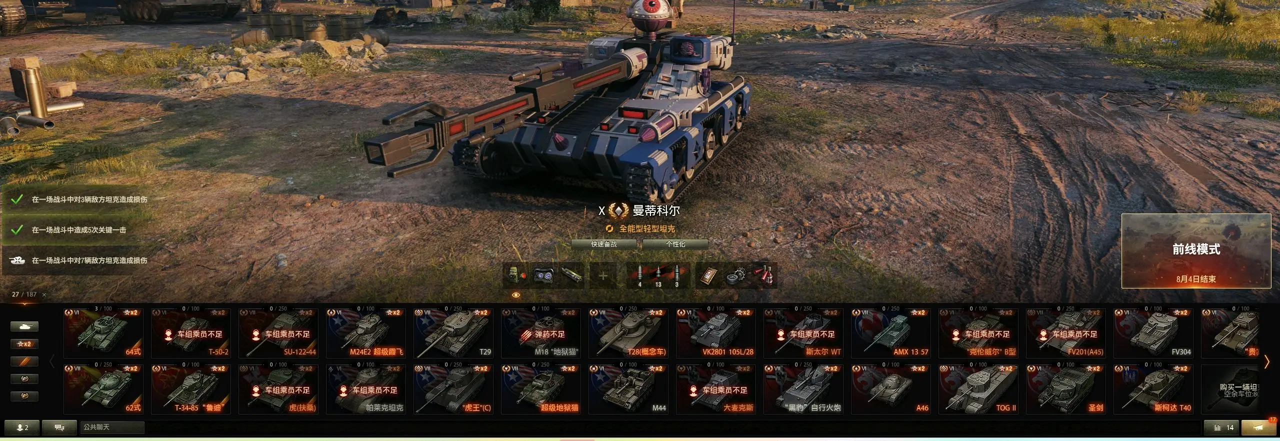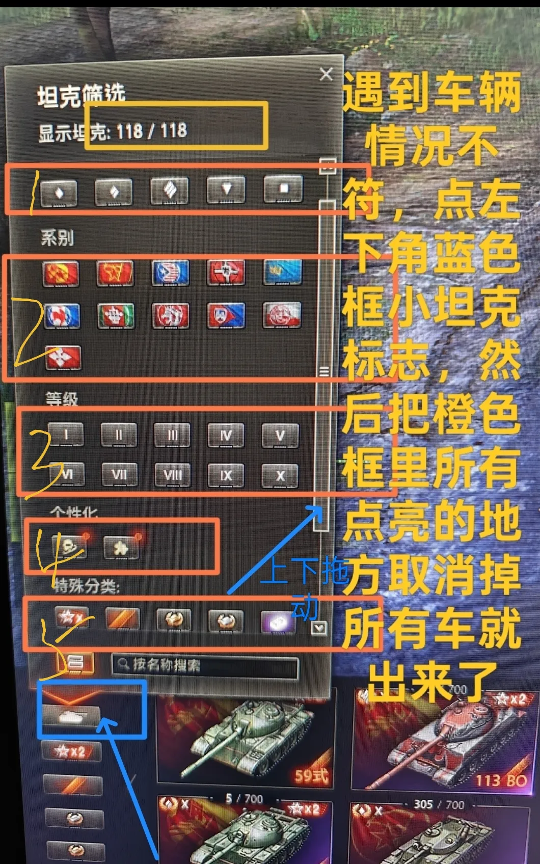 注意事项:1,进入游戏后,如果车辆情况不符。那是因为前面的玩家筛选了自己玩的坦克,其他的隐藏了。坦克显示栏,左下角小坦克标志,点进去把所有系别和级别选上,坦克就全部出来了。