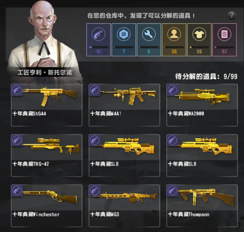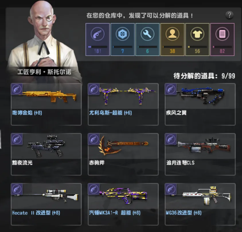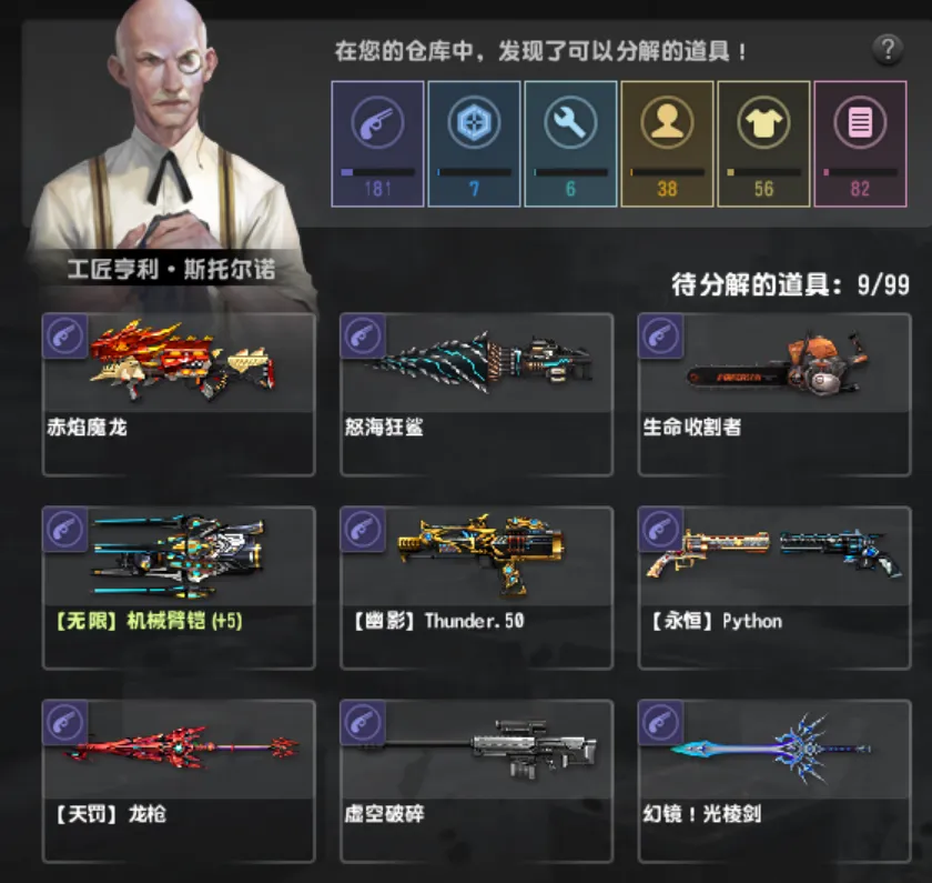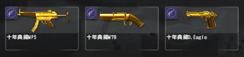 十周年系列只差akm和p08,圣诞毁灭,毁灭战船,咆哮金焰,尤利乌斯,疾风之翼黯夜流光,赤驹斧,追月连弩cls,卡利柯超能,金红双蝎,圣诞鹿角,塔沃尔战船,赤焰魔龙,怒海狂鲨,生命收割者,机械臂凯,幽影,永恒,龙枪,虚空破碎,光棱剑,青龙刀,终结者,浮生梦瑶,女仆安娜,佣兵洛昂,教父大卫布莱克,血契伊丽莎白,陈世妍校服。