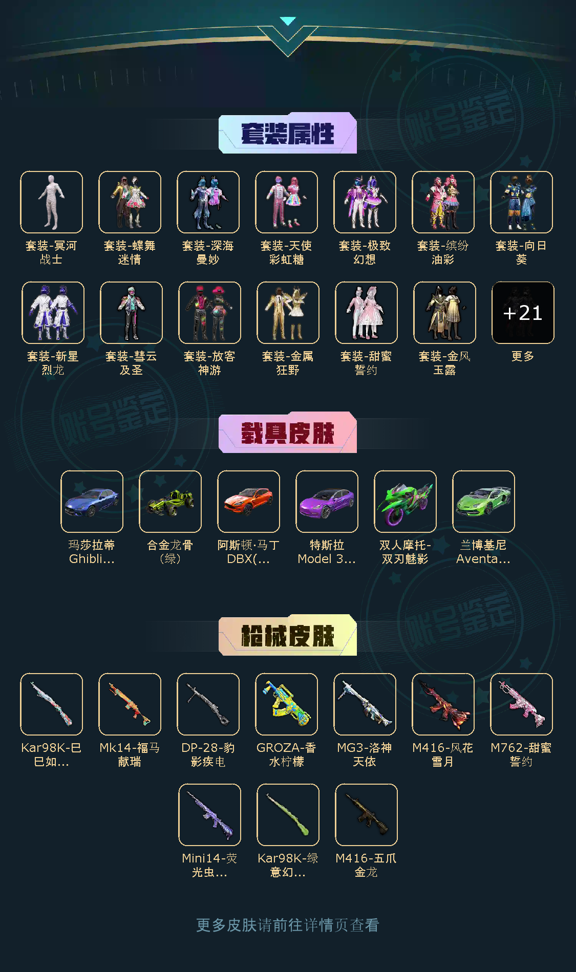 历史最高段位:超级王牌12星 热力值:147319 王牌印记:19 游戏等级:75【274套装-286枪皮-6载具-11珍稀飞行器】【稀有】木乃伊套装/套装-雪山精英/套装-龟仙人/套装-迅捷狂鲨/M416-快乐主宰,【32粉套装】套装-快乐主宰/套装-天使彩虹糖/套装-古堡领主/套装-精灵迷巫/套装-金风玉露/套装-星之信仰/套装-蝶舞迷情/套装-甜蜜誓约/套装-天启纪元/套装-深海曼妙/套装-潮汐统领/套装-黄蜂伯爵/套装-金属狂野/套装-缤纷油彩/套装-放客神游/套装-扶摇飞仙/套装-彗云及圣/套装-新星烈龙/套装-迷蝶贵族/套装-向日葵/套装-花间之火/套装-极致幻想/套装-银刃赛罗/套装-苍蓝魅影/套装-绚金战神/套装-香水柠檬/角色-洛天依/套装-葫芦兄弟/套装-齐天大圣/套装-银龙傲海/套装-沙场疾风/套装-俏雪含霜【7粉枪皮】M416-五爪金龙/M762-甜蜜誓约/GROZA-香水柠檬/M416-风花雪月/Kar98K-绿意幻情/Mini14-荧光虫舞/MG3-洛神天依