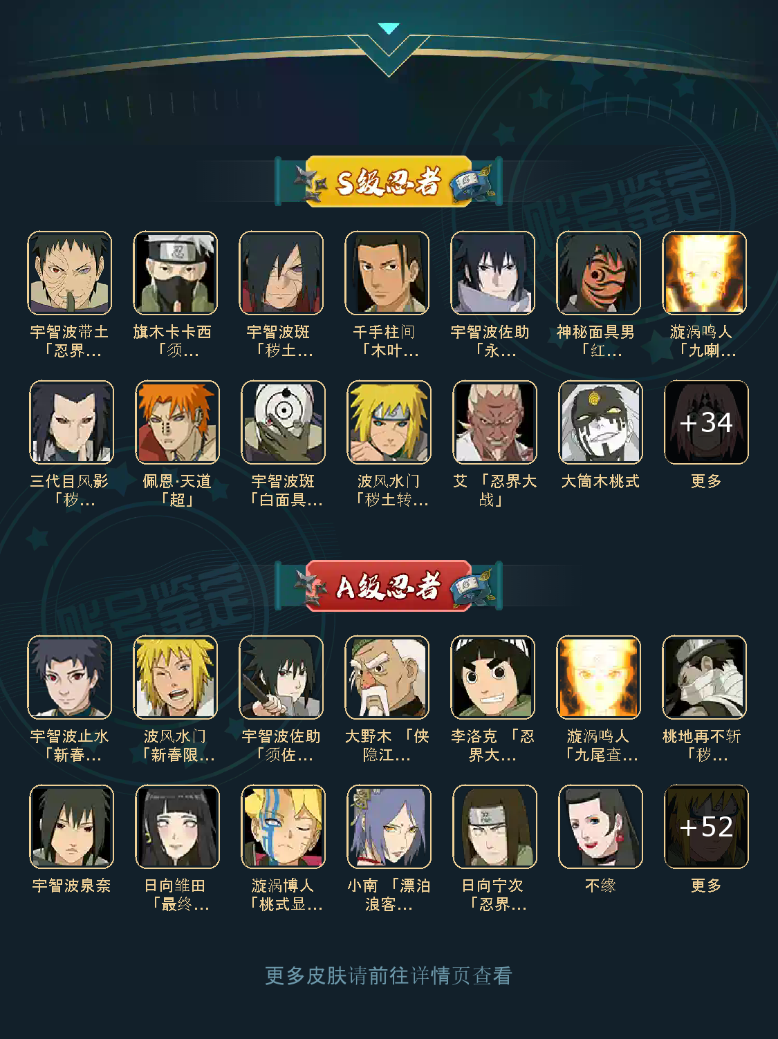 战力:2557W+;VIP14级;S忍47个;A忍58个,通灵兽28个,S忍:5星仙人模式自来也,5星纲手(普通),5星波风水门(普通),5星猿飞日斩(普通),4星自来也(普通),4星大蛇丸,4星秽土转生波风水门,4星神秘面具男(普通),4星三代目土影大野木,九喇嘛连结漩涡鸣人,永恒万花筒宇智波佐助,忍界大战春野樱,舞之豪杰自来也,百豪纲手,死门迈特凯,秽土转生猿飞日斩,秽土转生千手扉间,千手扉间(普通),千手柱间(普通),木叶创立千手柱间,秽土转生千手柱间,秽土转生宇智波斑,宇智波斑(普通),木叶创立宇智波斑,秽土转生解宇智波斑,须佐能乎宇智波鼬,秽土转生宇智波鼬,白面具宇智波斑,忍界大战宇智波带土,红夜之刃神秘面具男,四代目风影罗砂,秽土转生三代目风影,二代目水影鬼灯幻月,四代目雷影艾,三代目雷影艾,秽土转生金角银角,秽土转生半藏,忍界大战大野木,二代目土影无,天道佩恩,超佩恩天道,秽土转生长门,仙人模式药师兜,大筒木桃式,博人传大筒木金式, ;A忍:5星猿飞阿斯玛(普通),5星干柿鬼鲛(普通),5星迈特凯(普通),5星蝎(普通),5星死司凭血飞段,4星飞段(普通),3星疾风传我爱罗,3星宇智波止水(普通),3星宇智波鼬(普通),3星忍界大战我爱罗,忍者之路神秘面具男,万花筒写轮眼宇智波佐助,须佐能乎宇智波佐助,九尾查克拉漩涡鸣人,仙人模式漩涡鸣人,最终章日向雏田,地陆,志村团藏,忍界大战勘九郎,忍界大战奇拉比,奇拉比(普通),青年艾,火影继承人猿飞日斩,近松十人卫千代,忍界大战日向宁次,惊门迈特凯,旗木卡卡西(普通),秽土转生猿飞阿斯玛,百豪春野樱,万花筒写轮眼旗木卡卡西,新春限定波风水门,忍界大战秋道丁次,青年波风水门,五代目水影照美冥,新春限定宇智波止水,不风,青年长门,晓创生角都,晓大蛇丸,新春限定宇智波鼬,木叶上忍猿飞木叶丸,角都(普通),地怨虞角都,加藤断,火之意志继承者卑留呼,侠隐江湖纲手,新春限定小南,秽土转生迪达拉