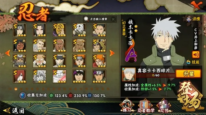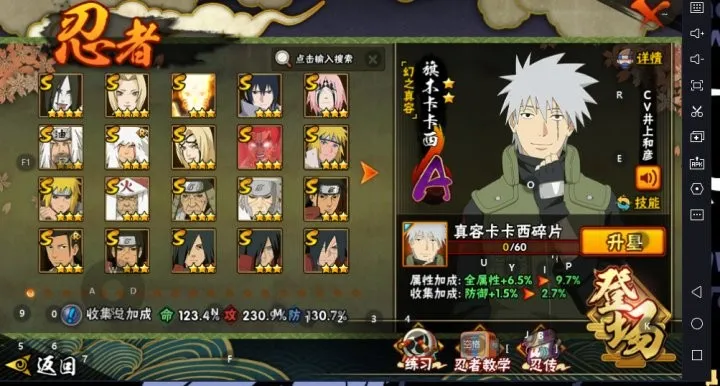 VIP12级;S忍40个;A忍55个,通灵兽20个,S忍:大蛇丸普通纲手九喇嘛鸣人永恒万花筒佐助忍战樱百豪纲手死门凯波风水门普通自来也豪杰自来也秽土水门猿飞日斩秽土猿飞秽土扉间千手柱间秽土柱间木叶创立柱间宇智波斑秽土斑秽