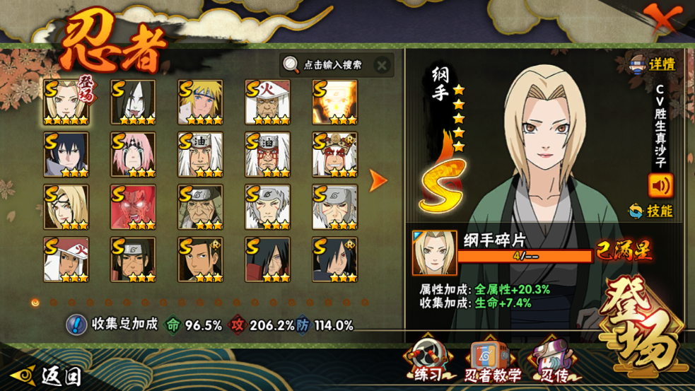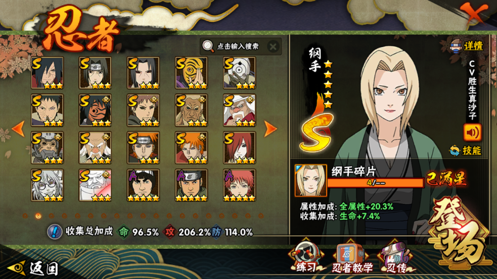 战力:1510W+;S忍37个;A忍39个,通灵兽21个,S忍:普通纲手大蛇丸波风水门猿飞日斩九喇嘛鸣人永恒万花筒佐助忍战樱仙人自来也普通自来也豪杰自来也百豪纲手死门凯秽土猿飞秽土扉间千手扉间千手柱间秽土柱间木叶创立柱间秽土斑木叶创立斑秽土