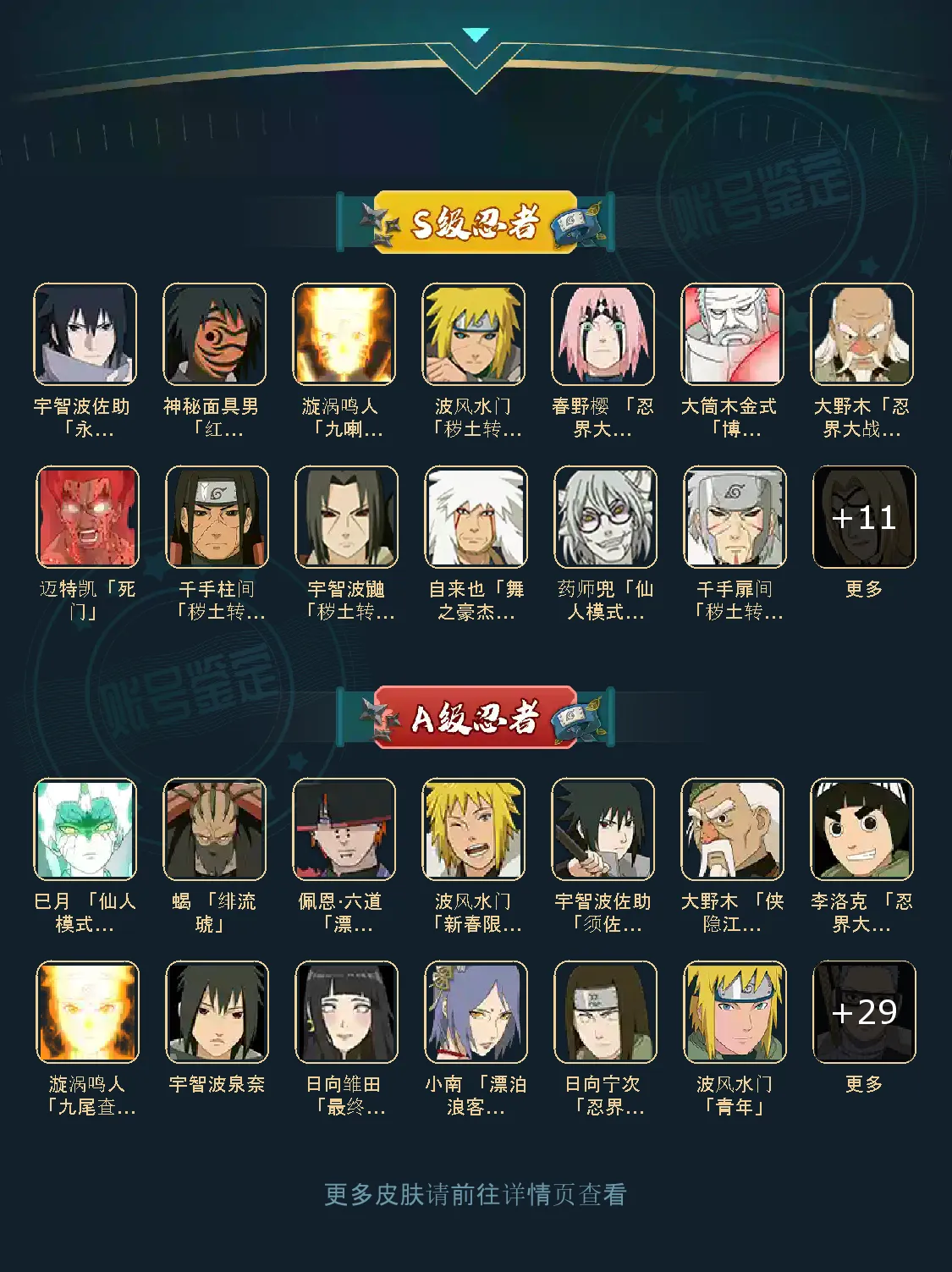 战力:944W+;VIP10级;S忍22个;A忍32个,通灵兽17个,S忍:九喇嘛鸣人永恒万花筒佐助忍战樱普通自来也豪杰自来也大蛇丸普通纲手百豪纲手死门凯波风水门秽土水门猿飞日斩秽土猿飞秽土扉间秽土柱间须佐鼬秽土鼬红夜面具男忍战大野木二代土