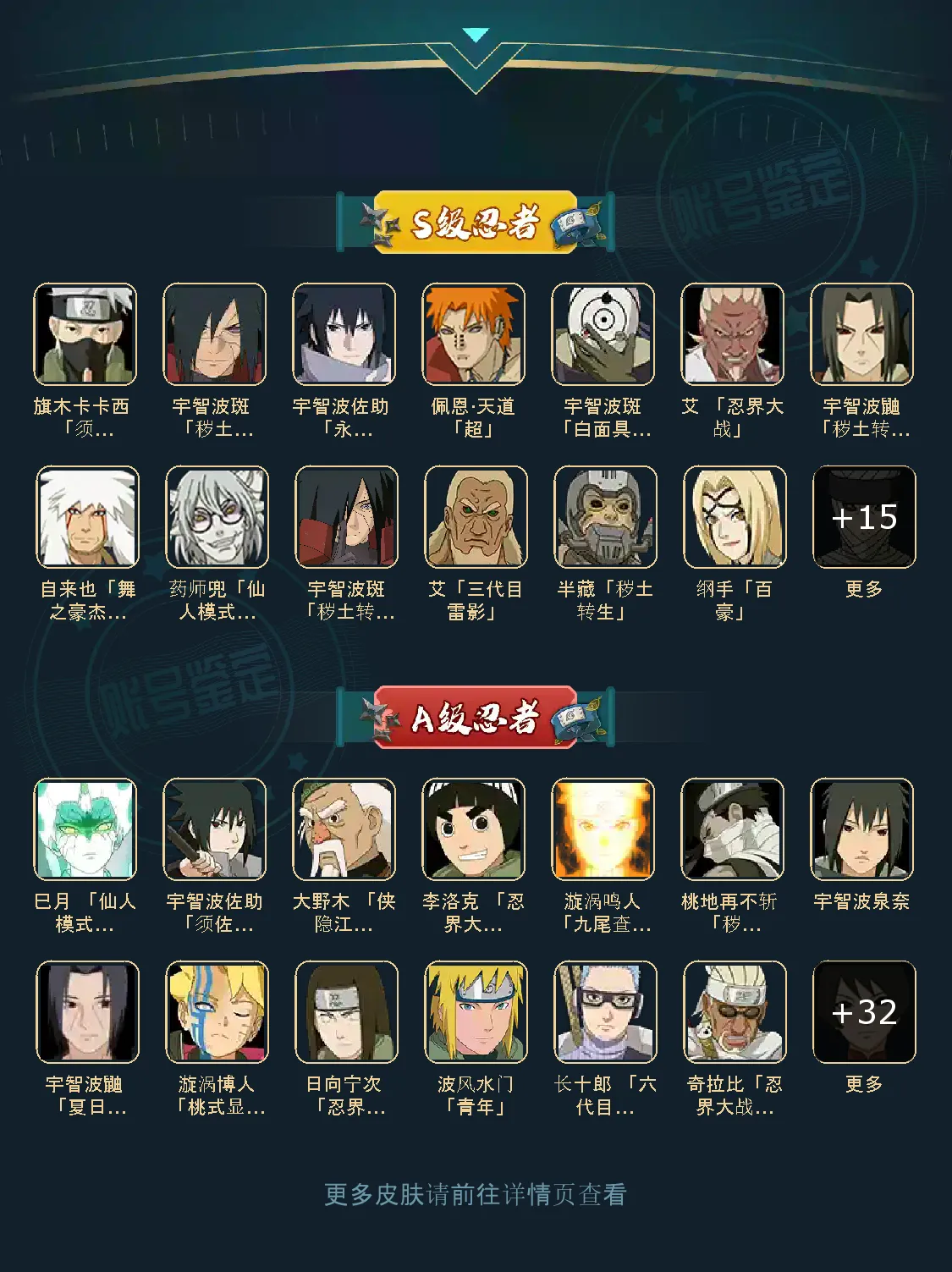 战力:1530W+;VIP11级;S忍25个;A忍34个,通灵兽20个,S忍:普通纲手波风水门猿飞日斩永恒万花筒佐助普通自来也仙人自来也大蛇丸百豪纲手秽土猿飞豪杰自来也秽土斑秽土解斑须佐鼬秽土鼬神秘面具男白面具鬼灯幻月三代艾金角银角秽土半藏