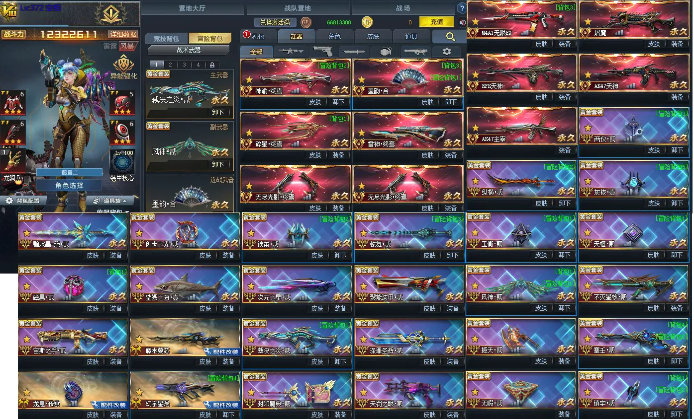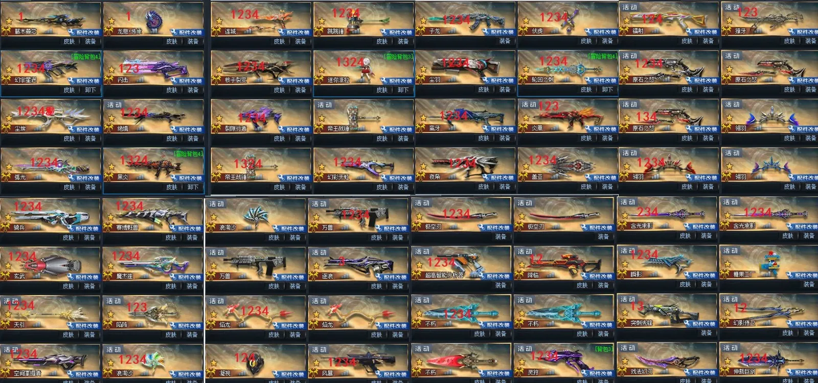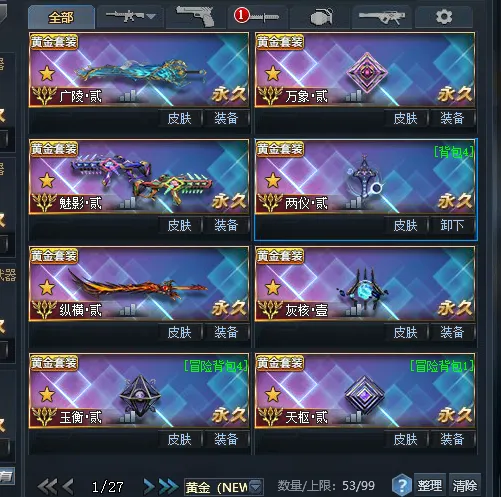 彩金武器:广陵贰 魅影贰 飞梭壹 两仪贰 万象贰 纵横贰 撼天贰 不灭星河贰 玉衡貳,天枢貳, 风神贰 鲨鱼壹 宙斯贰 塞壬贰,镇宇贰,锁宙贰,次元之星貳,暗水晶.绝貳,聚能贰,蛇舞贰 涂罪贰 天罚贰 魔典贰 龙息 无暇贰
