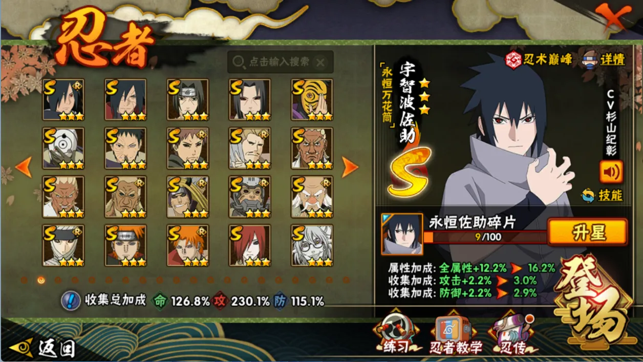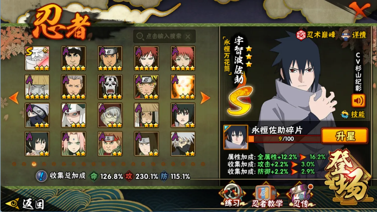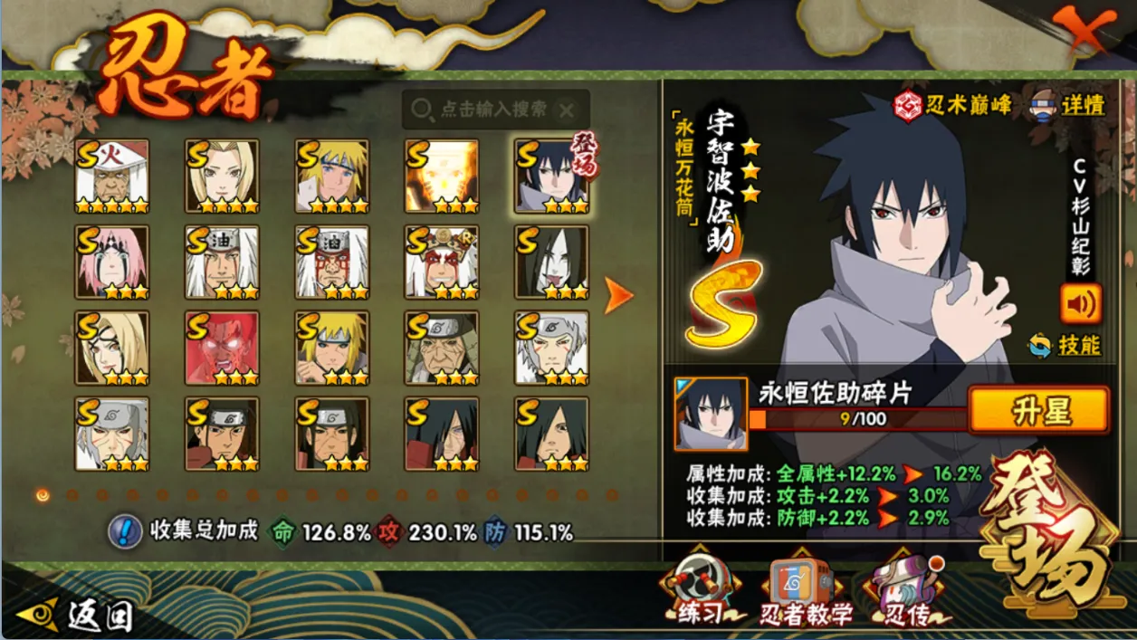 艾「三代目雷影」(3星艾「三代目雷影」),波风水门(3星波风水门),无「二代目土影」(3星无「二代目土影」),千手扉间「秽土转生」(3星千手扉间「秽土转生」),半藏「秽土转生」(3星半藏「秽土转生」),千手扉间(3星千手扉间),宇智波斑(3星宇智波斑),药师兜「仙人模式」(3星药师兜「仙人模式」),猿飞日斩(5星猿飞日斩),艾「忍界大战」(3星艾「忍界大战」),宇智波斑「秽土转生·解」(3星宇智波斑「秽土转生·解」),宇智波鼬「秽土转生」(3星宇智波鼬「秽土转生」),佩恩「天道」(3星佩恩「天道」)