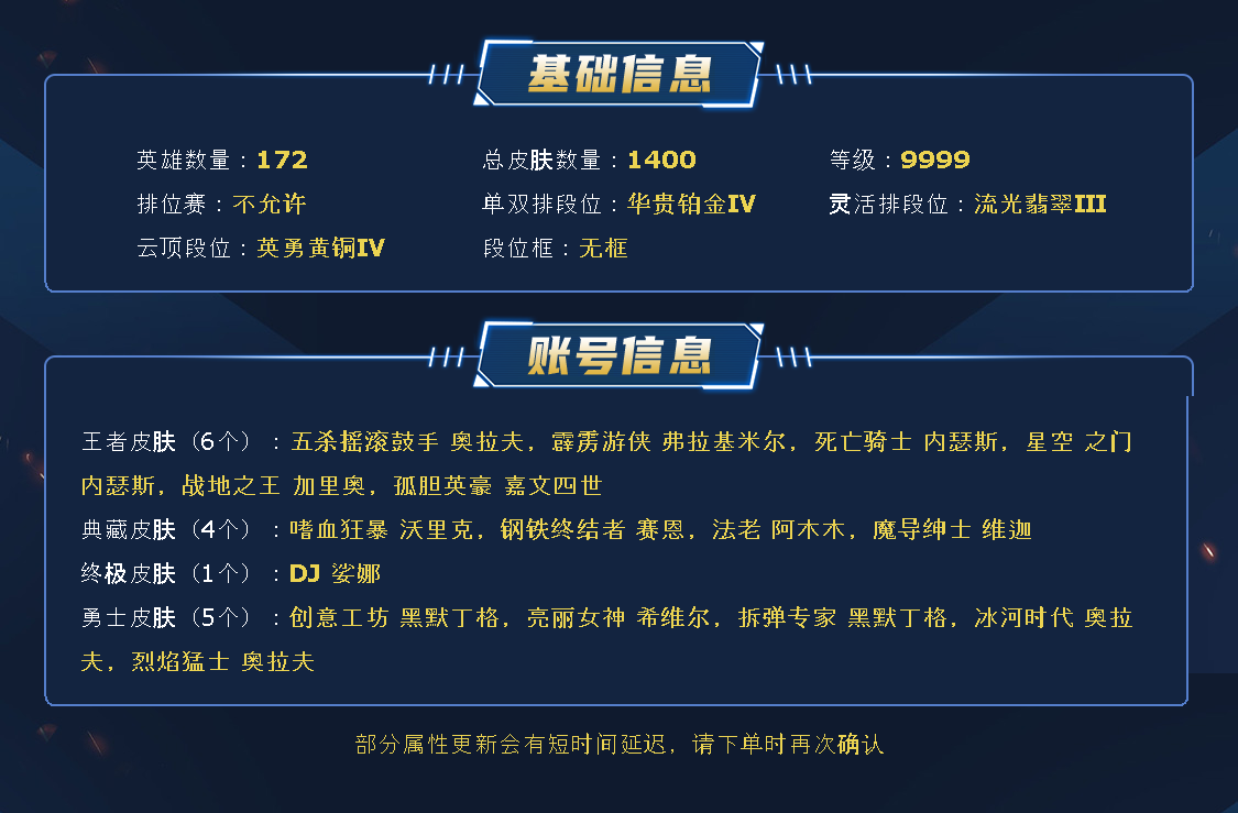 ~~喜欢记得收藏~~可排位~~1293皮全英雄~~租之前尽量查一下游戏ID,确保段位是您需要的,避免浪费您的时间~~请勿挂机逃跑故意送人头,谢谢合作,谢谢~~