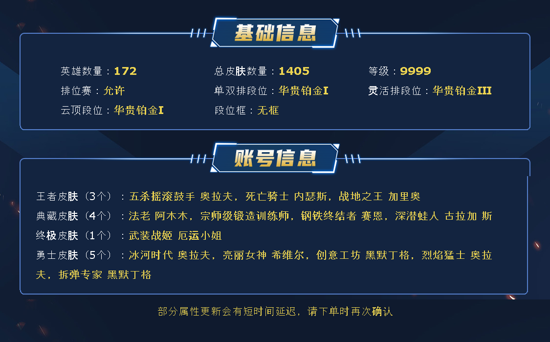 ~~喜欢记得收藏~~可排位~~1375皮全英雄~~租之前尽量查一下游戏ID,确保段位是您需要的,避免浪费您的时间~~请勿挂机逃跑故意送人头,谢谢合作,谢谢~~