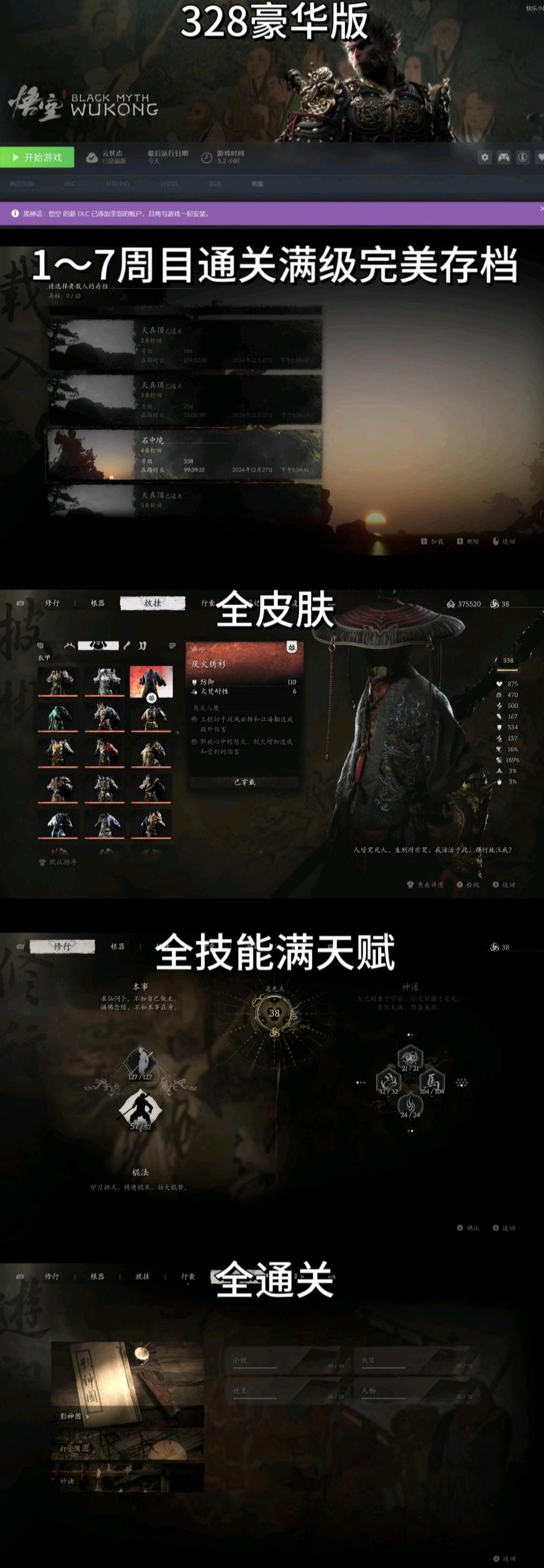 【黑神话悟空328豪华版】1~7周目通关满级全皮肤完美存档。