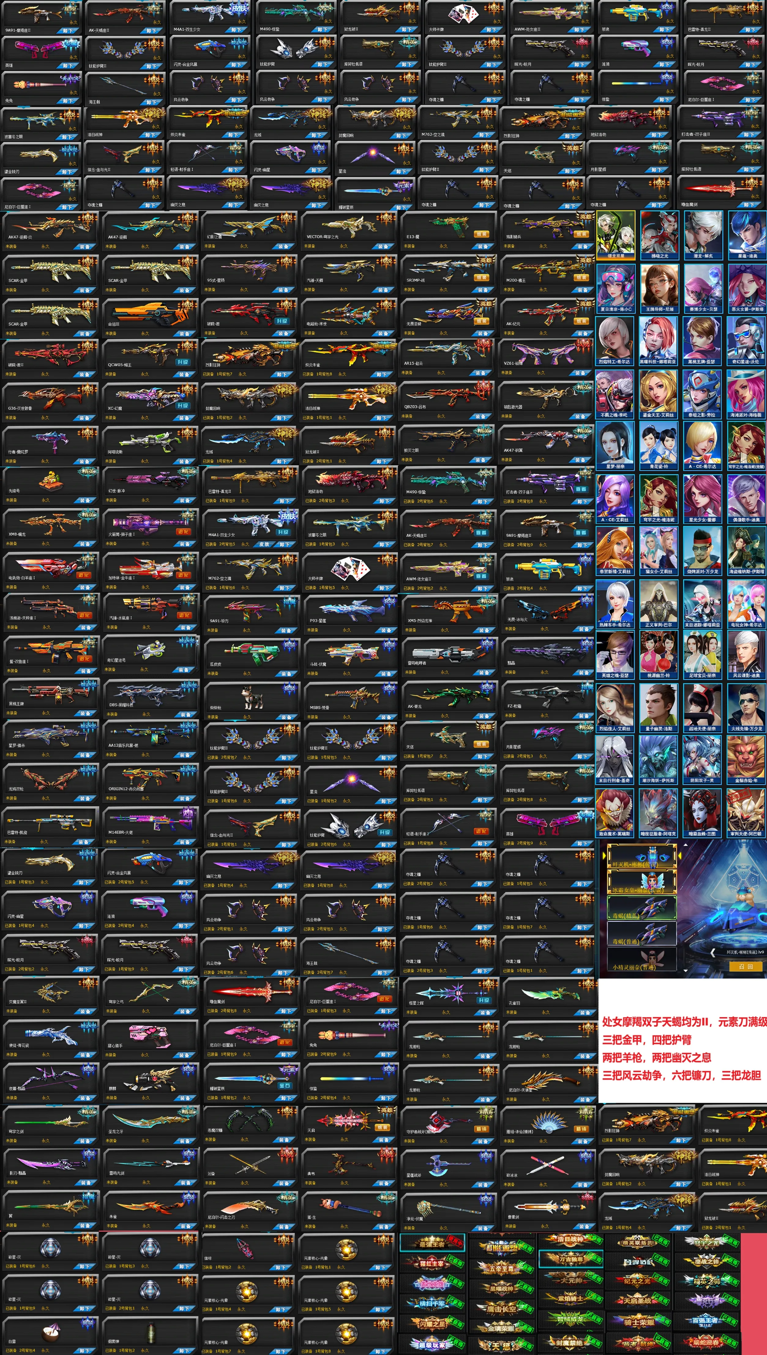 三把金甲,四把护臂,两把羊枪,两把幽灭之息,三把风云劫争,六把镰刀,三把龙胆,烈影狂狮朱雀浩日战神龙域封魔回响,阿喀琉斯曼陀罗蜂王命运幻魔灭世骸骨,破晓君天鳞星陨,地狱浩劫凤舞双生少女卡牌波塞冬空之镜,海滩套全英雄满配,西游套西瓜套星蕴套雷鸣套冰与火套青龙套欺霜星流护臂龙胆兔兔孔雀羽,凛冬,血清
