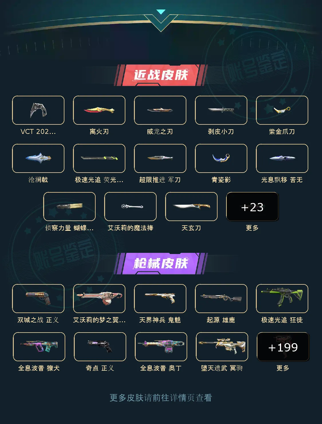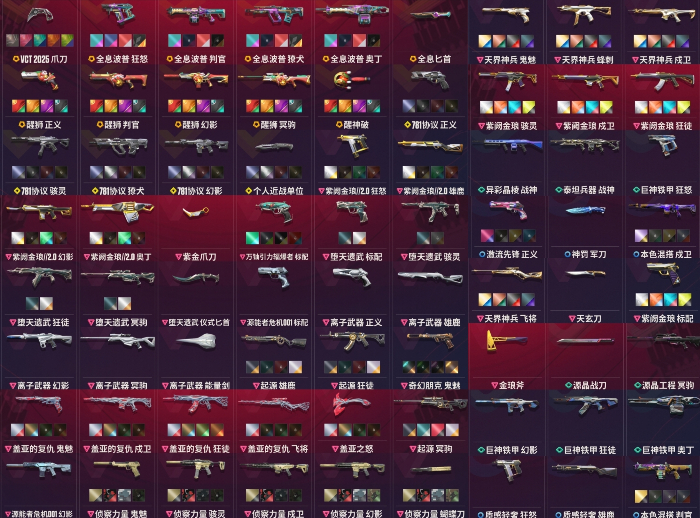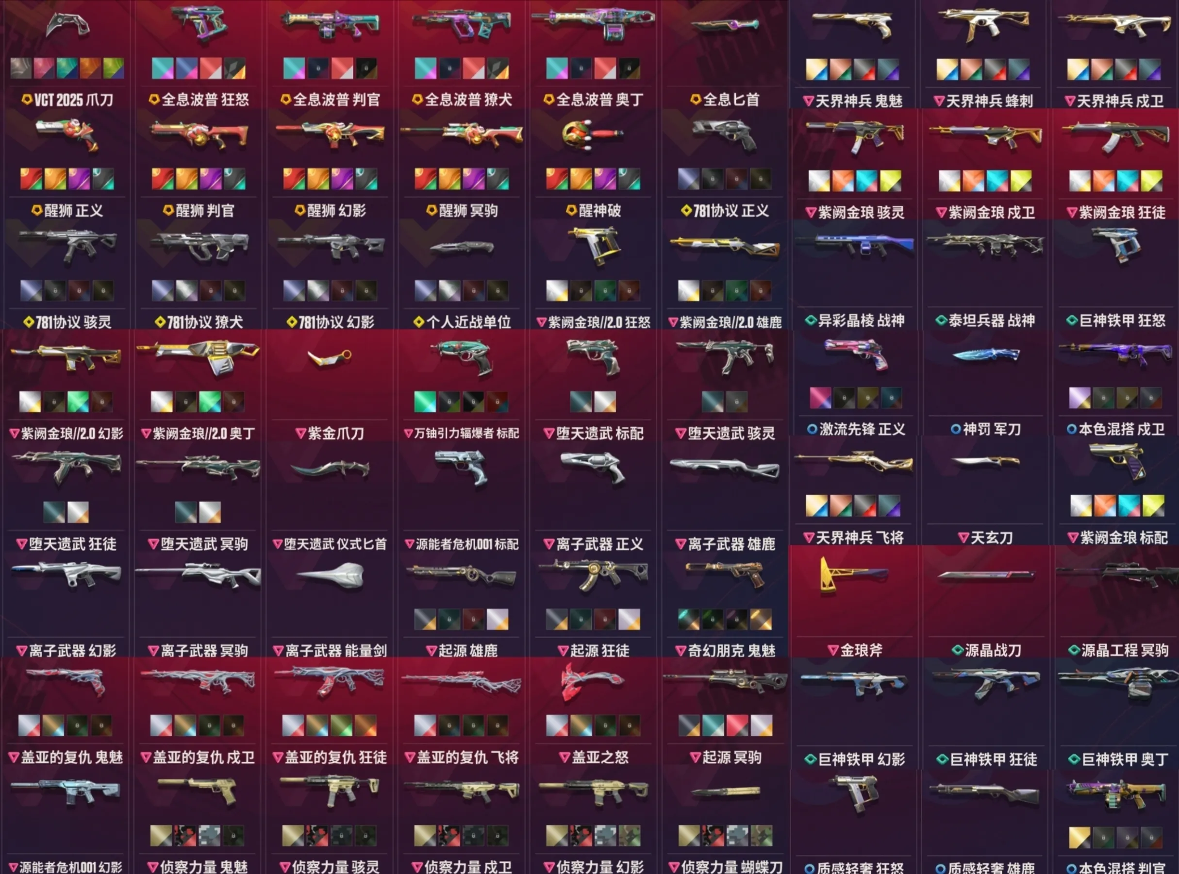 近战武器:离火刃2级紫色/vct2025爪刀满级全炫彩(vct爪刀)/誓约之剑2级虚空/威龙之刃2级银色/光息飘移苦无2级暗闪/灵魂冲击镰刀2级/剥皮小刀2级/艾沃莉的魔法棒2级粉红/青瓷影2级绽棠/狂沙之拥2级/沧澜戟2级深蓝/紫金爪刀2级/起源环刃2级/荧光刀2级/再见安打2级/无畏契约第1卷苦无2级/推进模式前进四2级银蓝/澄湖涟滟2级鱼扇/偃月2级白色/堕天遗武仪式匕首2级/辐爆之杖2级/个人近战单位满级/离子武器能量剑2级/盖亚之怒2级蓝色/全息匕首2级/醒神破2级全炫彩/天玄刀2级/侦察力量蝴蝶刀2级全炫彩(侦察蝴蝶刀)/金琅斧2级/巨神铁甲短剑/神罚军刀(神中神)