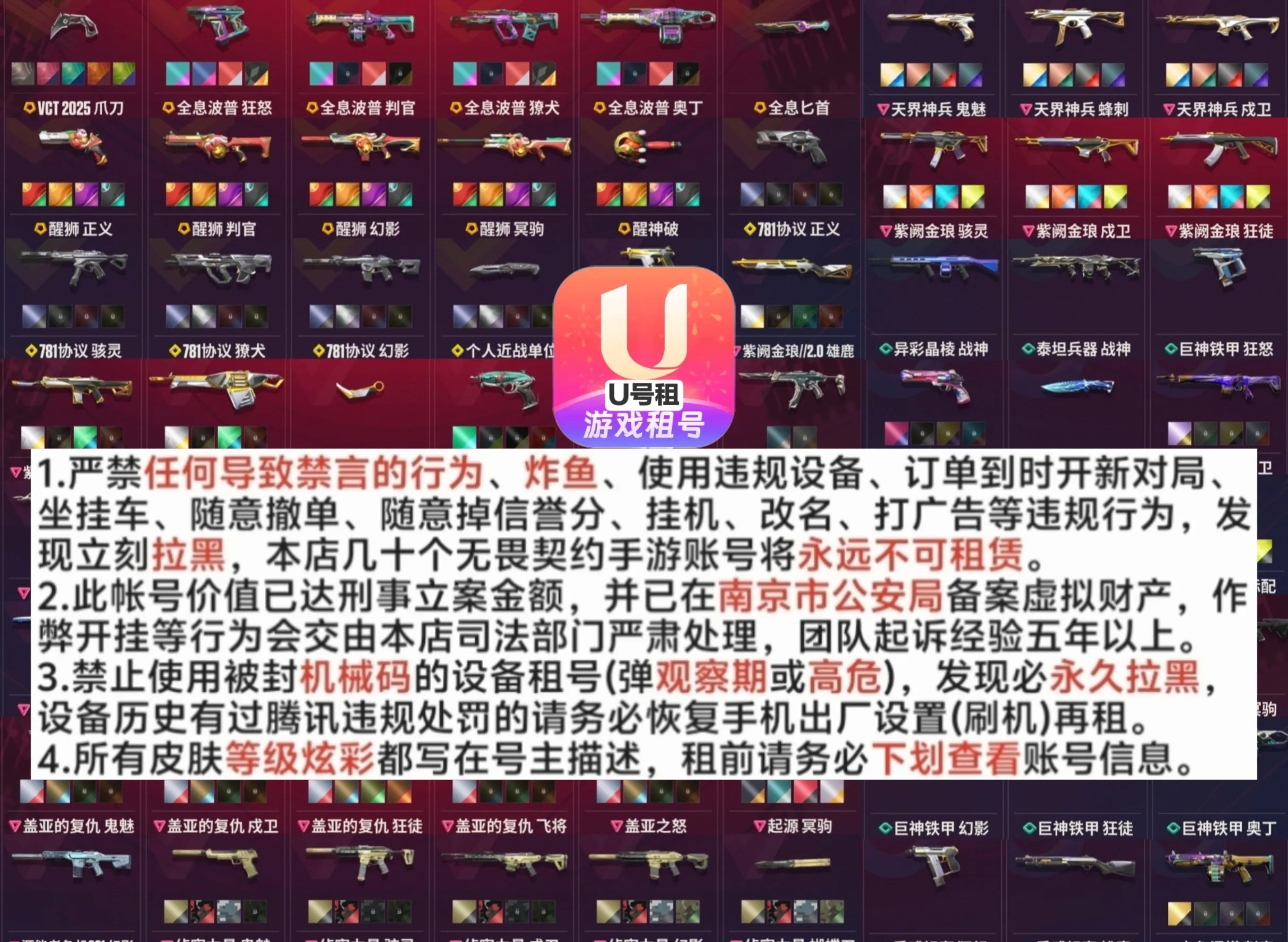 1.严禁任何导致禁言的行为、炸鱼、使用违规设备、订单到时开新对局、坐挂车、随意撤单、随意掉信誉分、挂机、改名、打广告等违规行为,发现立刻拉黑,本店几十个无畏契约手游账号将永远不可租赁。