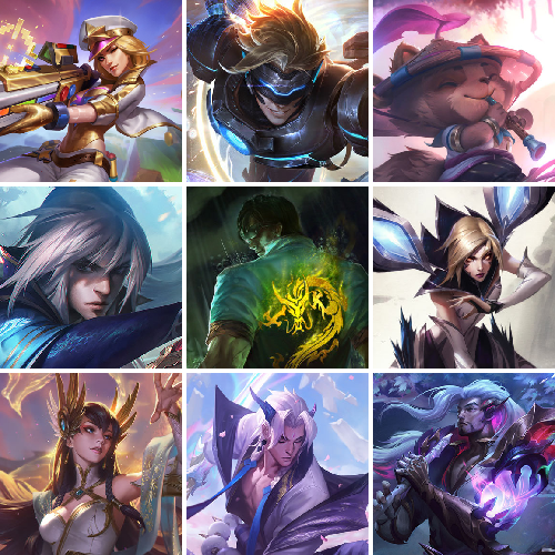 【传说皮肤】偶像歌手阿狸 太空律动猫猫布里和里茨 灌篮高手德莱厄斯 冰霜亚龙希瓦娜 符文战熊沃利贝尔 战斗学院伊泽瑞尔 驯龙学者黑默丁格 泳池派对吉格斯 提莫约德尔人的一大步 枯萎之壤泽拉斯 星之守护者霞 星之守护者洛 恶魔男爵瑞兹 战地机甲厄加特 铁哥们儿奥拉夫 冰霜之刃艾瑞莉娅 钢铁军团盖伦 战地巨兽科加斯 电玩女神娑娜 上古战魂魔腾 暗星女王拉克丝 红色男爵库奇 丧尸布兰德 源计划净化薇恩 最终BOSS维迦 宇航员诺提勒斯 黎明使者永恩 女主播迦娜 钢铁之翼凯尔 光明哨兵格雷福斯 霸天异形卡兹克 冰川巨兽墨菲特 神王盖伦 双重冰晶艾尼维亚 绅士科加斯 源计划联合艾希 屠龙勇士潘森 黑夜使者亚索 腥红之月鬼武姬阿卡丽 蔷薇绅士杰斯 青花瓷伊泽瑞尔 大天使长米迦勒凯尔 黯黑魔龙希瓦娜 焰尾妖狐阿狸 神拳李青 暗星尊烬 律政大亨蒙多 灵魂莲华锤石 合金巨兽努努和威朗普 约德尔国队长提莫 月蚀骑士蕾欧娜 金牌主播德莱文 欧米伽小队幽灵特工 苹果机器人布里茨 真实伤害艾克 地狱之门卫士加里奥 黎明使者锐雯 西部魔影卢锡安 神王德莱厄斯 暗星锤石 神龙尊者圣龙李青 黯晶凤凰艾尼维亚 神龙尊者夜月幻龙亚索 星之守护者拉克丝 奥德赛凯隐 女校长菲奥娜 星之守护者阿狸 第三类接触黑默丁格 地狱行者孙悟空 西部天使艾希 源计划超体莫德凯撒 陆地王者4WD布里茨 星之守护者金克丝 烈焰雄心崔丝塔娜 源计划泯灭雷克顿 银河魔装机神兰博 苍穹之光韦鲁斯 女皇艾希 战场女武神凯尔 天煞劫 源计划林易 源计划毁灭派克 鬼魂新娘莫甘娜 炼狱魔犬内瑟斯 霸天零式赛恩