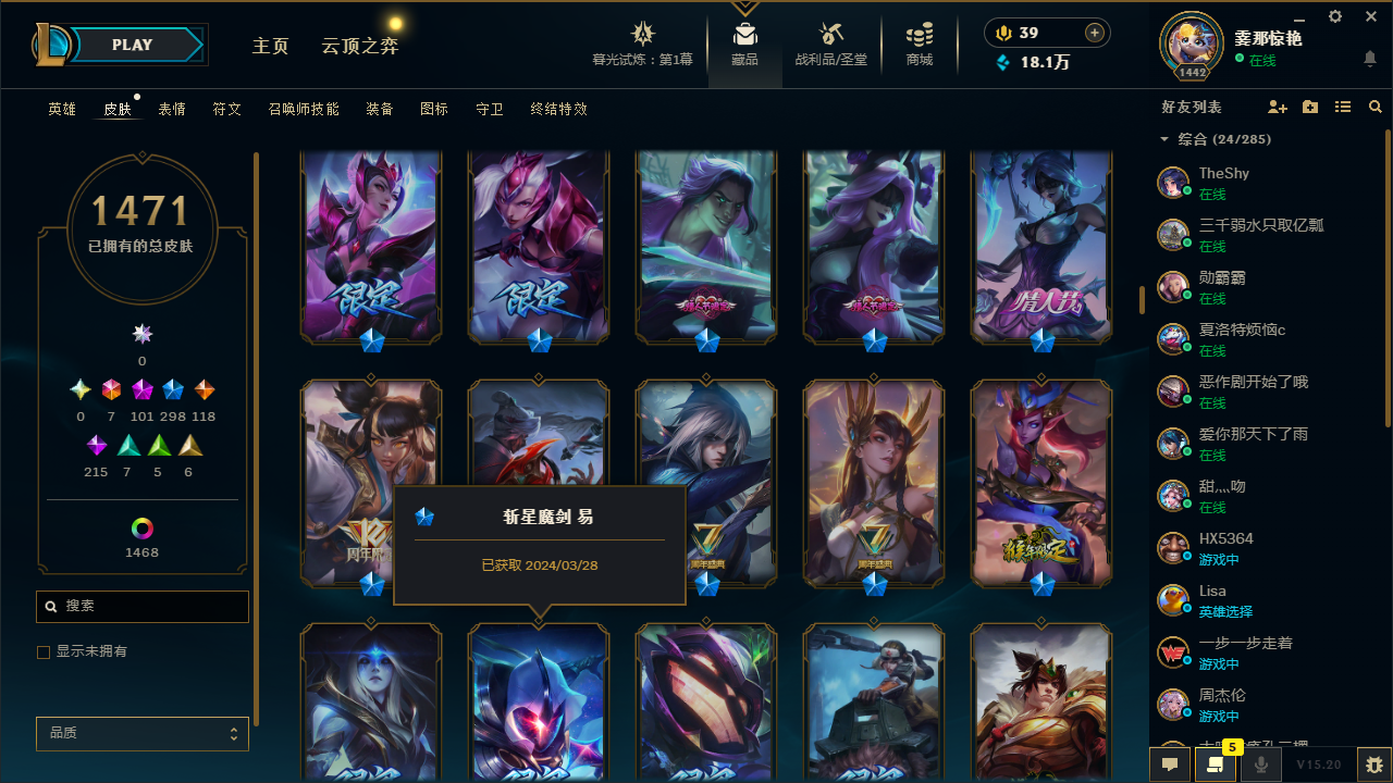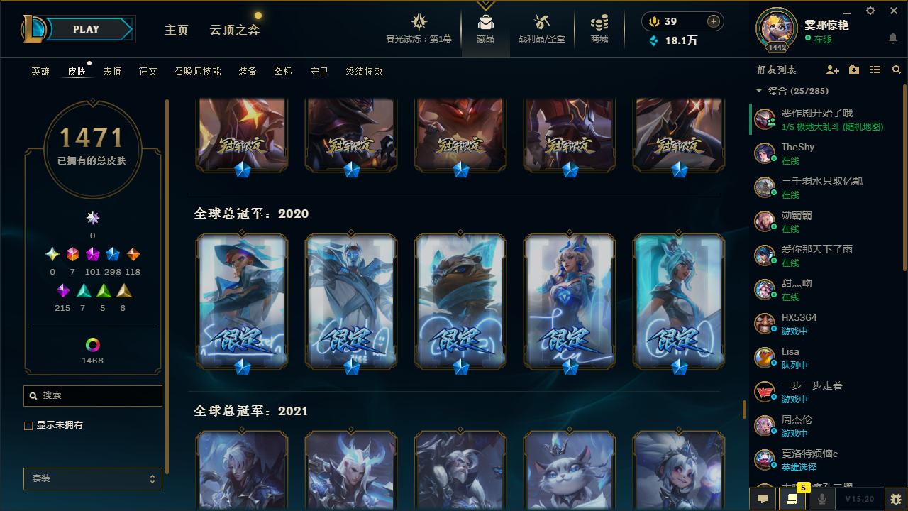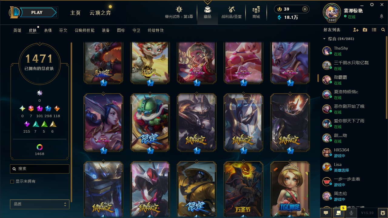 【重要皮肤】战斗学院奇亚娜至臻 黑色玫瑰假面舞会卡特琳娜至臻 暗星女王黛安娜至臻 魔域梦魇泽丽至臻 幻灵狮心蕾欧娜至臻 人工智能悠米至臻 至高天凯尔至臻 西部魔影伊芙琳至臻 青花瓷千珏至臻 天龙之子伊泽瑞尔至臻 神龙尊者比翼之龙洛至臻 玉剑传说琴仙子至臻 斗魂觉醒萨科至臻 墨之影武者亚索至臻 花仙使者卡特琳娜至臻 绝息圣堂厄运小姐至臻 剪纸仙灵希维尔至臻 北极星使者沃里克至臻 海珀利安小队X09星环灵风迦娜至臻 星之守护者辛德拉至臻 海之歌萨勒芬妮至臻 西部魔影猎天使恶魔泰隆至臻 幻灵战斗猫金克丝至臻 青花瓷拉克丝至臻 神凰行者烈羽焰凰霞至臻 女帝黛安娜至臻 战斗学院蕾欧娜至臻 太空律动璐璐至臻 魔女婕拉至臻 魔女乐芙兰至臻 奥术师佐伊至臻 未来战士卢锡安至臻 真实伤害亚索至臻 真实伤害赛娜至臻 星之守护者索拉卡至臻 灵魂莲华提莫至臻 灵能特工伊泽瑞尔至臻 福牛守护者菲奥娜至臻 源计划逆流塞拉斯至臻 源计划阴劫至臻 暗星墨菲特至臻 黑夜使者凯隐至臻 神龙尊者均衡之龙沃利贝尔至臻 飞升战神潘森至臻 KDA二代卡莎至臻 KDA一代卡莎至臻 KDA阿狸至臻 KDA阿狸2022至臻 KDA伊芙琳至臻 KDA阿卡丽至臻 KDA阿卡丽2022至臻 战斗学院拉克丝至臻 烈焰美人薇恩至臻 电玩女神凯特琳至臻 星之守护者妮蔻至臻 源计划正义艾瑞莉娅至臻 真实伤害奇亚娜至臻 真实伤害奇亚娜2022至臻 绒毛菲兹至臻 绒毛菲兹2022至臻 玉剑传说武剑仙至臻 玉剑传说武剑仙2022至臻 腥红之月亚托克斯至臻 腥红之月亚托克斯2022至臻 未来战士锤石至臻 未来战士锤石2022至臻 黑夜使者李青至臻 黑夜使者李青2022至臻 殿堂传奇薇恩 殿堂传奇乐芙兰 水晶巫灵泽拉斯 灰烬骑士莫德凯撒 灰烬骑士派克 海克斯科技安妮 海克斯科技瑟庄妮 海克斯科技雷克顿 海克斯科技斯维因 海克斯科技吉格斯 海克斯科技玛尔扎哈 海克斯科技波比 海克斯科技嘉文四世 海克斯科技阿木木 海克斯科技拉莫斯 海克斯科技魔腾 海克斯科技崔丝塔娜 新卧虎藏龙贾克斯 水晶掠夺者卡兹克 水晶圣骑艾希 永恒之森奥恩 暗星科加斯 光明哨兵奥拉夫 黎明使者卡尔玛 恐惧新星德莱厄斯 零之枪骑赫卡里姆 摄魂使者薇恩 新创战纪希维尔 青年瑞兹 胜利剑圣易 胜利女神娑娜 胜利巨口克格莫 舞会公主安妮 战熊骑士瑟庄妮 创星之灵璐璐 荣誉使者玛尔扎哈 养蜂人辛吉德 勇敢的心德莱厄斯 电玩女神厄运小姐 电玩勇者锐雯 电玩女神阿狸 星之守护者伊泽瑞尔 玉剑传说无影 玉剑传说舞剑仙 神凰行者幽羽玄凰萨勒芬妮 神凰行者烈羽焰凰霞 海珀利安小队Z01猎户座卢锡安 玉剑传说神机花火 玉剑传说无劫 星之守护者佐伊 灵能特工易 黎明使者薇恩 点心宝贝阿木木 龙的传人李青 银龙裁决泰隆 天龙之子斯莫德 猛虎下山赵信 替父从军花木兰 神龙烈焰金克丝 碧玉之牙卡西奥佩娅 古琴余韵娑娜 春晖神女拉克丝 你看见过我的熊猫吗安妮 北辰之威内瑟斯 南天之怒沃里克 美猴王孙悟空 定海神珍孙悟空 玉净夜叉凯特琳 紫金罗刹莫甘娜 广寒仙子嫦娥 虎痴之拳蔚 张辽文远 司马懿仲达 金猪烈焰瑟庄妮 烈焰美人薇恩 纳财大帝塔姆 神龙之翼库奇 征服者贾克斯 王国机神青龙德莱文 王国机神朱雀蕾欧娜 王国机神苍狼瑟提 王国机神白虎贾克斯 王国机神玄武盖伦 福牛守护者安妮 福牛守护者厄斐琉斯 福牛守护者德莱厄斯 福牛守护者阿利斯塔 福牛守护者嘉文四世 福牛守护者菲奥娜 胜利机器人布里茨 胜利女神奥莉安娜 胜利枪神卢锡安 胜利之剑亚托克斯 怦然心动凯特琳 意乱情迷蔚 黯然心伤阿木木 水晶玫瑰阿克尚 水晶玫瑰迦娜 幽梦玫瑰伊莉丝 碎心之拳蔚 甜心之羽霞 甜心之翎洛 甜心宝贝安妮 甜心宝贝娑娜 穿心之剑菲奥娜 觅心游侠卢锡安 觅心魔灵奥莉安娜 觅心女王艾希 觅心之翼奎因 觅心萝莉金克丝 觅心猫猫悠米 觅心猎手薇恩 幽梦玫瑰辛德拉 幽梦玫瑰泰隆 水晶玫瑰婕拉 水晶玫瑰斯维因 双城之战2微光实验室辛吉德 北极星神赛娜 北极星守望者佐伊 北极星圣贤基兰 北极星使者沃里克 冬境仙灵索拉卡 寒冬精灵璐璐 冬季仙境奥莉安娜 雪球也能爆炸吉格斯 圣诞捣蛋鬼金克丝 圣诞老人布隆 圣诞老人德莱文 冰雪驯鹿波比 冰雪风暴希维尔 冬季仙境卡尔玛 持胡萝卜的雪人易 狂心冰王图奇 冰封王子蒙多 冰雪女神辛德拉 魄罗骑士瑟庄妮 夺命美人卡特琳娜 平安夜女神娑娜 圣诞糖果棒厄运小姐 魅惑女巫卡西奥佩娅 魅惑女巫乐芙兰 魅惑女巫迦娜 魅惑女巫厄运小姐 魅惑女巫莫甘娜 魅惑女巫崔丝塔娜 魅惑女巫奈德丽 魅惑女巫伊莉丝 伯爵卡萨丁 大魔法锅布里茨 大魔王提莫 死亡誓约卡特琳娜 死亡誓约劫 死亡誓约维克托 灵魂收割者索拉卡 克烈古拉伯爵 小恶魔菲兹 南瓜头王子阿木木 海之歌艾希 海之歌奈德丽 海之歌萨勒芬妮 海之歌泽丽 泳池派对凯特琳 泳池派对佐伊 泳池派对普朗克 泳池派对辛德拉 泳池派对奥莉安娜 泳池派对嘉文四世 泳池派对黑默丁格 泳池派对塔莉垭 泳池派对厄运小姐 泳池派对塔里克 泳池派对菲奥娜 泳池派对格雷福斯 泳池派对李青 泳池派对蕾欧娜 泳池派对雷克顿 泳池派对瑟提 泳池派对布隆 电玩战魂赫卡里姆 斩星魔剑易 御星魔矢艾希 送披萨的小姐姐希维尔 鸡里奥 克格汪 制胜金靴李青 制胜金球拉莫斯 DRX亚托克斯 
