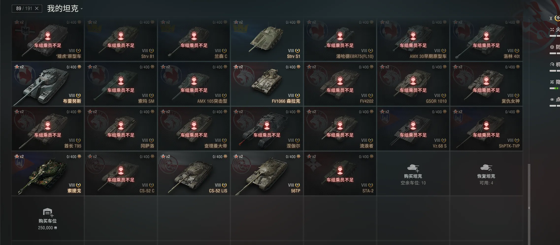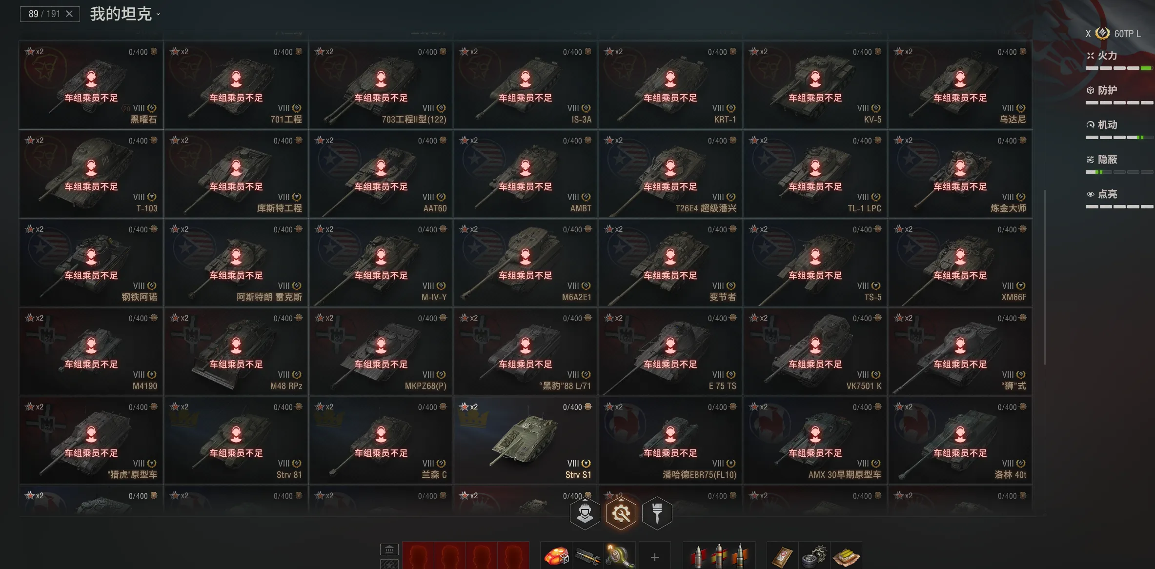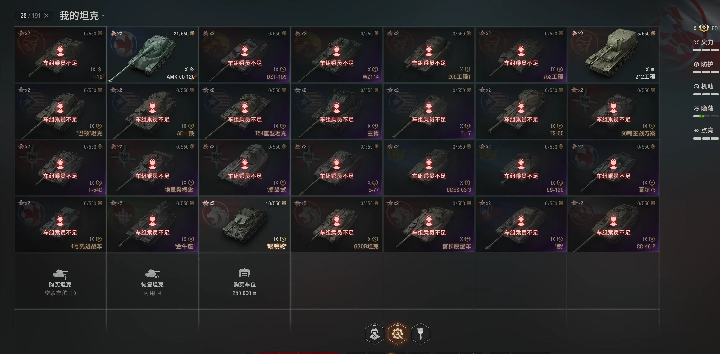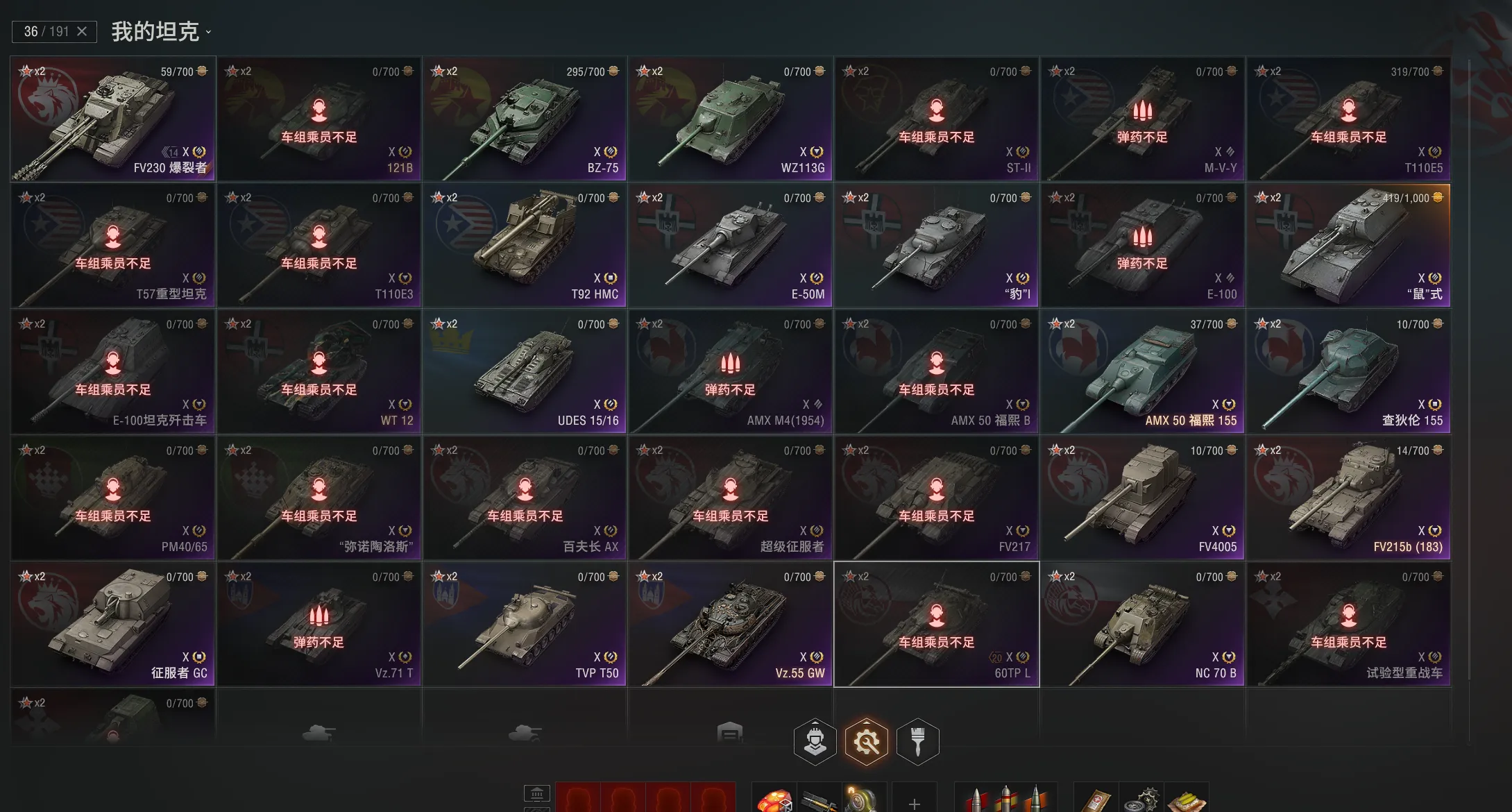 注意事项:1,进入游戏后,如果车辆情况不符。那是因为前面的玩家筛选了自己玩的坦克,其他的隐藏了。坦克显示栏,左下角小坦克标志,点进去把所有系别和级别选上,坦克就全部出来了。