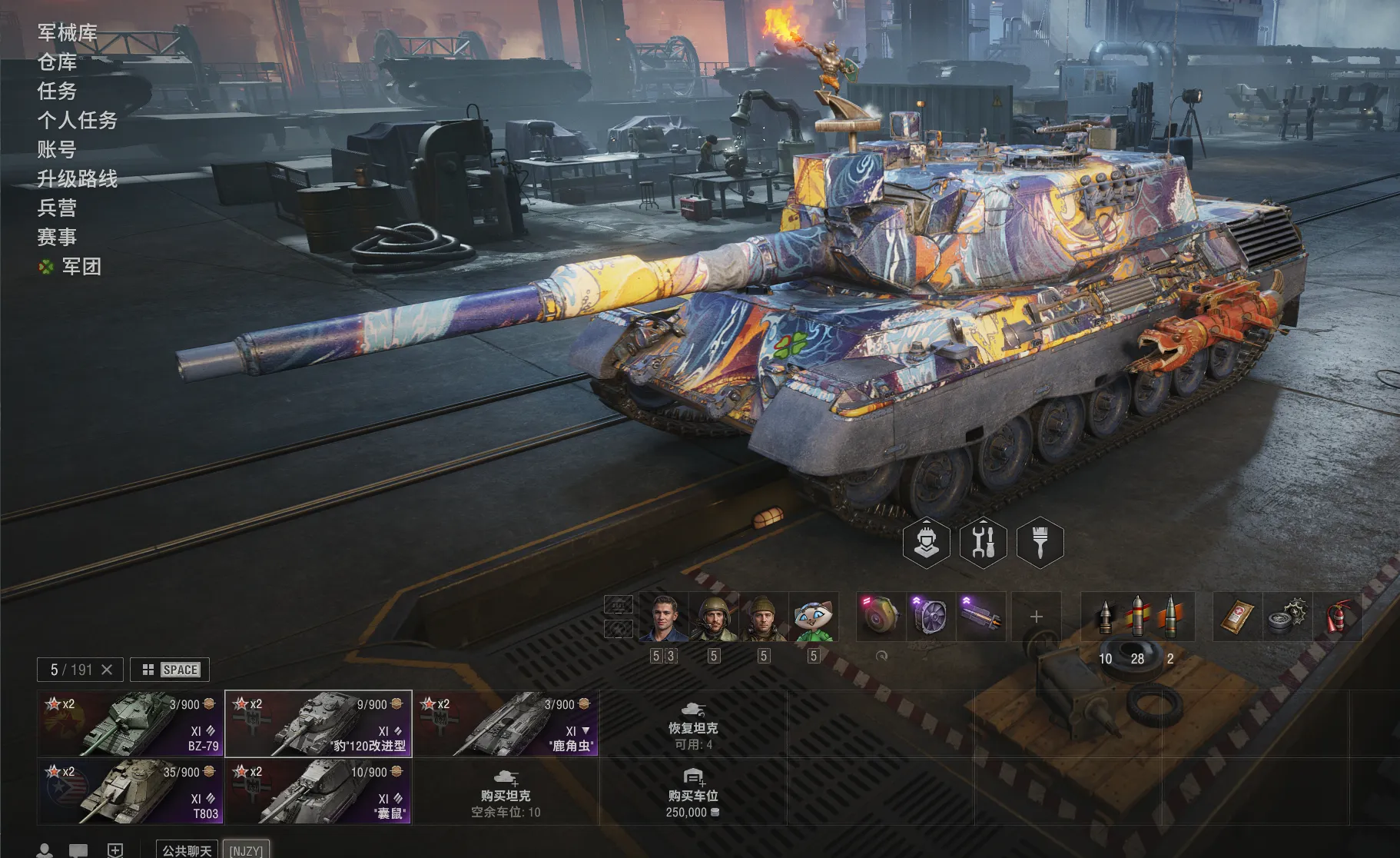 11级5台:BZ-79,T803,囊鼠,豹120,鹿角虫。10级:白云哥特。25个9金。87个8金