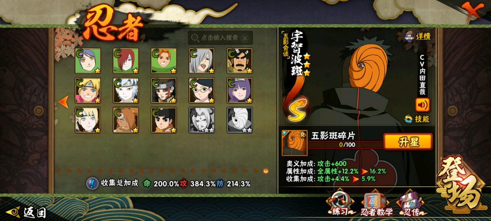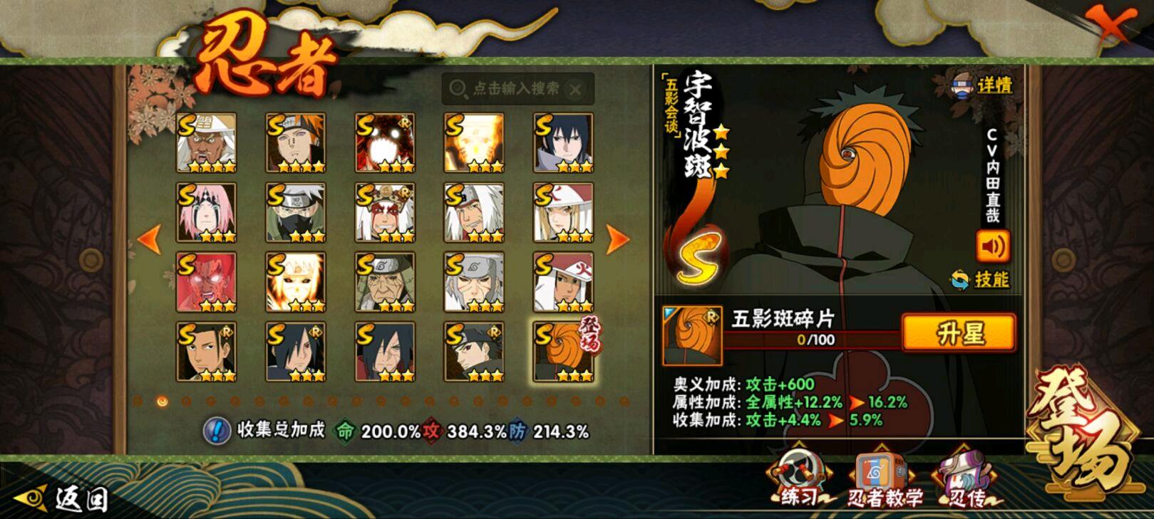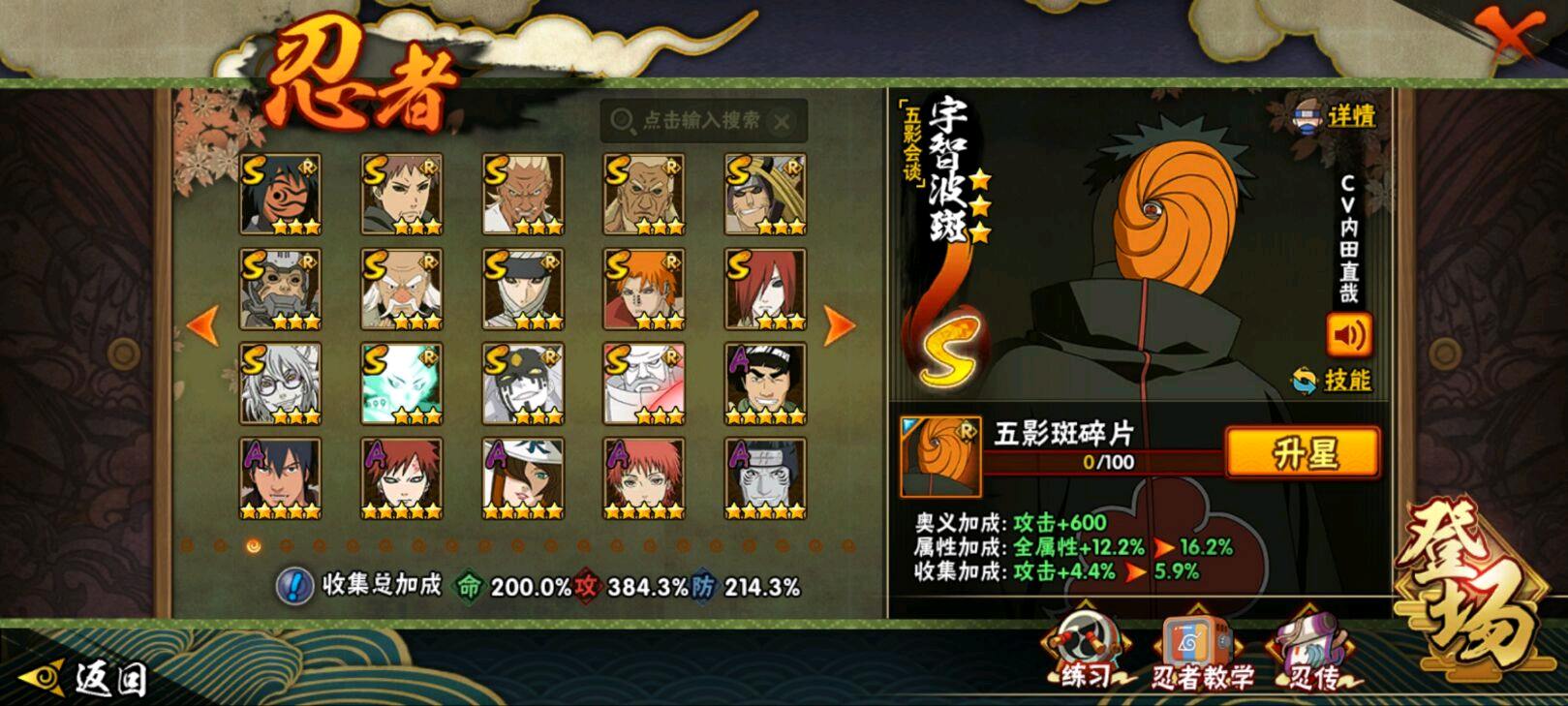 54S 105A 414忍者 宇智波带土「暴怒」/干柿鬼鲛「鲛肌融合」/宇智波佐助「疾风传咒印」/迈特凯「忍界大战」/宇智波带土「忍界大战」/宇智波斑「木叶创立」/佩恩·天道「超」