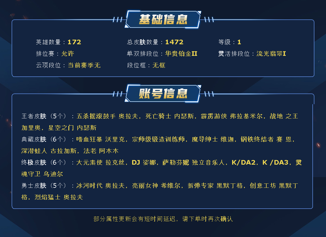 ~~喜欢记得收藏~~可排位~~1472皮全英雄~~租之前尽量查一下游戏ID,确保段位是您需要的,避免浪费您的时间~~请勿挂机逃跑故意送人头,谢谢合作,谢谢~~