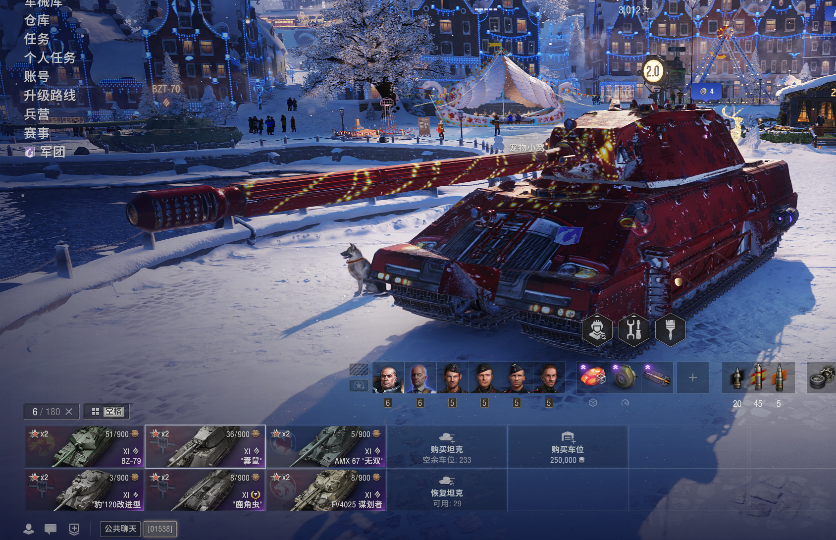 11级6台:无双,BZ-79,囊鼠,谋划者,鹿角虫,豹120。10级59台,10金11台:酋一万,白云(E-100 WT),MBT-B,格里芬,114sp,BZ-72-1,cc 狮,780,268V型,T22,183,伏羲155。9金21台:埃里希概念,cc-46p,维钦托利,50吨主战,TS-60,752,E77,udes033,VCS6X6,熊,眼镜蛇等。8金43台:BZ-176等。带1000多天高级账号,70多个红紫和3级橙装。