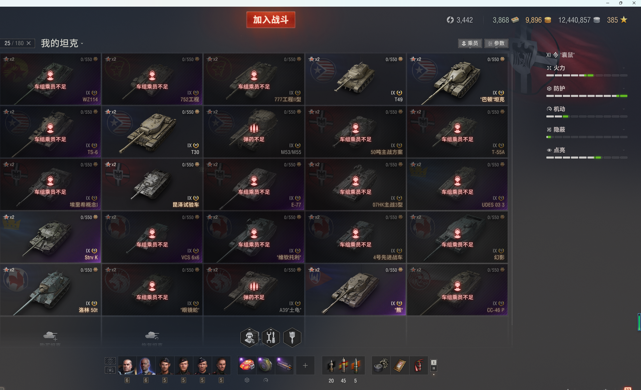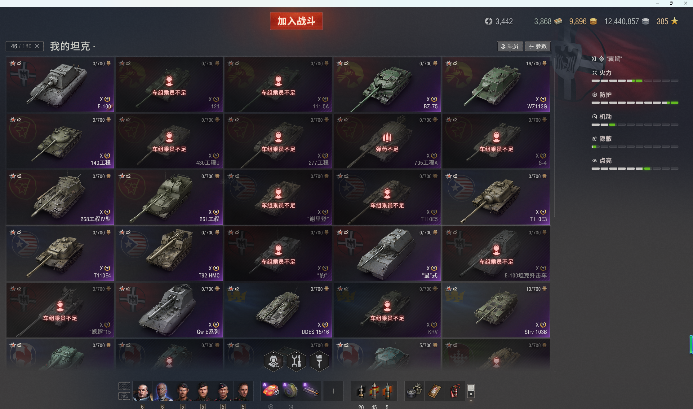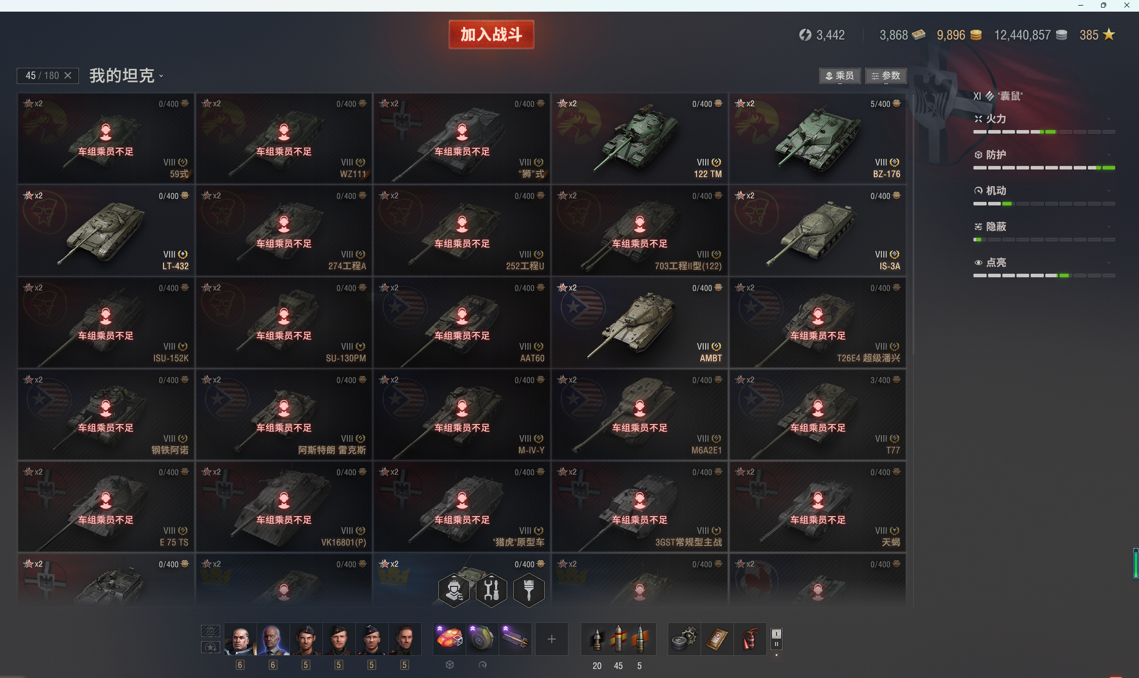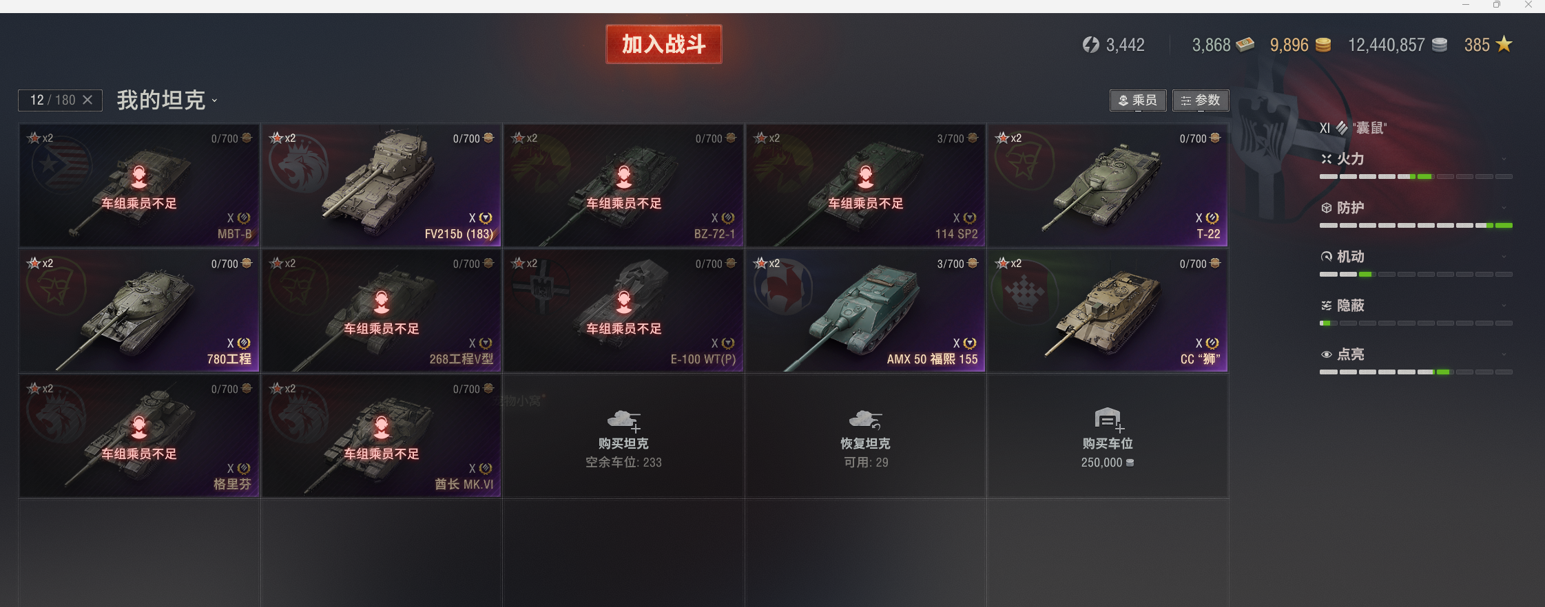注意事项:1,进入游戏后,如果车辆情况不符。那是因为前面的玩家筛选了自己玩的坦克,其他的隐藏了。坦克显示栏,左下角小坦克标志,点进去把所有系别和级别选上,坦克就全部出来了。