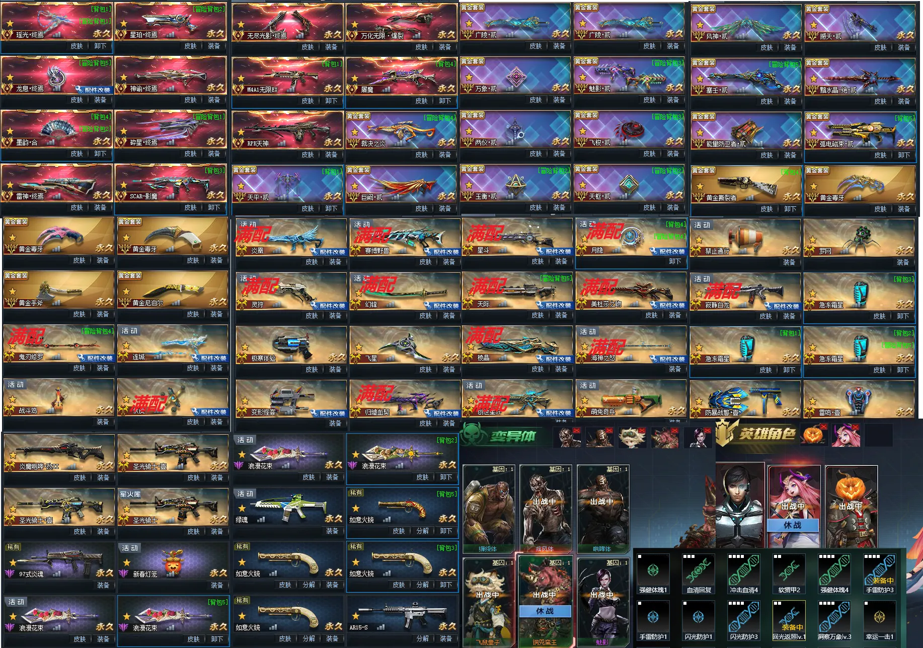 极寒体验 变形怪客 飞星 禁止通行 三个急冻霜星 防爆战警壹 圣光骑士(虎啸排名327排名611各一 ) 97式炎魂 四把浪漫花束 四把火铳(衔尾蛇排名371排名418) 满配件武器(鬼刃修罗 伏虎 炎凰 灵狩 幻锋 归墟血契 星斗 月隐 天际 美杜莎之吻 海神之怒 寂静白龙 )角色 (秦月 幻影 盖姬 瑞秋 青龙 腾龙 月婵 西娅 辛蒂 龙女 小乔 六臂魔童 小红帽 炽霞)角色天赋有 防雷三 防闪三 回光返照