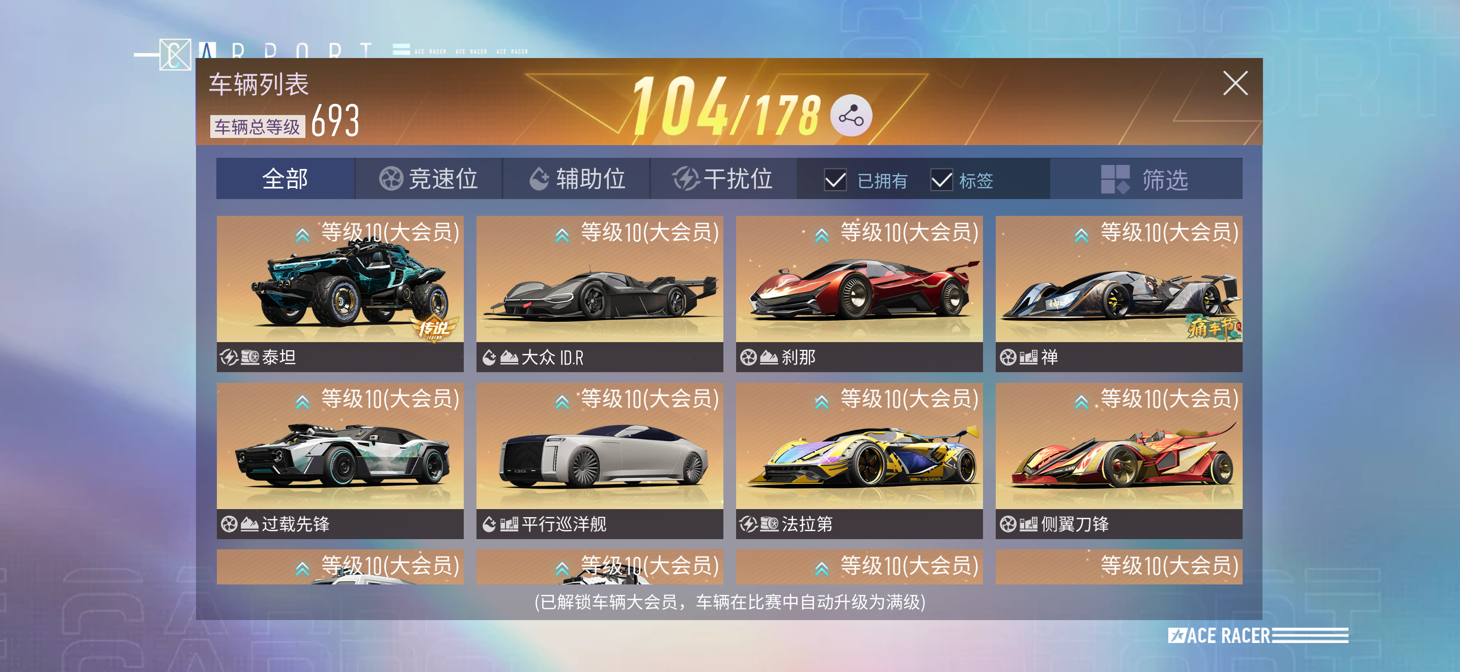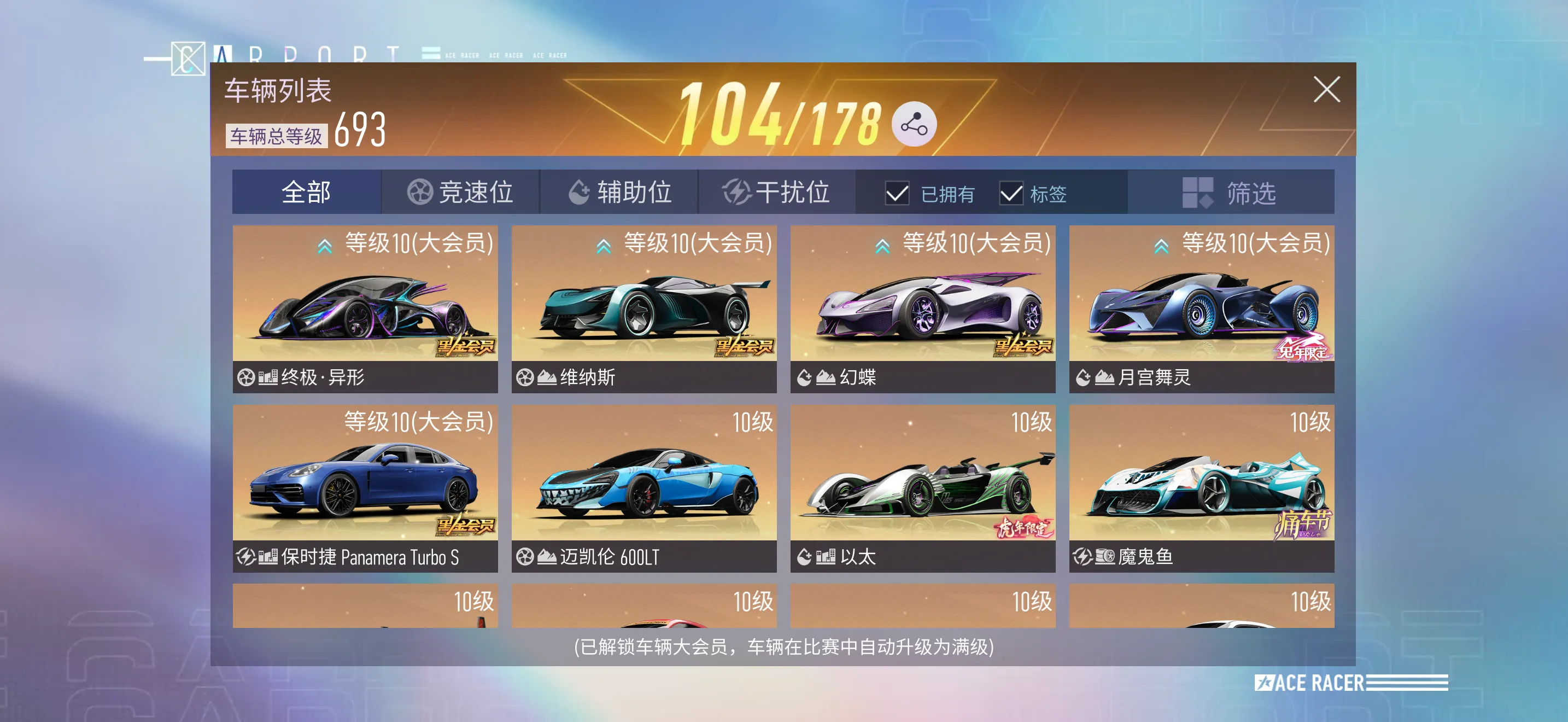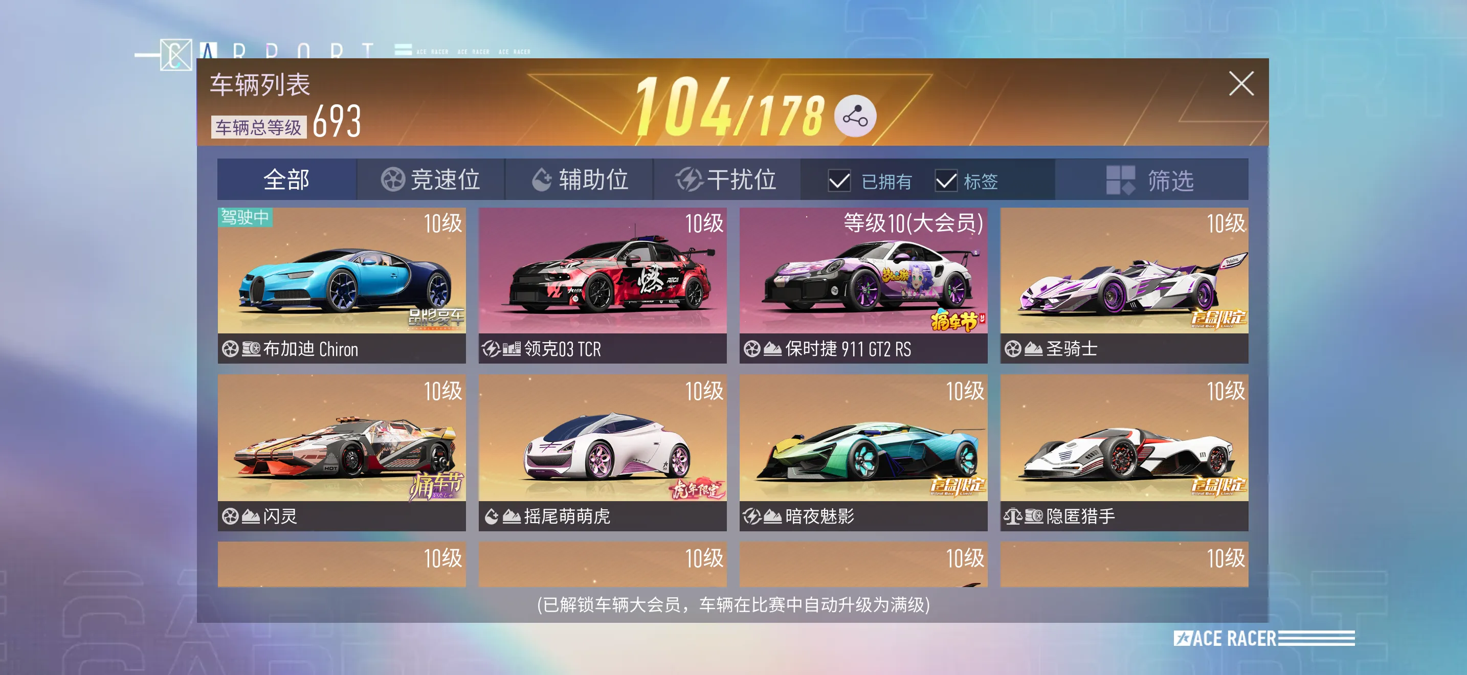 共有104辆赛车 金色品质赛车有77辆,金色品质赛车皮肤有20个以及两个红色品质赛车。