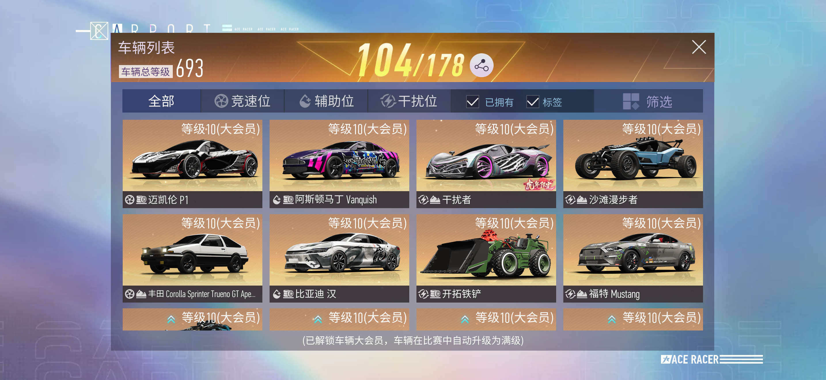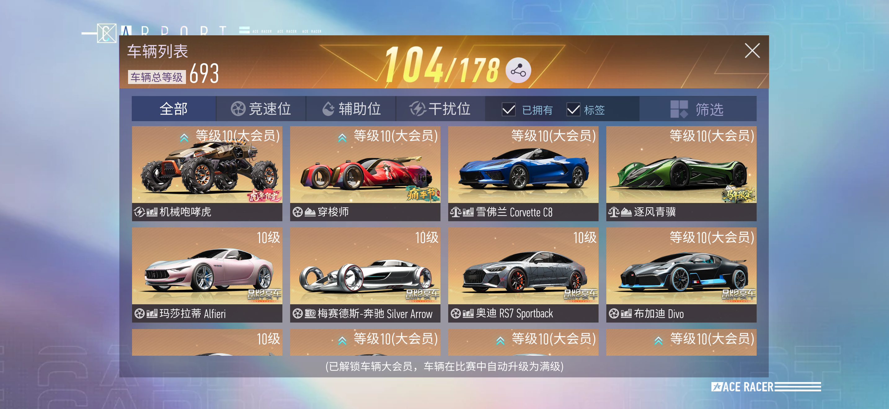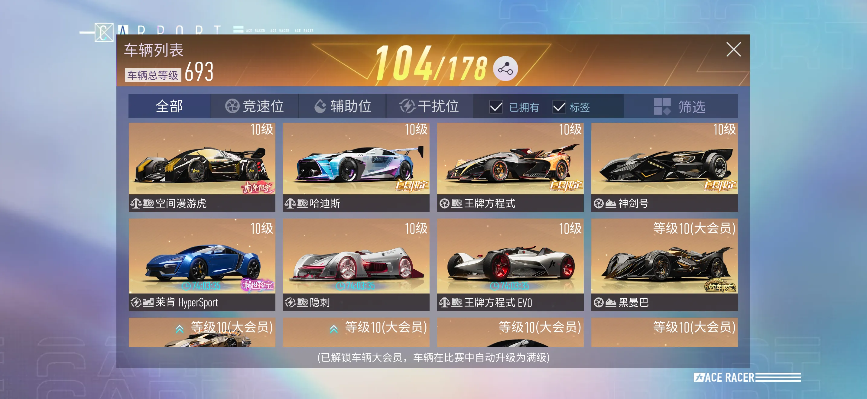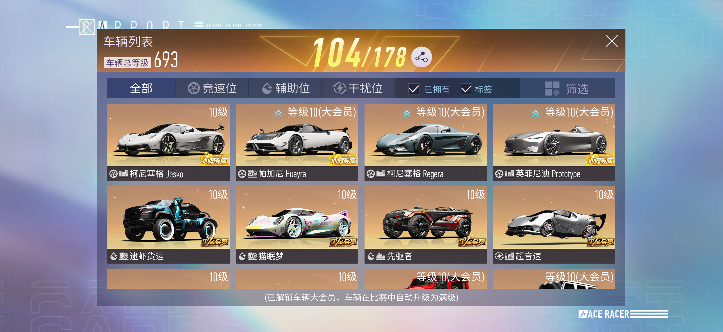 共有104辆赛车 金色品质赛车有77辆,金色品质赛车皮肤有20个以及两个红色品质赛车。