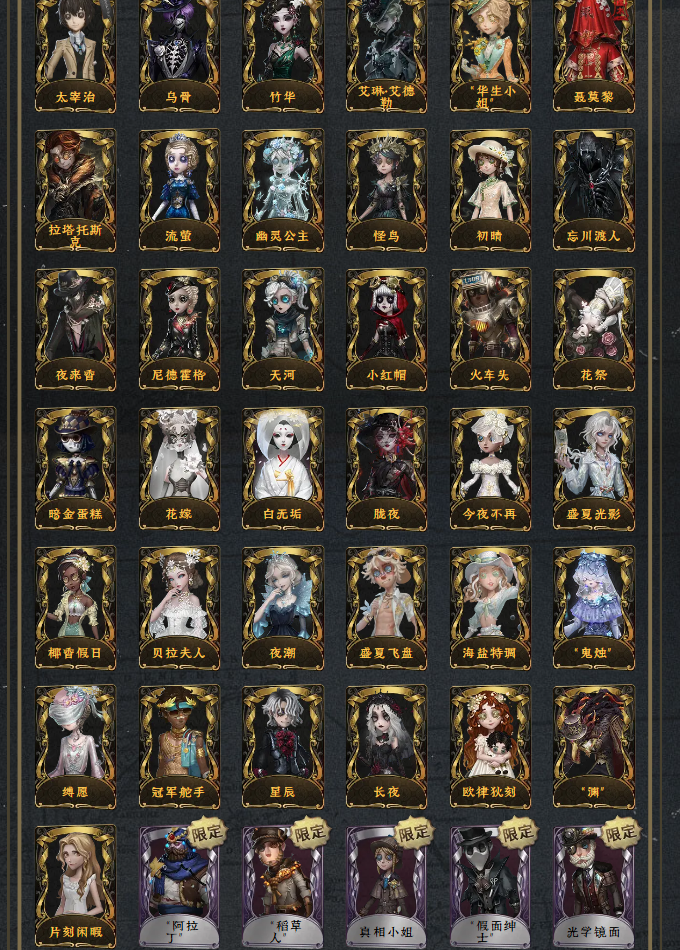 稀世71奇珍26640稀世1奇珍13292稀世42奇珍80角色数80涂鸦715头像582头像框244等待动作198个性动作363追击音乐18归宿分49.2万希望的残像蜃景司药舞狮宇宙女巫邪眼寄主翦烛寒香舞十三娘惊鸿“宿命”当铺老板赤宴破碎的芙拉吉尔溯光恒梦恶之源石榴碟小姐怒火白泽温泉煮酒典狱长陨星红骑士采风的仙灵于此岸赴宴记忆的沉疴川上富江雨宫莲JOKER明智吾郎伊莎贝拉永夜极光B.Duck中岛敦中原中也太宰治乌骨竹华艾琳·艾德勒“华生小姐”聂莫黎拉塔托斯克流萤幽灵公主怪鸟初晴忘川渡人夜来香尼德霍格天河小红帽火车头花祭暗金蛋糕花嫁白无垢胧夜今夜不再盛夏光影椰香假日贝拉夫人夜潮盛夏飞盘海盐特调“鬼烛”缚愿冠军舵手星辰长夜欧律狄刻“渊”片刻闲暇“阿拉丁”“稻草人”真相小姐“假面绅士”光学镜面"锁芯"音波麒麟商人“绯”时之砂“黯”双一十字路口的美少年奥村春NOIR新岛真QUEEN佐仓双叶NAVI高卷杏PANTHER坂本龙司喜多川祐介芳泽霞熊猫保育员恸哭秘密大厨咫尺微光剪刀手爱德华不速之客金人偶师恶之花教鞭嬉命人雨中曲兰闺惊梦达克斯上校琼楼遗恨咫尺天涯罗生门撒玛拉红菱艳独行者斯嘉丽朱丽叶桃乐丝树形背景板暮辞朝归运筹等风来刻律涅之伤发明家梵音之舞沉眠的兔先生海女巫《卡门》猩红新娘牛仔-船影雪上小王子窃梦行者雪原猎人逐浪的玫瑰蛋壳先生潘塔龙壁画修复员善忘的海马体多色印刷浴石商人溃夜猎者艾玛冬吉尔达皮塔拉托里雷痊愈更纱宿醉应许之日霓虹先锋花边新闻海盗电台报纸怪客放映厅布朗熊莎莉可妮兔蛙里奥B.Duck潮BuffyRice正位审判锦中鳞逆位审判蜀中客程小时&陆光认知启迪师滚滚伙伴江户川乱步提炼师女大公纸翼小姐Lady KChef KMentor K九月摩诺蛋小黄的好朋友OPH.QI异动指针“伊始新篇”艺术品商人梅爱丽陶梦嫣赞因掌中篆记“巡于归途”苍白冠冕不羁欢歌玉糖春吐宝鼠兔爷亚瑟王“驯服”不死护卫女仆装光天使炽天使往昔永生花银锑白兔先生兰斯洛特领头羊鎏金的表演大师罗刹绯春郁金香之梦蒸汽朋克阿努比斯圣诞狂鹿蓝调阿拉丁梅林白胡子文学教授爱丽丝警醒的龟先生考古教授弹簧手感染思明白鹰之舞白纹大触怀古黑天鹅之羽“苏珊娜”诡笑症Re-Swim归来者“月佑者”香薰流离的月光慵懒的兔先生水球救生水晶烛台聚光灯下甜心蛋糕绿孔雀紫孔雀仙鹤彼岸祈雨之女硫火融化的泪琥珀波塞冬寄生之面衣帽架先生安魂曲箭竹阴阳司公桃面书生神圣之辉梦之使者“厄运”冰中蝶笼中之蝶致命温柔逆刃之鞭月下绅士暮剑“琥珀”月相历战猎人鸩纯白之盐无芯纸皇后红龙夫人缄默者噩之牙祝祷噬恶之渊伊万最后一舞宝钻女爵骨笛狰鼹鼠先生雀舌迷途诗人矿业董事妄念的陈伤弄臣青须的公爵可可豆ACE狡罗勒黑玫瑰女高音“宴舞”校对人西部大亨蓝釉先生琴键秋日随想校监夫人荒野女巫列车长奶酪冬蝉人造天堂动植物学教授“玛利亚”动物女巫球球沙滩漂移长生藏玛吉努天使向导湖中影迷迭香破魔之刃审判之翎莱拉神圣阿斯莫年岁淋浴大师牌无归的昨日澄明的理性暮影烟花盖伊灵蛇熄灭的太阳删除符圣洁墨韵吟游诗人飞行家-异相睡眠拂晓女士行于界限间“有机磷”茶歇小姐隐于夜色中囚星图鉴内容来源于游戏数据